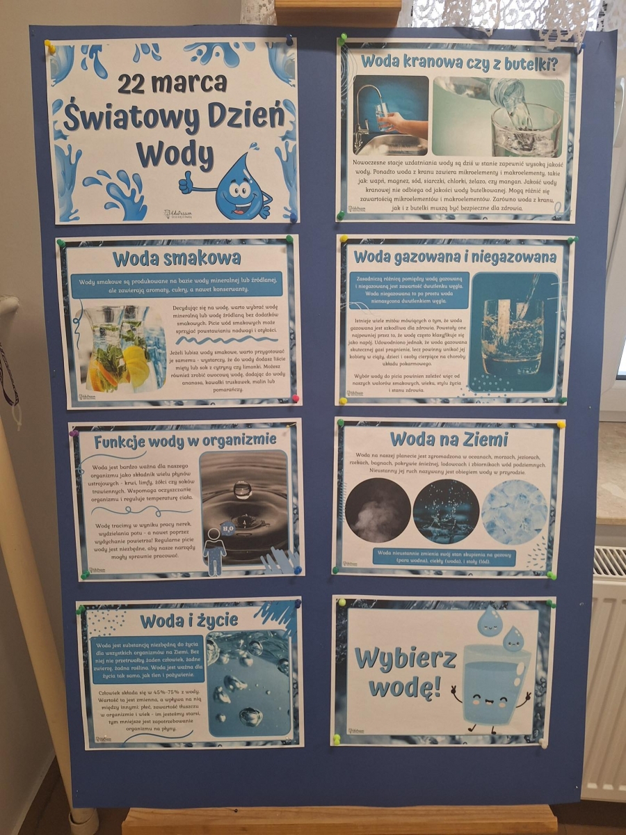 W dniu 21 marca obchodziliśmy w naszej szkole Światowy Dzień Wody, który został ustanowiony przez Organizację Narodów Zjednoczonych. Ta ogólnoświatowa akcja ma zwrócić uwagę ludzi na niewielkie zasoby wody pitnej, które posiadamy i co za tym idzie, konieczność dbania o nie.