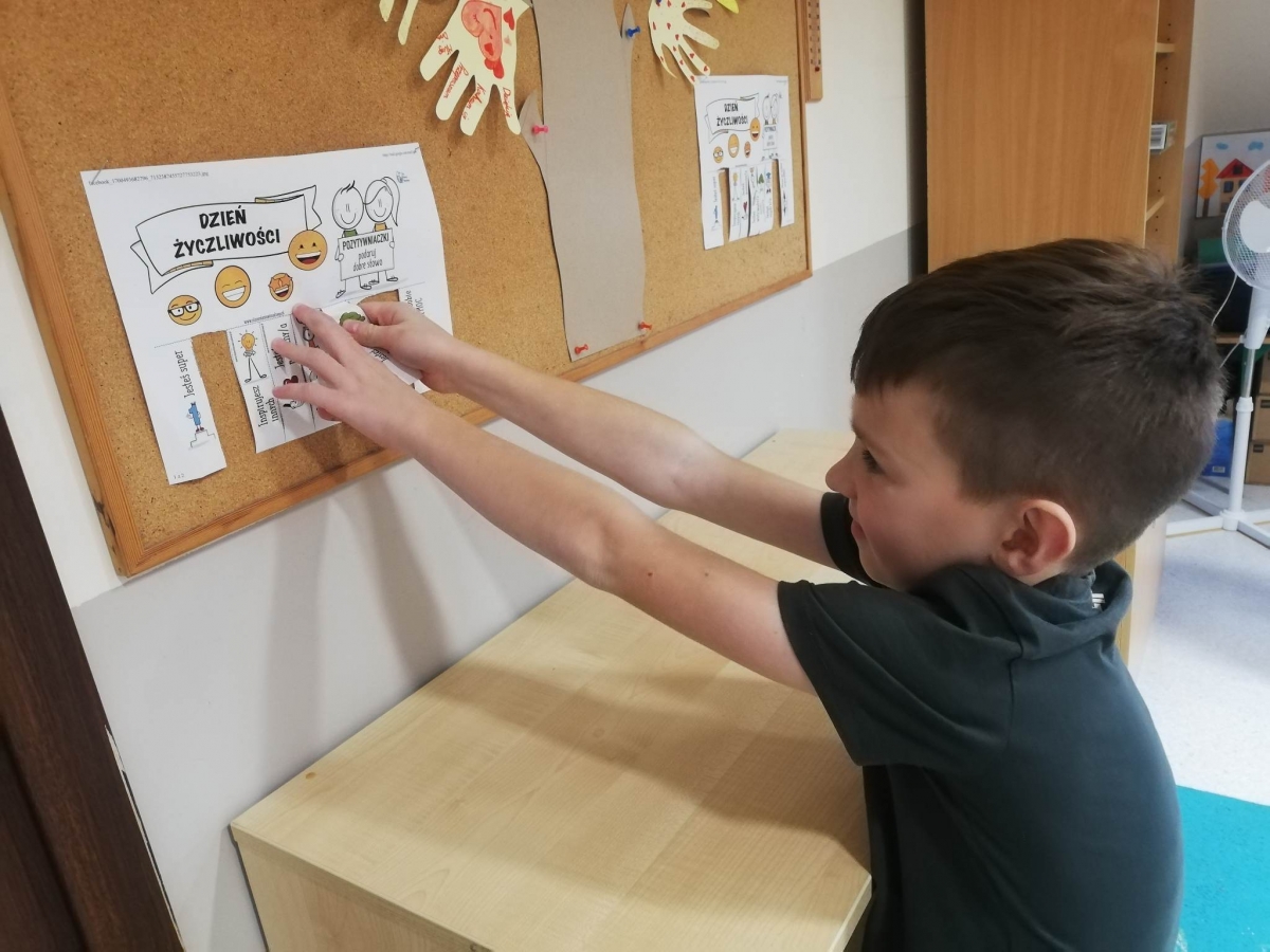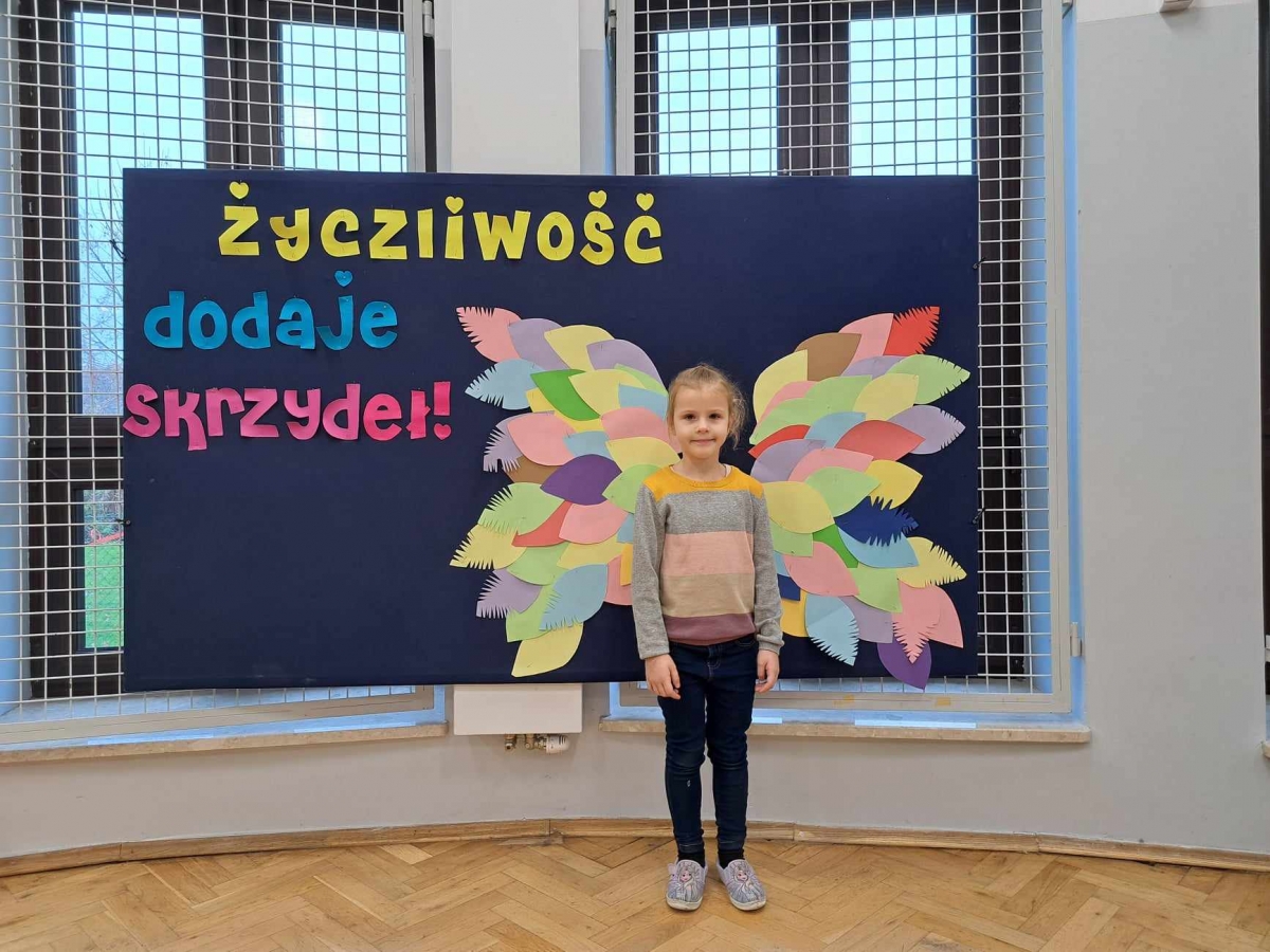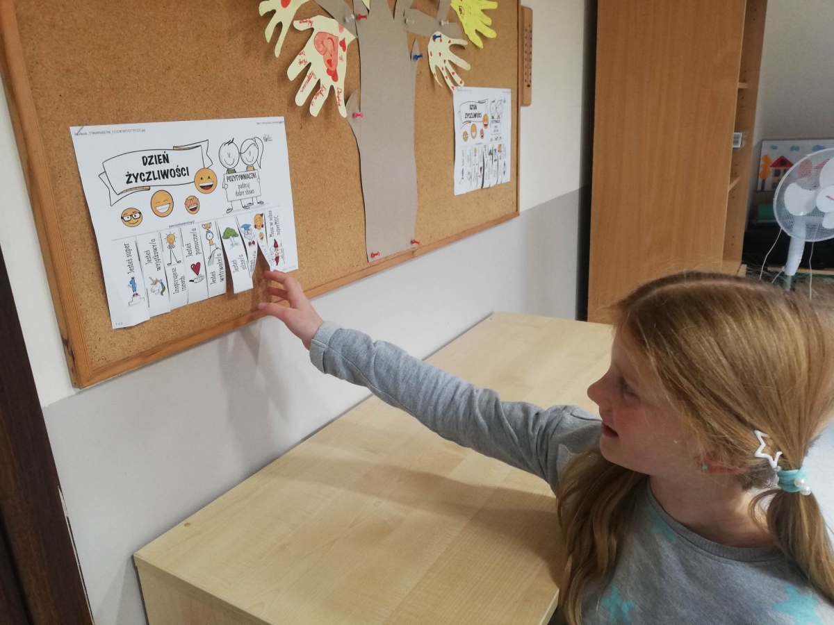 Na świetlicy uczniowie wykonali drzewo życzliwości, na którym pojawiły się nietypowe liście. Na każdym z nich pojawiło się mnóstwo życzliwych słów. Natomiast dzieci z oddziału przedszkolnego "Mądre sówki" odwiedziły innych uczniów i nauczycieli życząc im "Miłego dnia" i wręczały uśmiechnięte buźki. Każdy mógł również zrobić sobie zdjęcie przy skrzydłach życzliwości.