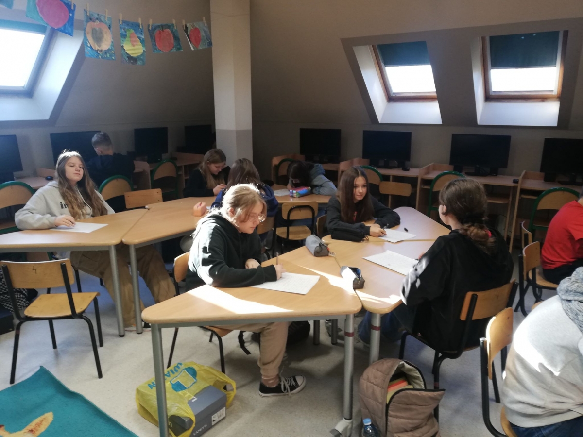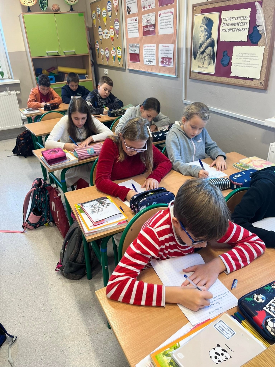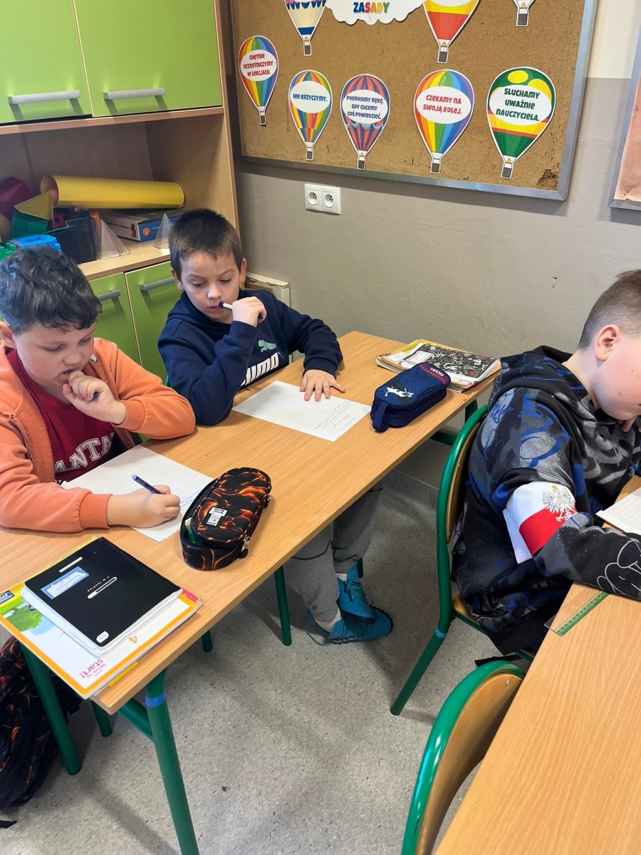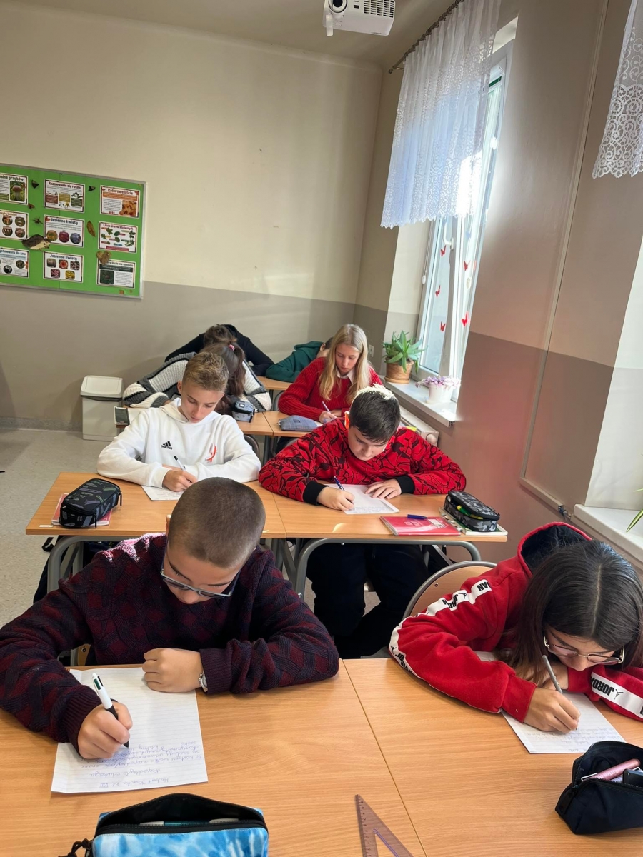 Uczniowie klas starszych IV – VIII pisali tekst dyktanda inspirowany materiałami Ogólnopolskiego Dyktanda Niepodległościowego „Po polsku o historii”. Jest to wyjątkowy projekt edukacyjny, to nie tylko sprawdzian znajomości języka ojczystego, ale też okazja, by przywołać pamięć o najważniejszych postaciach i wydarzeniach współczesnej historii Polski