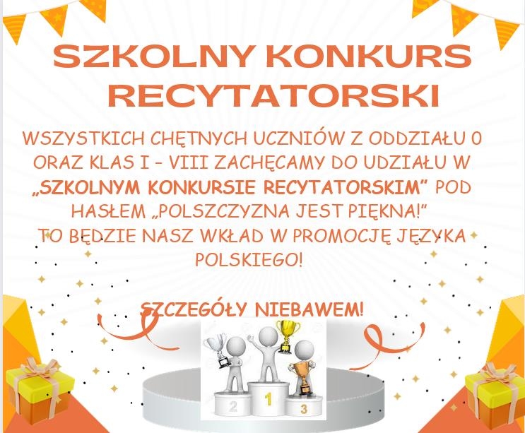 Wszystkich chętnych Uczniów z oddziału 0 oraz klas I – VIII zachęcamy do dalszych działań promujących polszczyznę. Zapraszamy do udziału w „Szkolnym Konkursie Recytatorskim” pod hasłem „Polszczyzna jest piękna!”. To będzie nasz wkład w promocję języka polskiego! Szczegóły niebawem!
