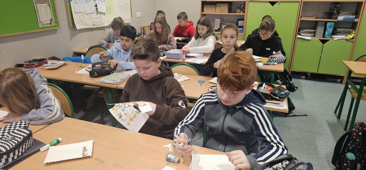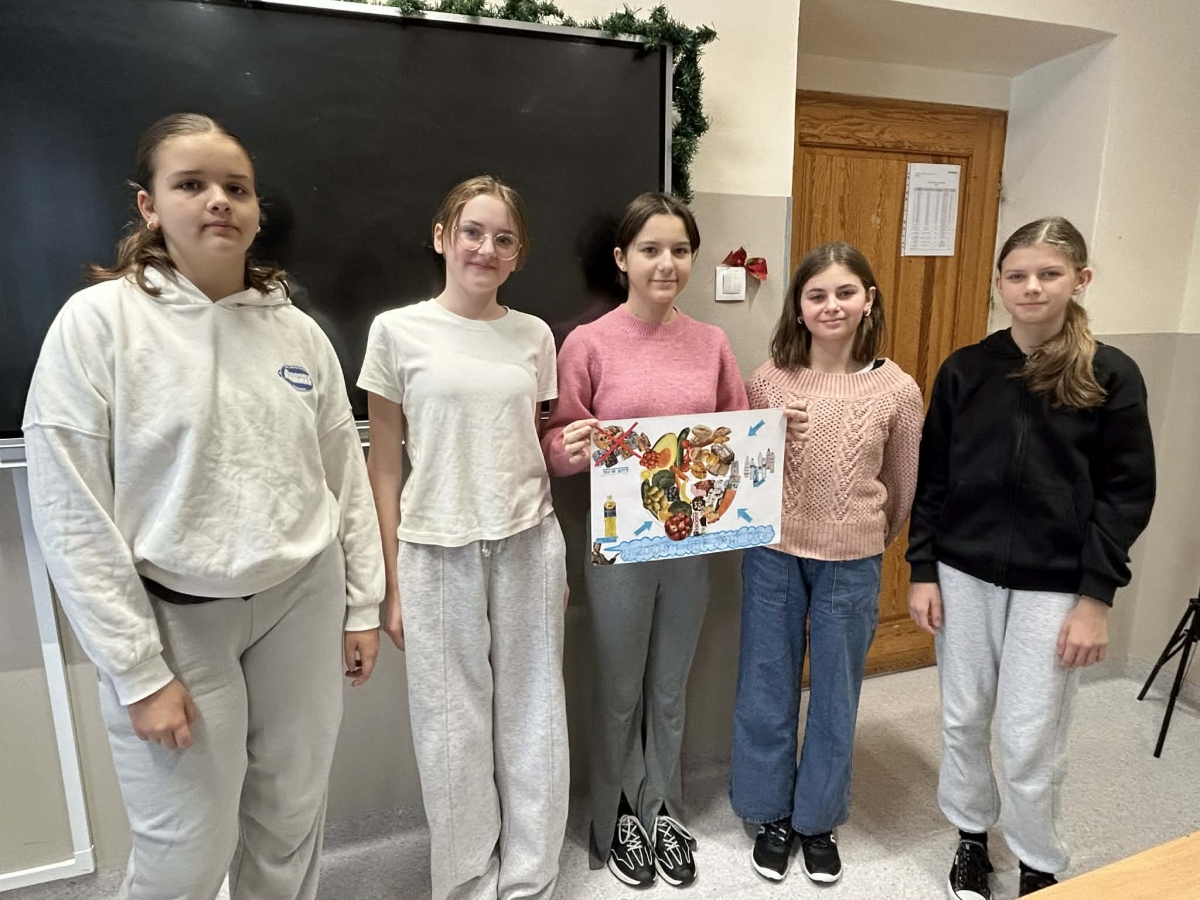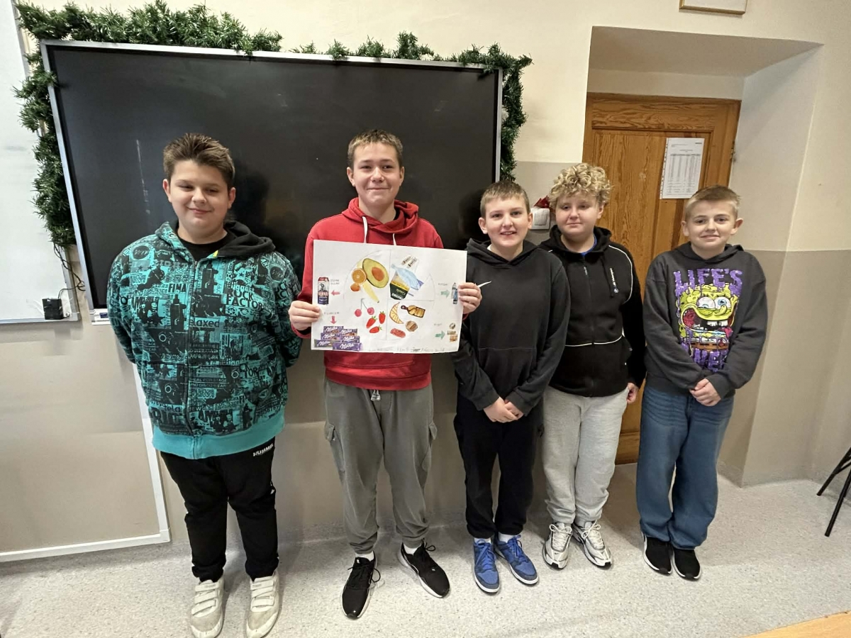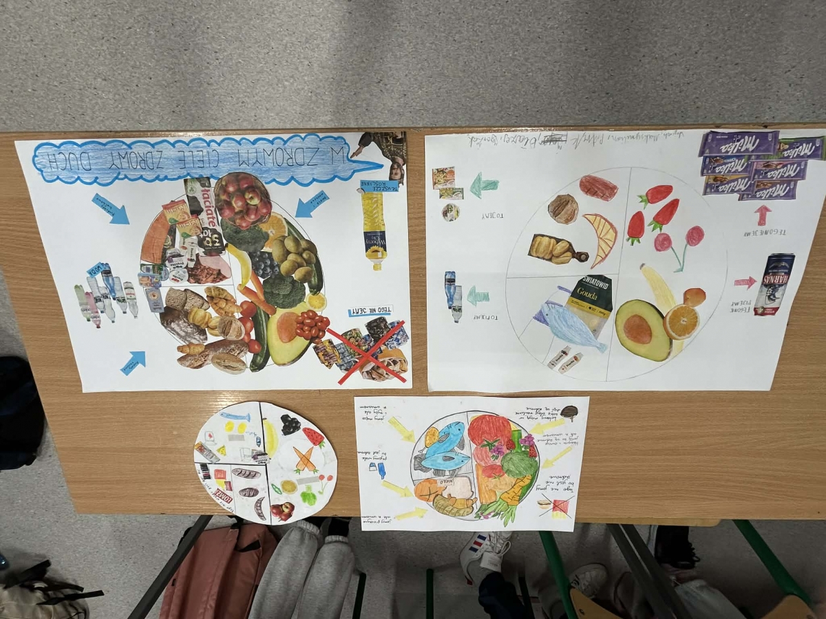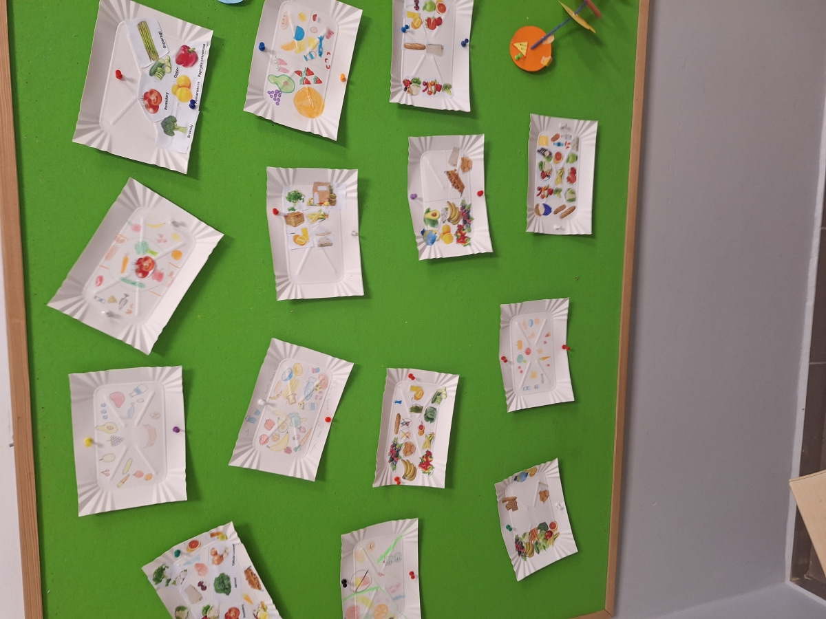 Na zakończenie uczniowie przygotowali własne, plastyczne wersje zdrowych talerzy, wykorzystując materiały z gazetek reklamowych. Powstały kolorowe i bardzo pomysłowe prace, które pokazały, że zdrowe jedzenie może być nie tylko wartościowe, ale i apetyczne.