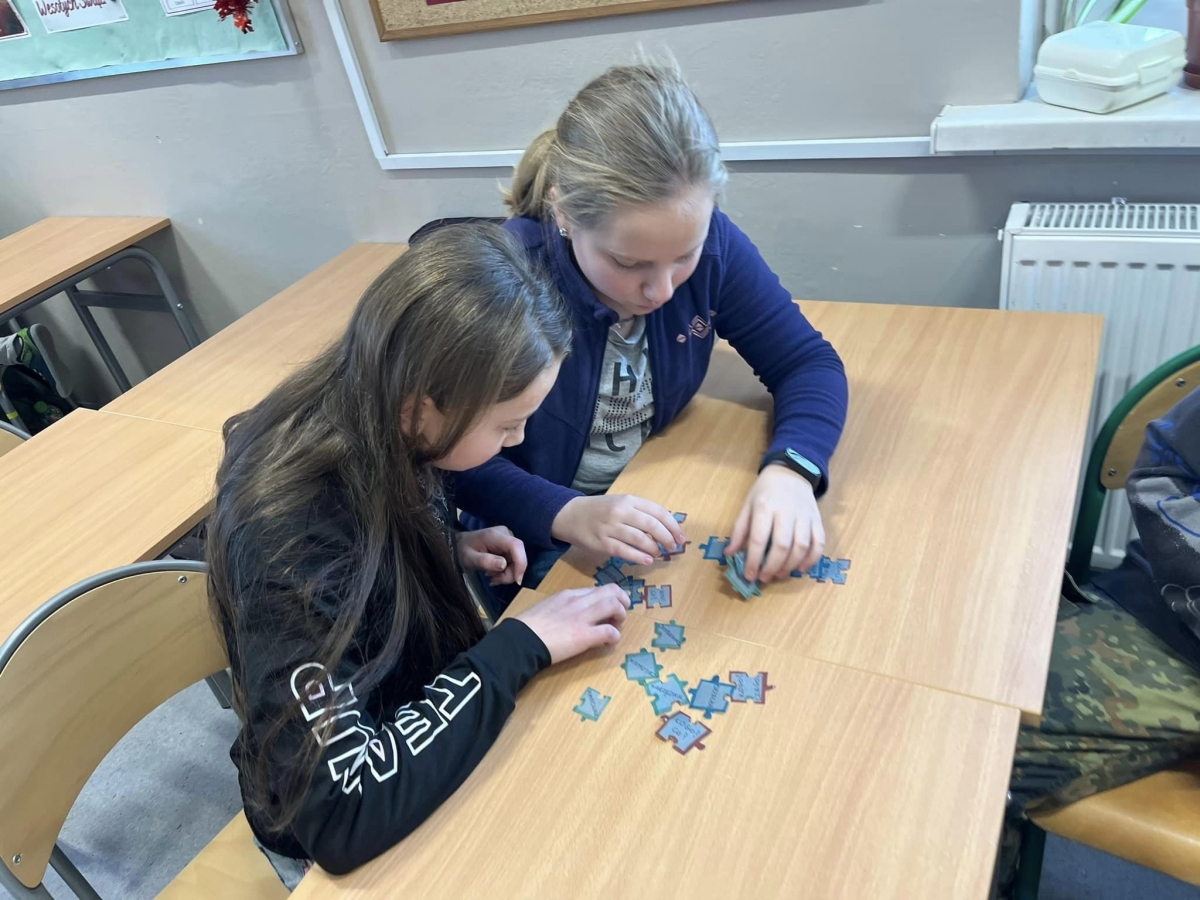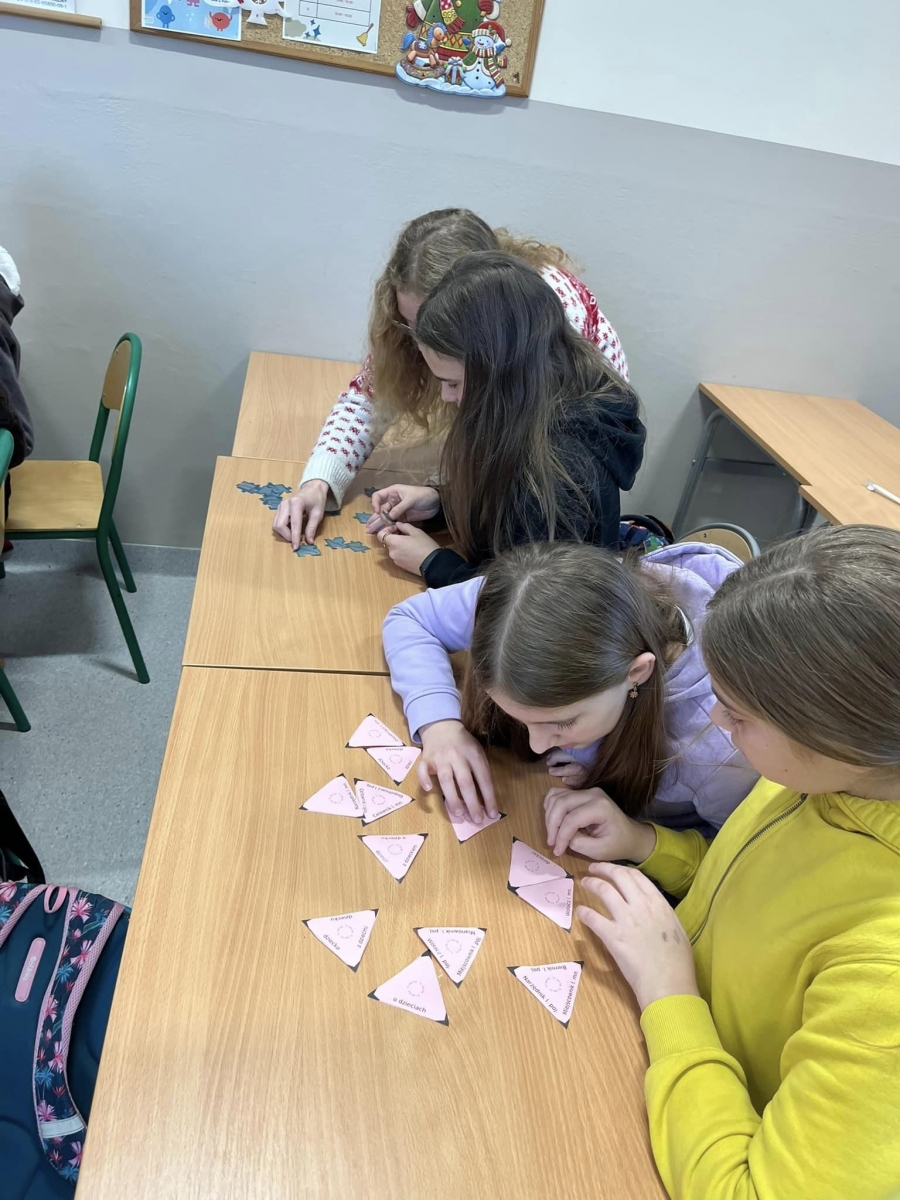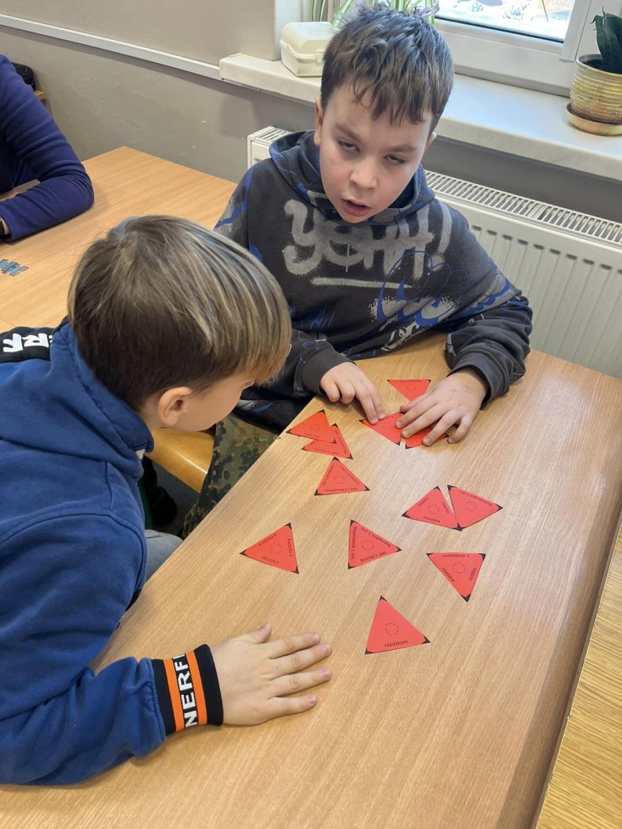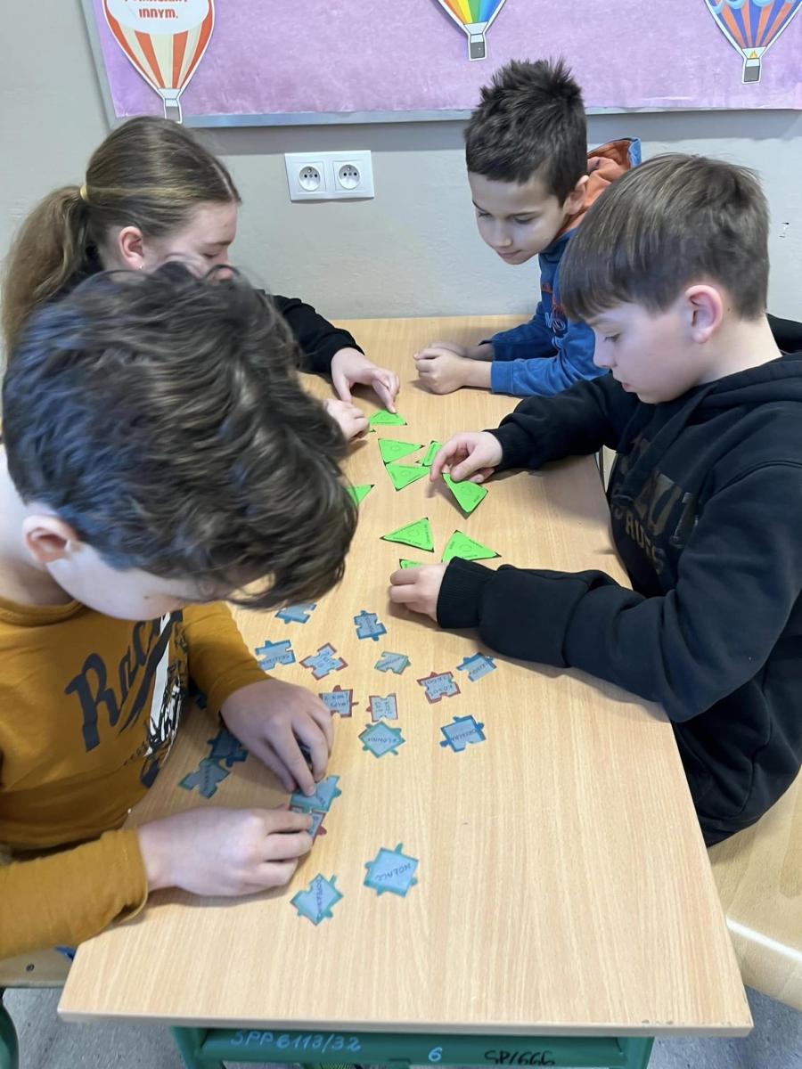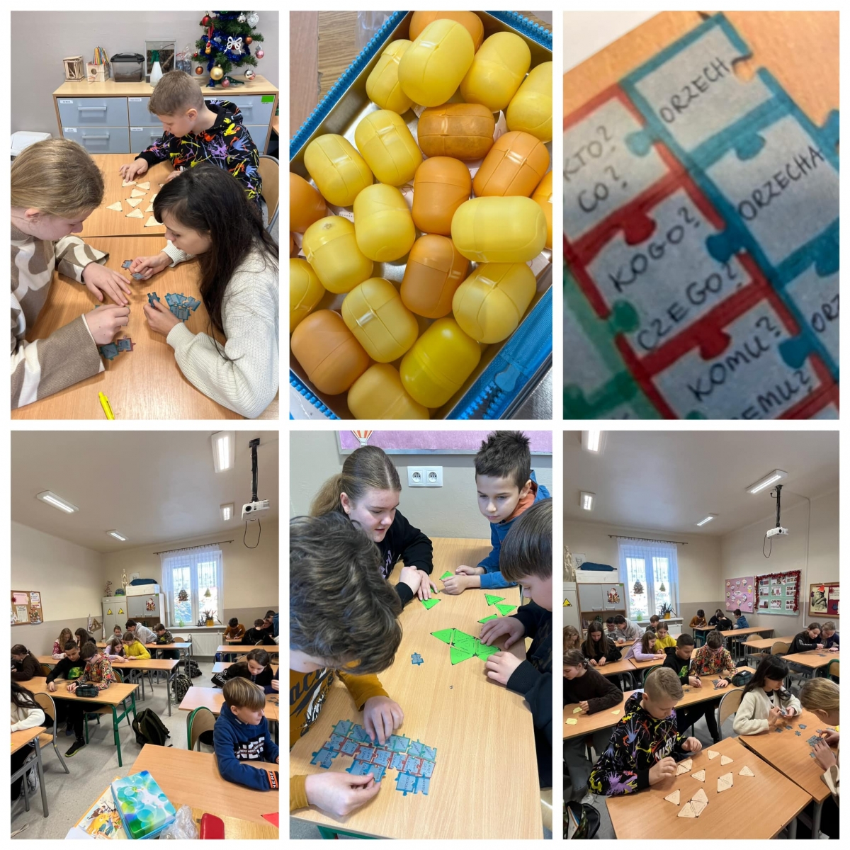 Uczniowie klasy V utrwalali wiadomości o przypadkach i odmianie rzeczownika, poznawali również pojęcia temat i końcówka. Żeby uniknąć nudy na języku polskim, uczniowie pracowali w grupach, wykonując ćwiczenia z wykorzystaniem puzzli i trimino.
