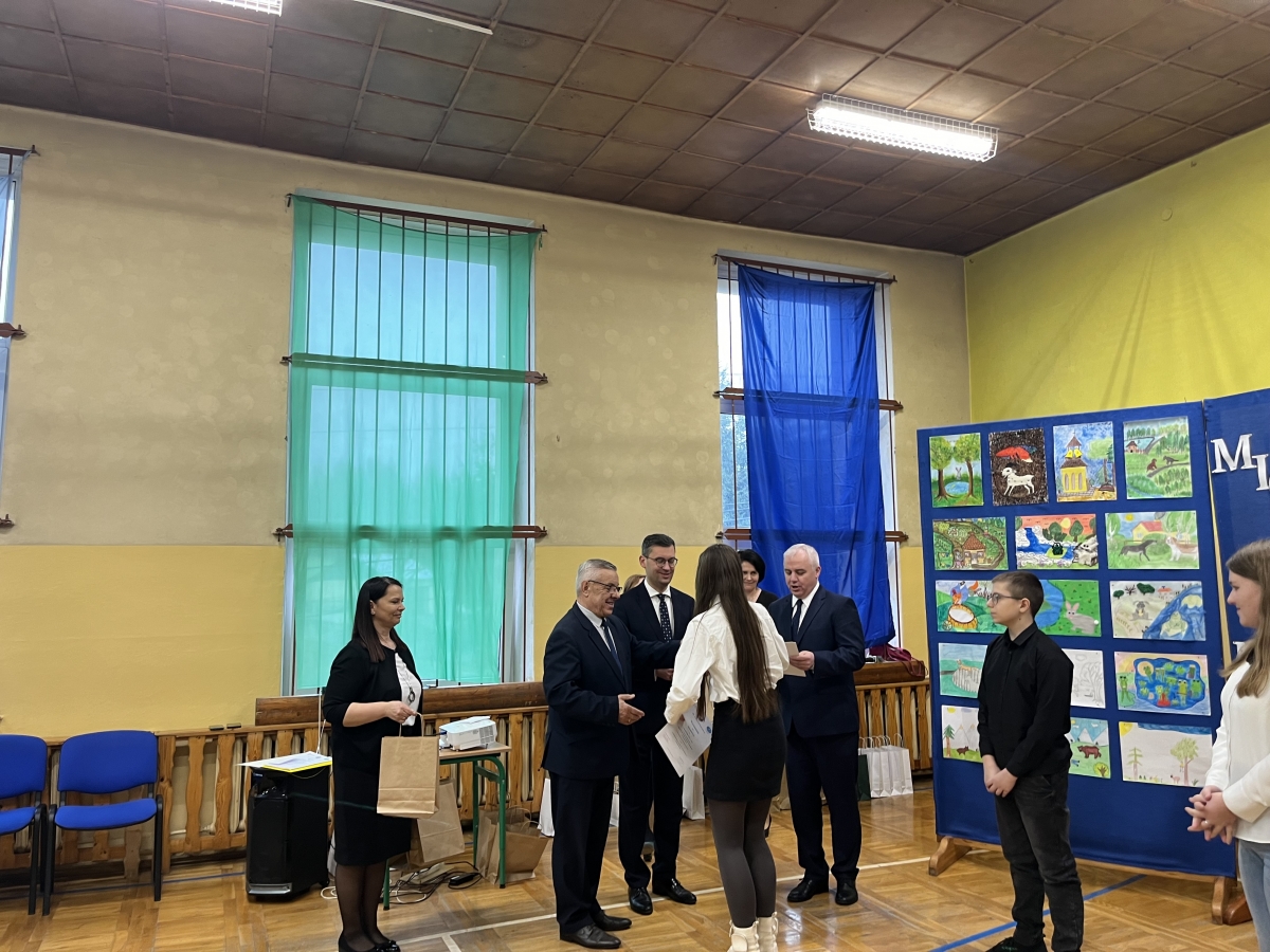 Na uroczystość podsumowania konkursu oprócz laureatów i ich opiekunów przybyli Burmistrz Gminy i Miasta Miechów Pan Dariusz Marczewski oraz Przewodniczący Rady Miejskiej w Miechowie Pan Zenon Czekaj, którzy wręczali laureatom nagrody i wspólnie pozowali do zdjęć.