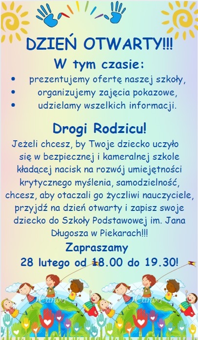 DZIEŃ OTWARTY w Szkole Podstawowej im. Jana Długosza w Piekarach!!! Zapraszamy 28 lutego od 18.00 do 19.30!