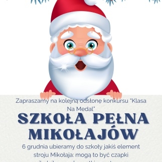 W ramach konkursu "Klasa na MEDAL" ogłaszamy kolejną akcję 6 grudnia w środę - "Szkoła pełna Mikołajów". Zakładamy elementy stroju Mikołaja!!!