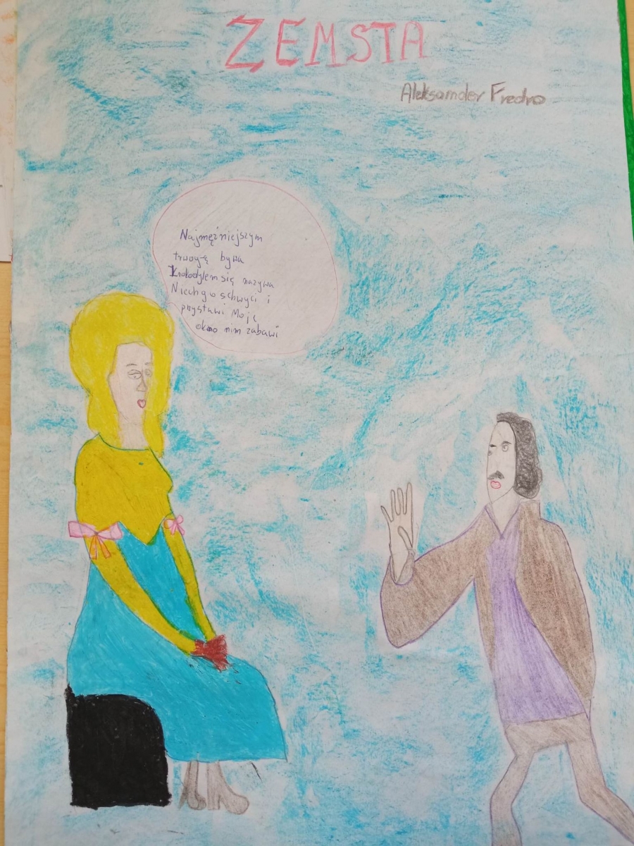 Plastyczne inspiracje dziełami Fredry przygotowali uczniowie z następujących klas: