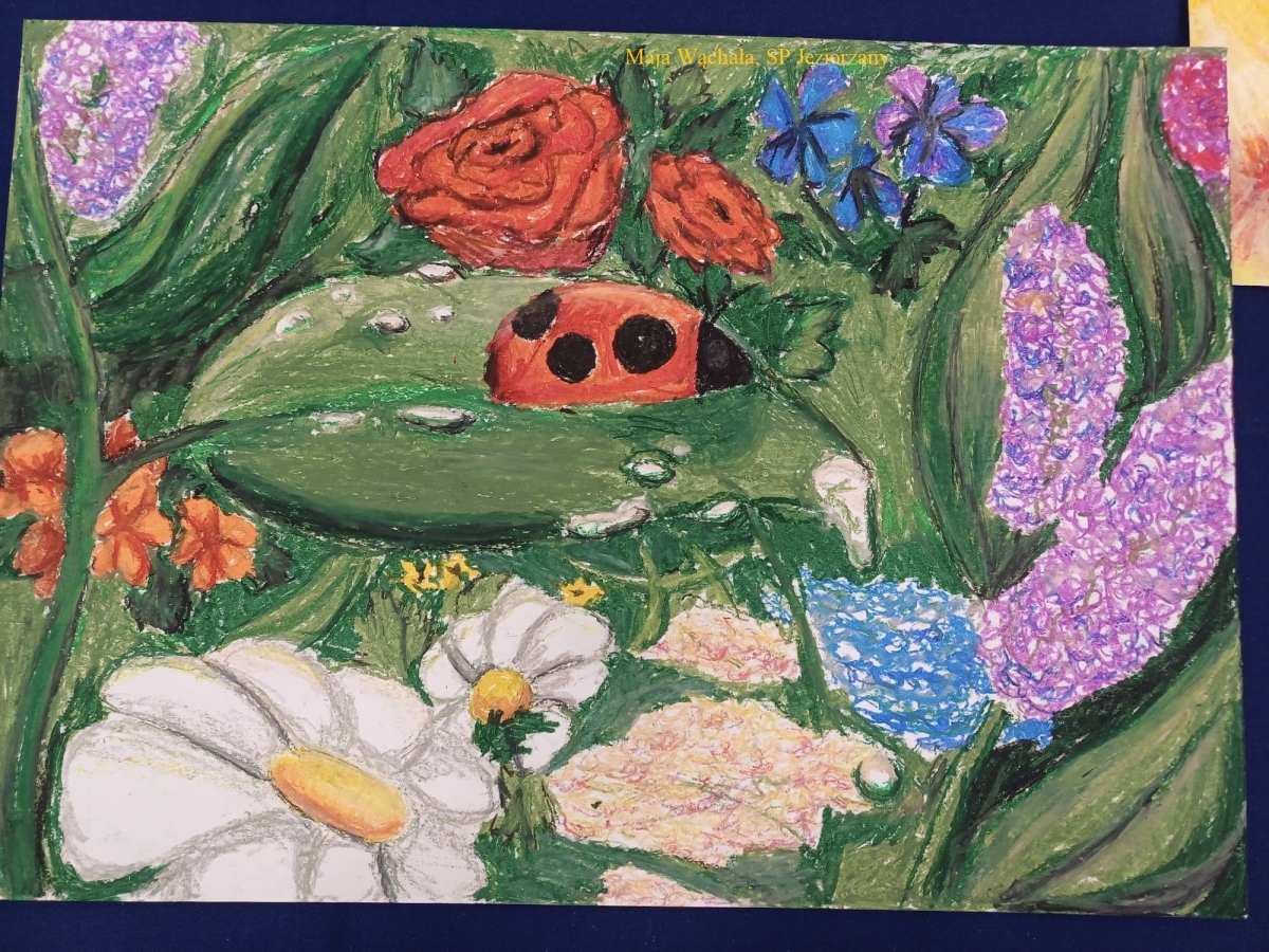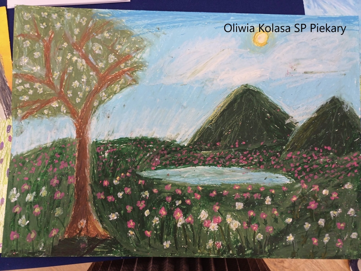 w ciągu 1,5 godziny ,,wyczarowali” za pomocą pastelowych kredek piękne, barwne, przyciągające oko prace plastyczne. Na obrazach ,,młodych malarzy’’ wiosna zagościła m.in. w górach, nad stawem i w ogrodzie.