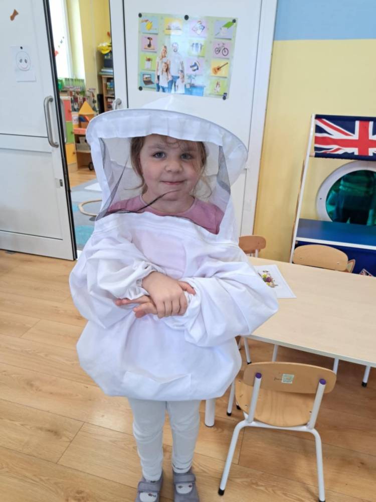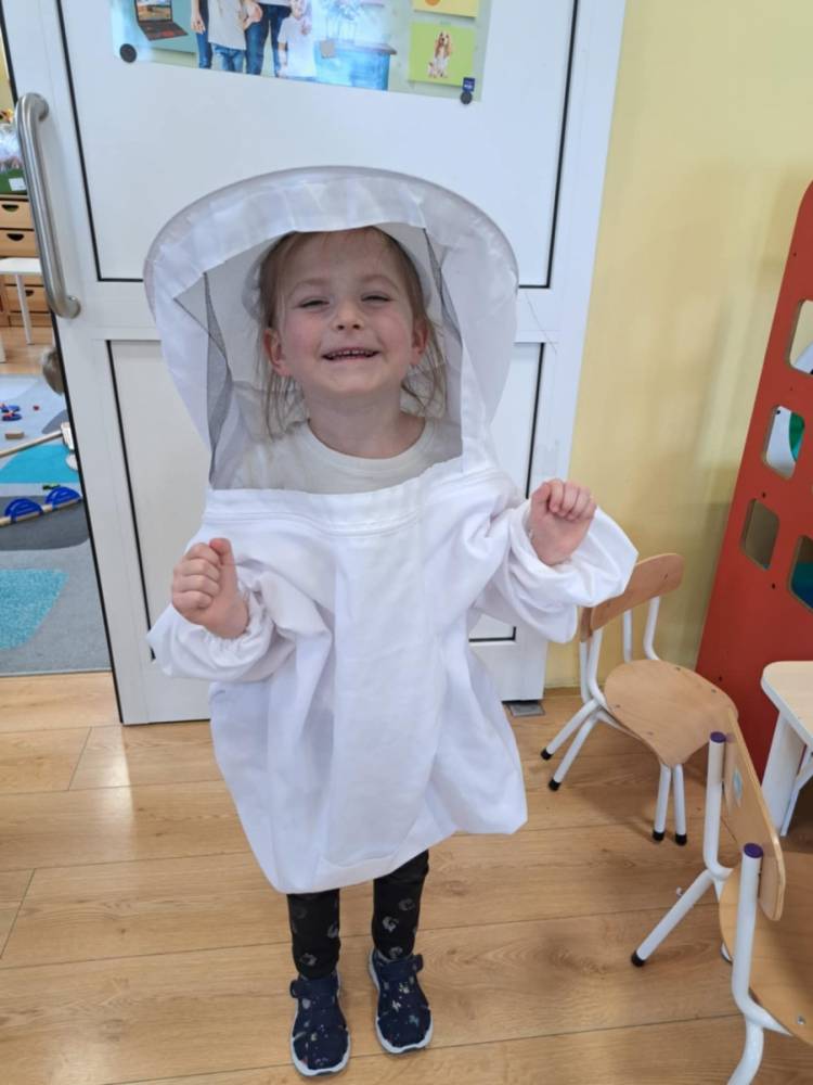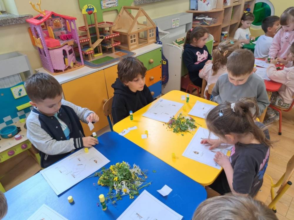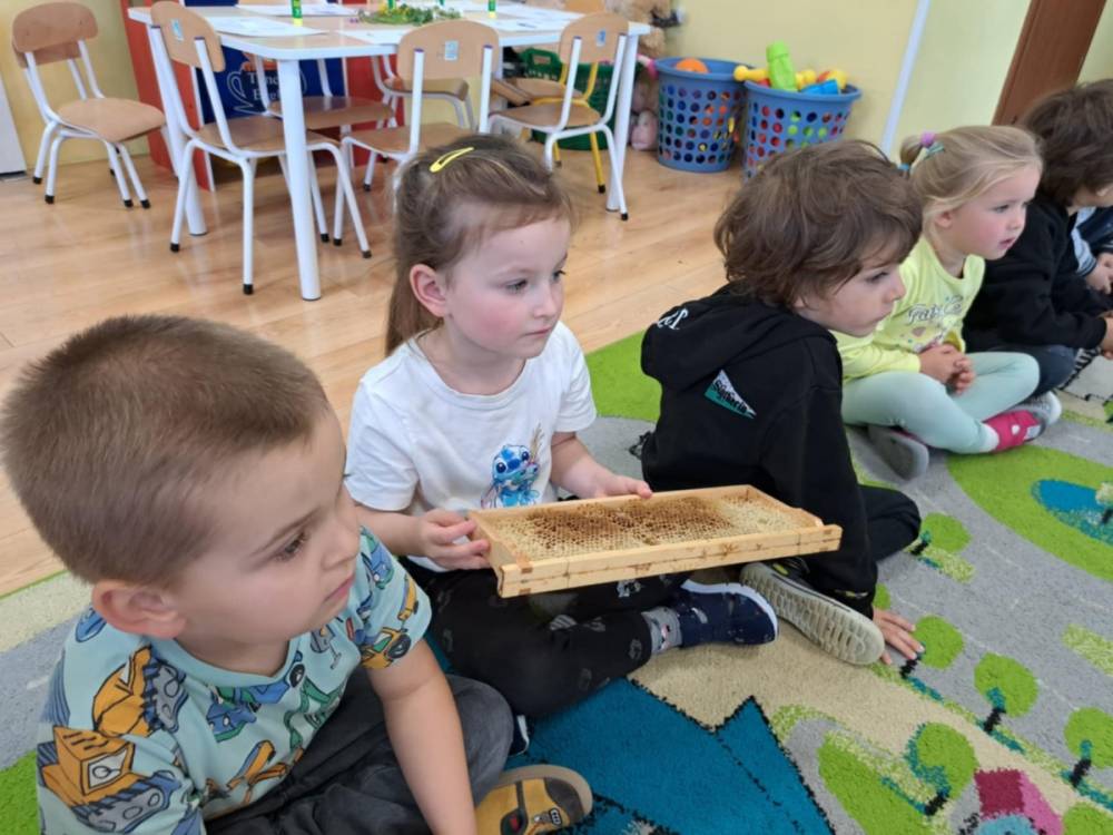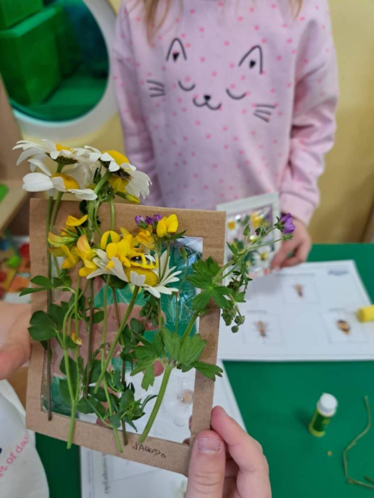 Niedawno obchodziliśmy Światowy Dzień Pszczoły i to właśnie o ich rodzinie rozmawialiśmy podczas warsztatów przyrodniczych. Dzieci dowiedziały się jakie produkty poza miodem wytwarzają pszczoły, mogły je dotknąć, zobaczyć i powąchać. Dowiedziały się dlaczego pszczoły żądlą tylko raz, a osy i szerszenie mogą to robić wielokrotnie, co stanie się kiedy szerszeń wleci do ula, gdzie mieszkają trzmiele i czy także produkują miód, czym żywią się szerszenie i osy oraz który owad najskuteczniej zapyla rośliny. Przedszkolaki i uczniowe zobaczyli ramkę z ula, pszczele produkty: miody o różnych kolorach i konsystencjach, pyłek kwiatowy, wosk pszczeli, pierzgę oraz propolis, a także same owady oraz gniazdo os. Miały także okazję przebrać się w strój pszczelarski. Na koniec z polnych kwiatów, każdy uczestnik warsztatów wykonał swoją łąkę kwietną.