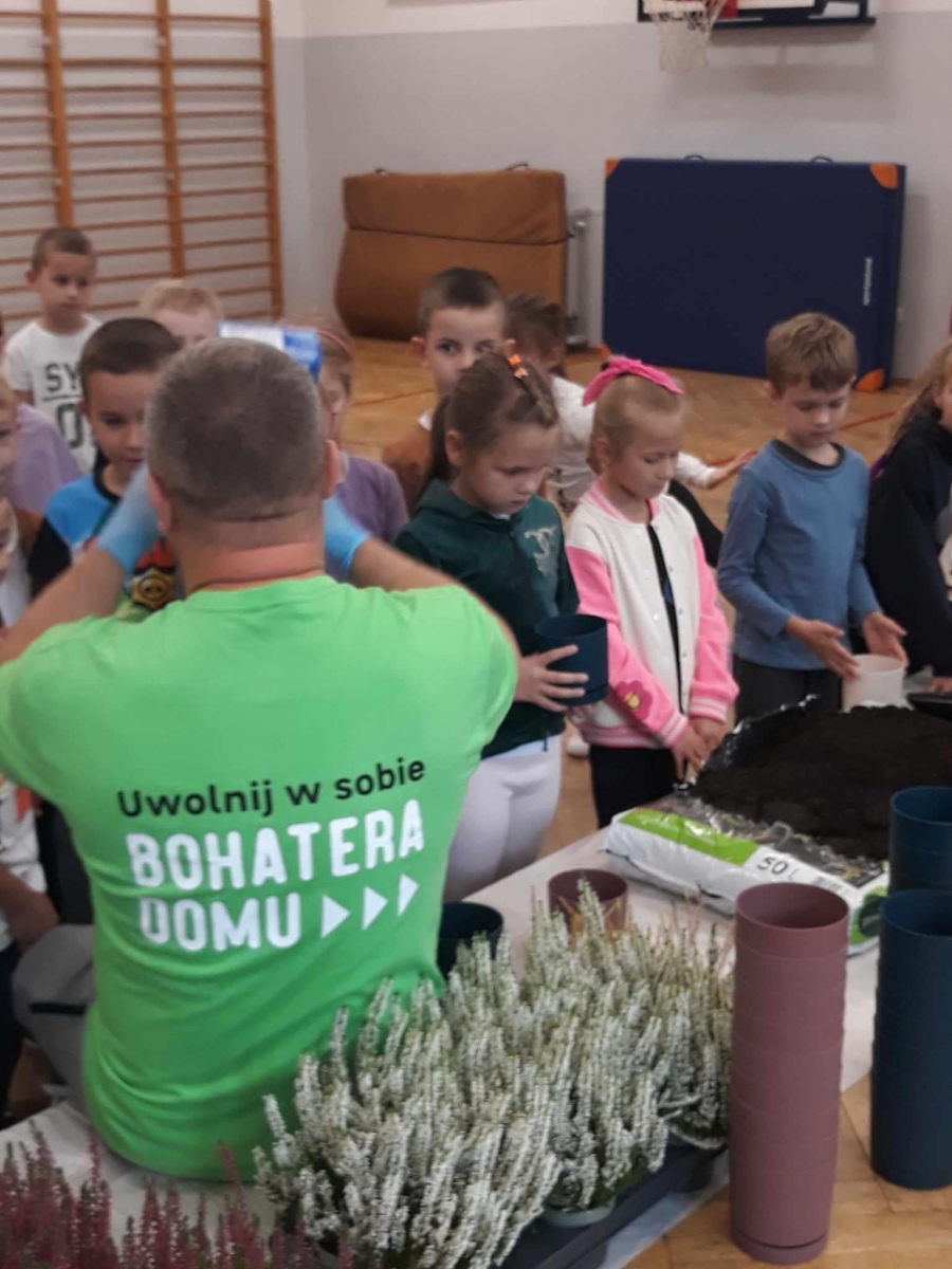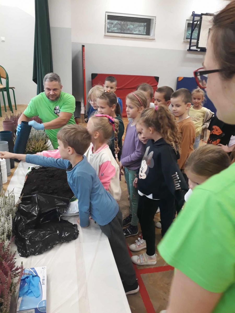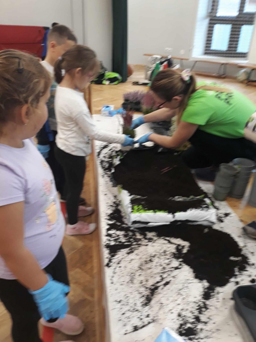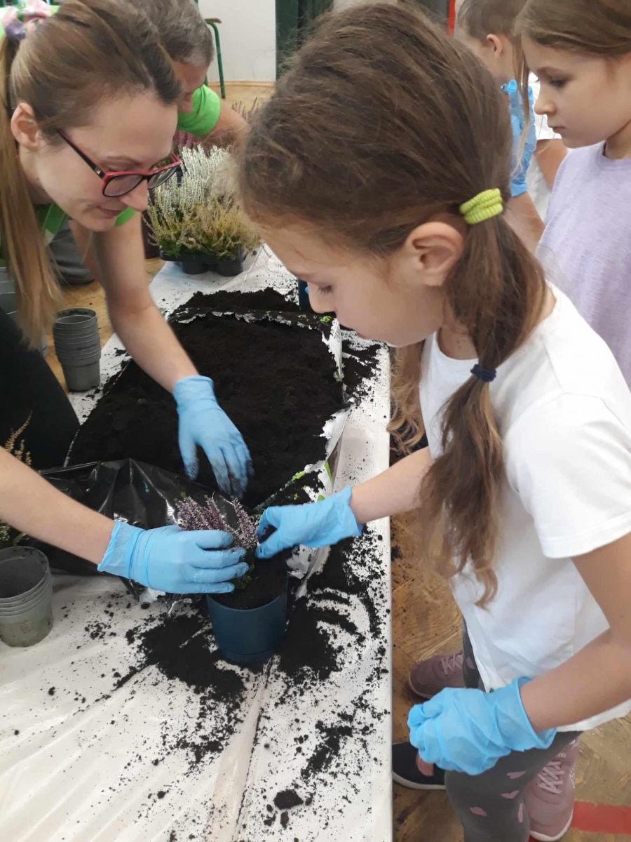 W piątek uczniowie klasy I gościli przedstawicieli firmy LEROY MERLIN na warsztatach. Uczniowie dowiedzieli się wielu ważnych rzeczy na temat ekologii i pielęgnacji roślin. Po teorii przyszedł czas na praktyczną cześć warsztatów. Dzieci sięgnęły po rękawiczki i doniczki, by przesadzać kolorowe kwiaty. Fakt samodzielnej pracy to wielka przyjemność, ale też praktyczna nauka. Każdy uczestnik w czasie spotkania dowiedział się, jak należycie dbać o własną roślinkę, jak ją należy pielęgnować, aby wrzosy mogły ozdobić nasze przydomowe ogródki.