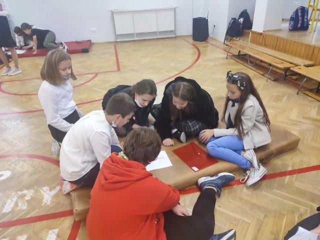 W trakcie 1,5 h. spotkania uczniowie - grupa BIAŁYCH , grupa CZERWONYCH i grupa ZIELONYCH - poszukiwali 6 kopert, w których znajdowały się koleje zadania.