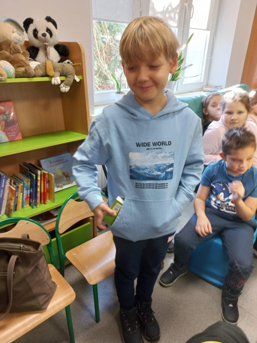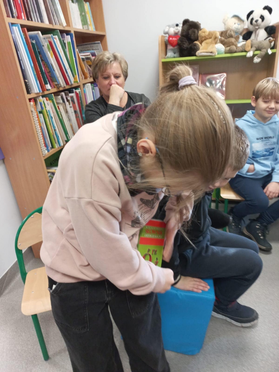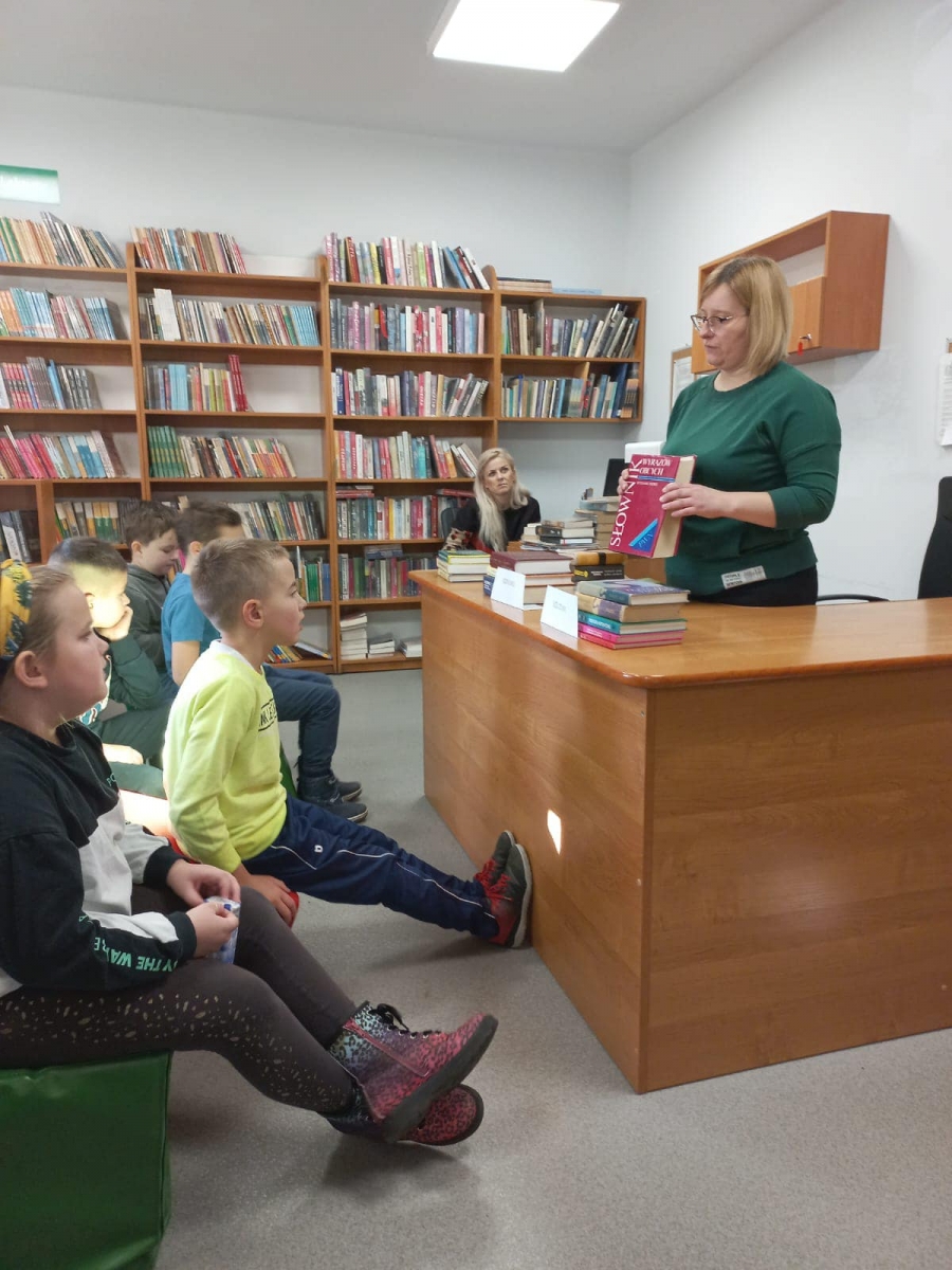 Uczniowie z zaciekawieniem słuchali opowieści o słownikach Pani Bibliotekarki Natalii Kołodziejczyk. Dowiedzieli się także, że współczesne słowniki można znaleźć w telefonie, trzeba tylko pamiętać, aby korzystać ze źródeł wiarygodnych, takich jak Słownik Języka Polskiego lub Państwowe Wydawnictwo Naukowe.