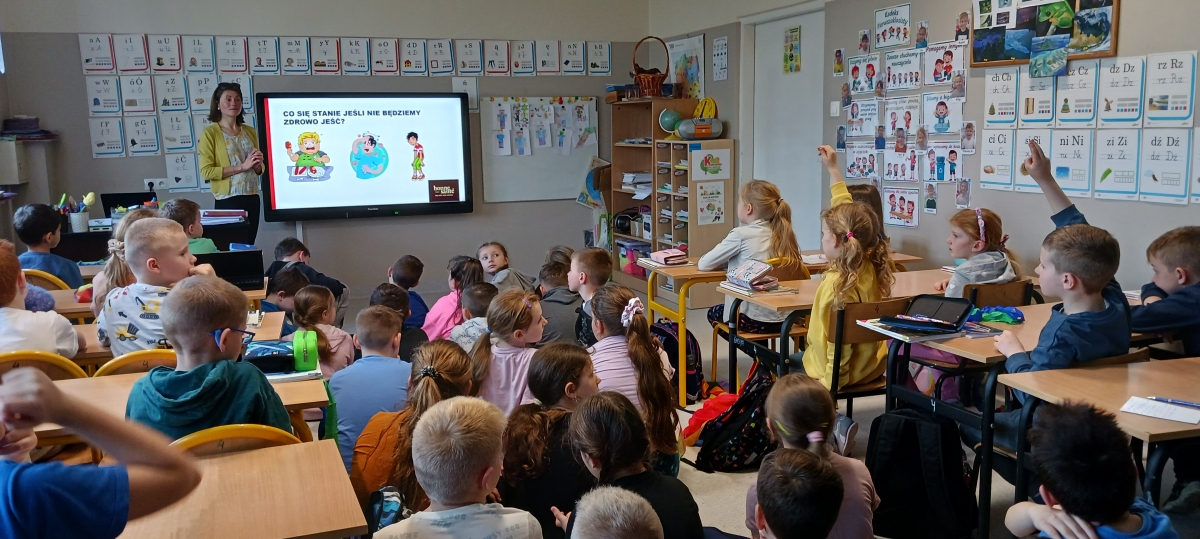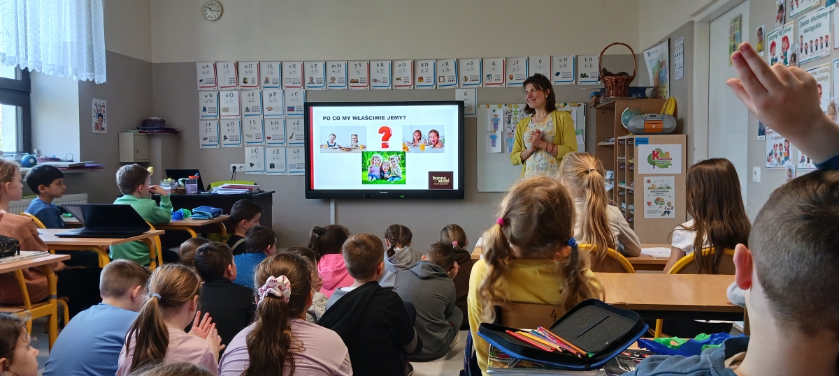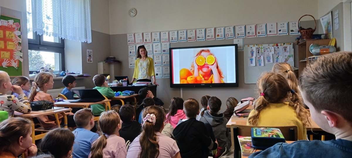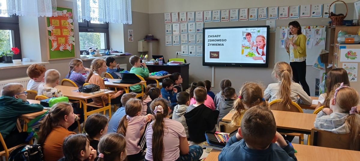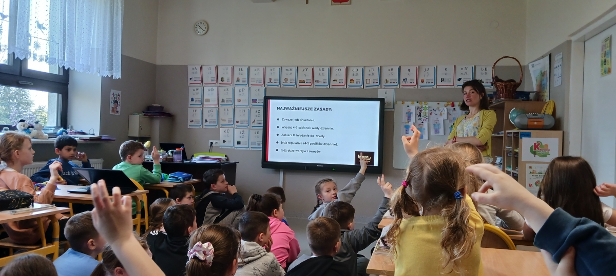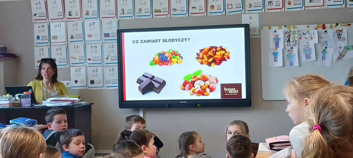 21 kwietnia uczniowie klas młodszych brali udział w warsztatach „Zasady zdrowego odżywiania”, które poprowadziła pani dietetyk Klaudia Korczek. Prowadząca omówiła, na czym polega praca na dietetyka. Przedstawiła wartości odżywcze wybranych produktów zwracając szczególną wagę na te, które mają szkodliwy wpływ na zdrowie człowieka. . Uczniowie chętnie wypowiadali się na temat swoich codziennie spożywanych posiłków, a przede wszystkim poznali najważniejsze zasady zdrowego odżywiania się. Wszyscy wzięli udział w quizie sprawdzającym ich wiedzę dotyczącą zdrowych posiłkach. Z zaangażowaniem uczestniczyli także w zabawie polegającej na przyporządkowywaniu obrazków do wskazanych odpowiedzi. Na zakończenie spotkania uczniowie otrzymali karty z zadaniami oraz przykładowe zestawy zdrowych posiłków.