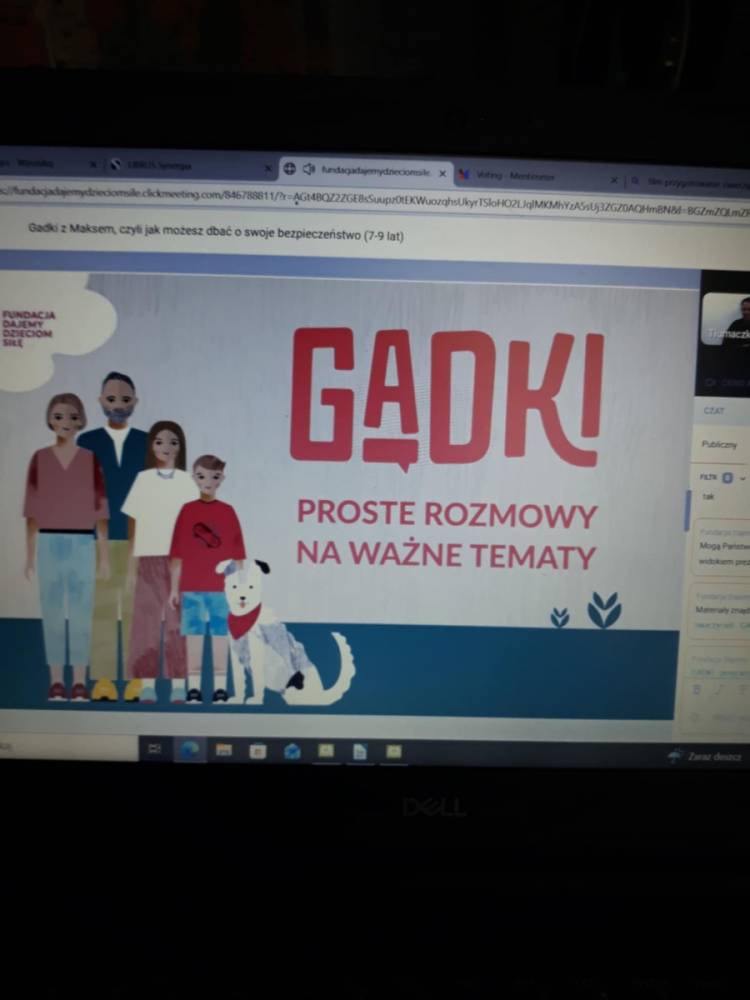 Spotkanie miało na celu przekazanie dzieciom w przystępny i przyjazny sposób najważniejszych zasad dotyczących bezpieczeństwa osobistego. Podczas webinarium uczniowie poznali sympatycznego bohatera – Maksa, który wprowadzał ich w świat zasad „GADKI”. Dzieci dowiedziały się, że mają prawo dbać o swoje granice, odmawiać, gdy coś budzi ich niepokój oraz zwracać się o pomoc do zaufanych dorosłych. Prelegenci tłumaczyli również, jak rozpoznawać sytuacje potencjalnie niebezpieczne oraz jak reagować w momentach, które mogą wydawać się trudne lub niezrozumiałe.