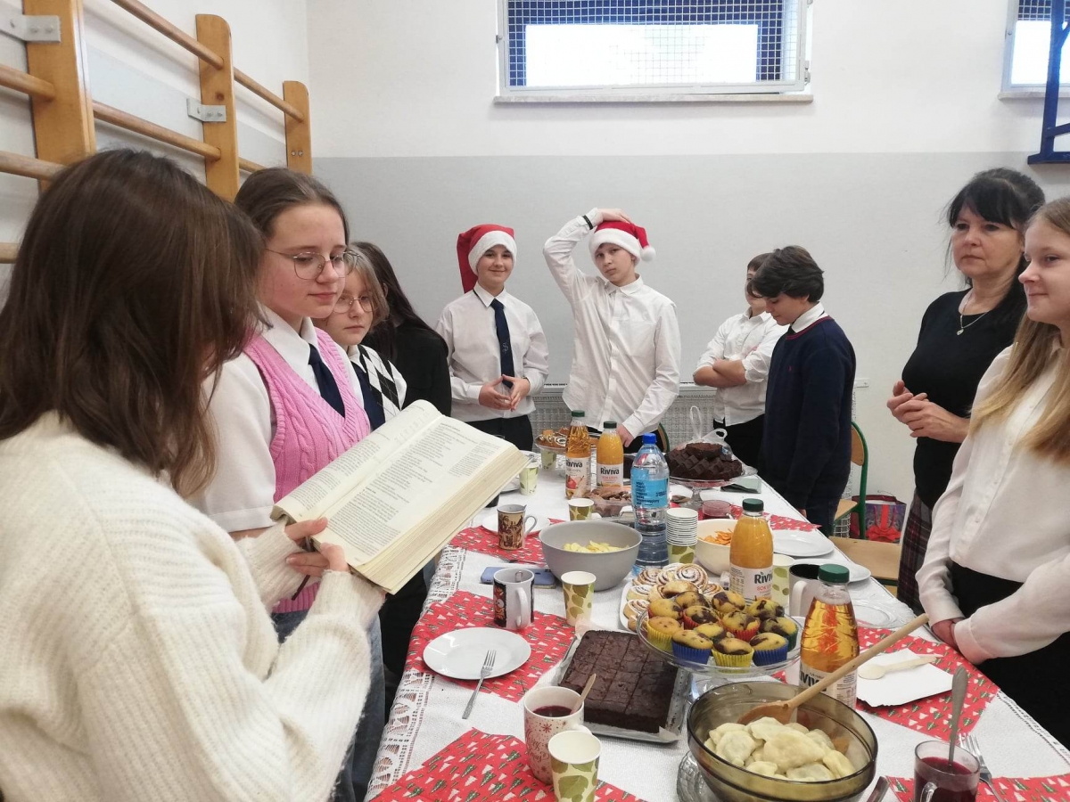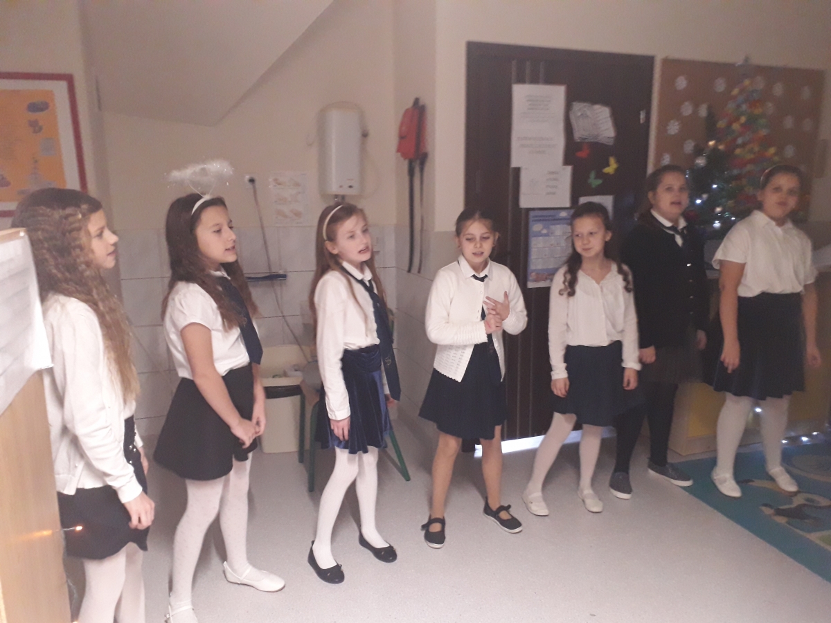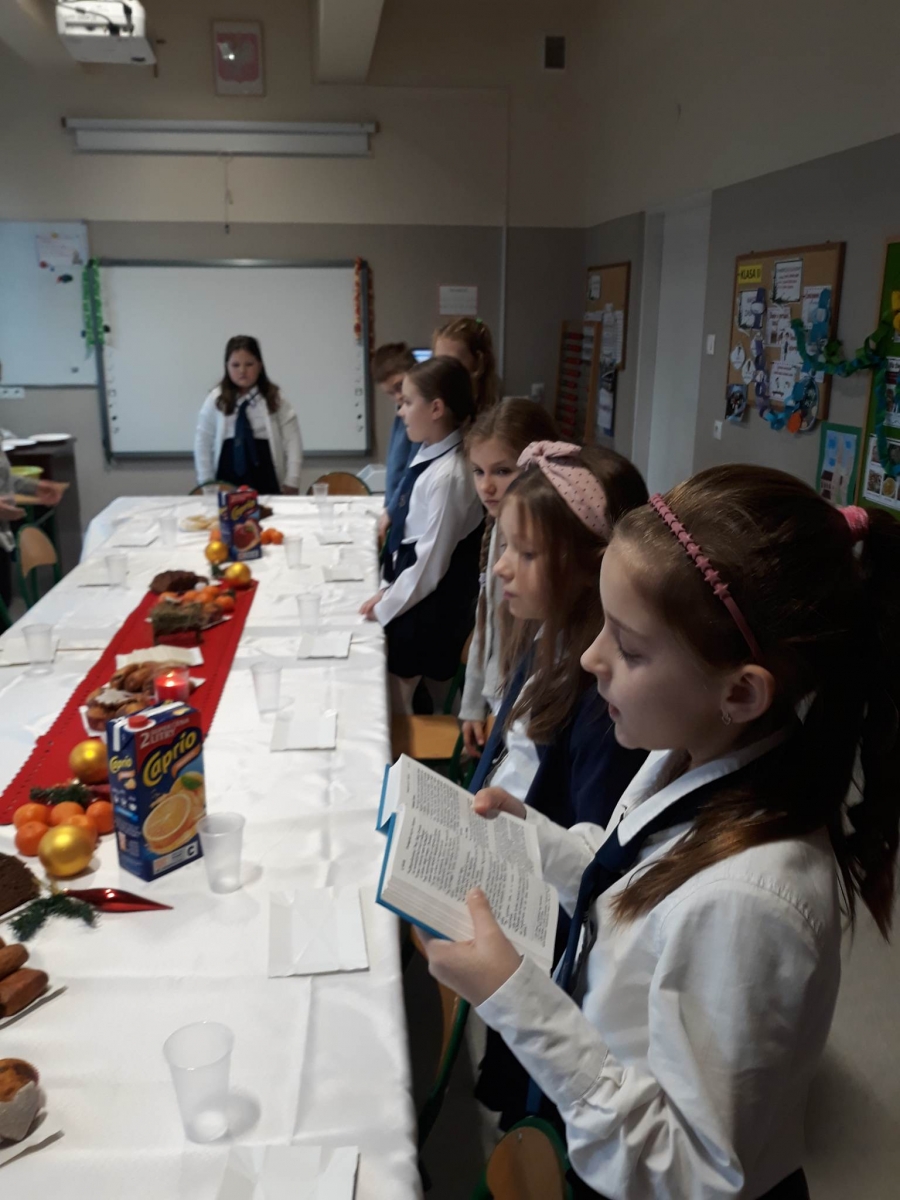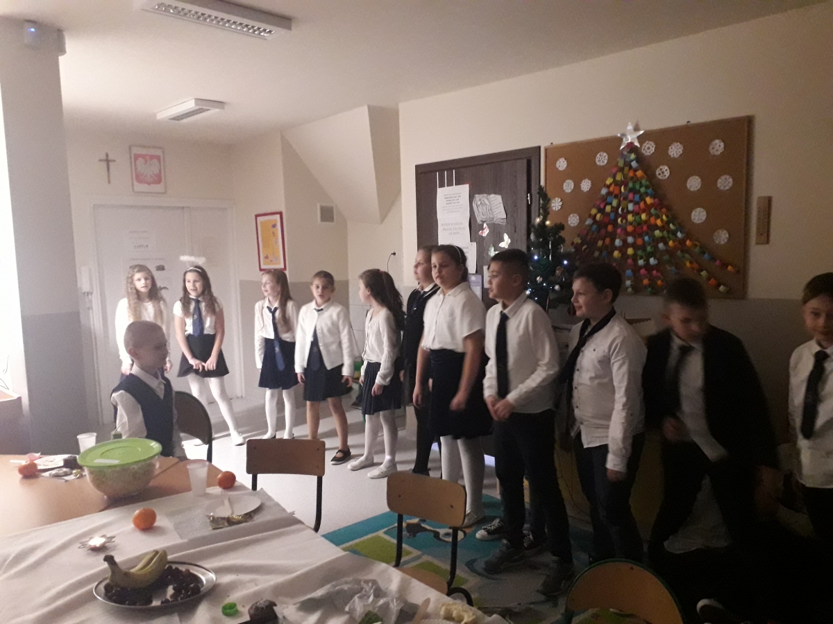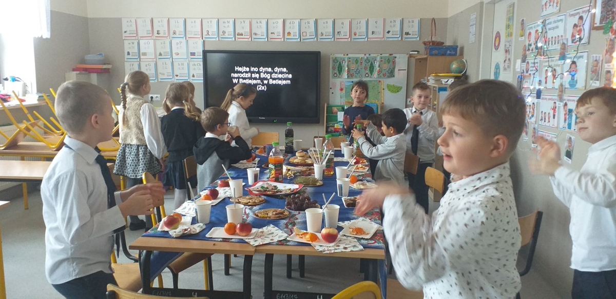 W tym uroczystym dniu przedszkolaki i uczniowie naszej szkoły w odświętnych strojach czytali Pismo Święte, dzielili się opłatkiem, śpiewali kolędy i składali sobie życzenia. Wszyscy już czują atmosferę zbliżających się Świąt Bożego Narodzenia. Dekoracje, zapach choinek i dźwięk kolęd wprowadzają nas w podniosły nastrój.