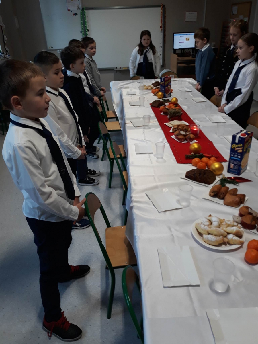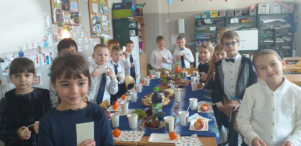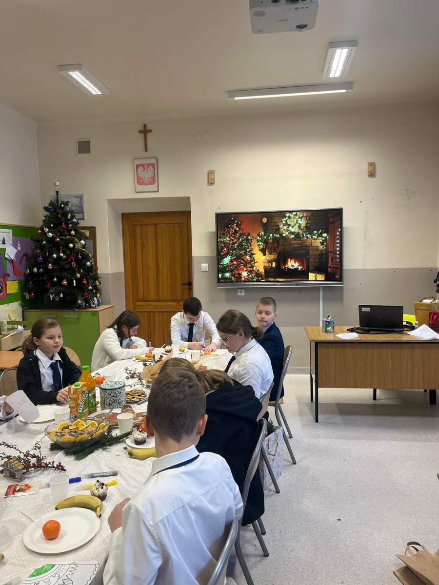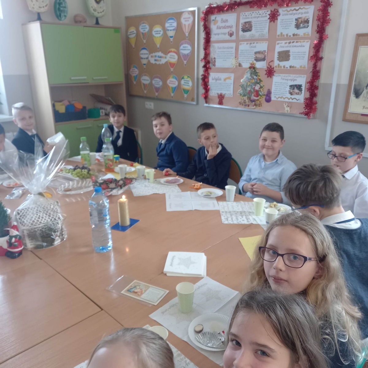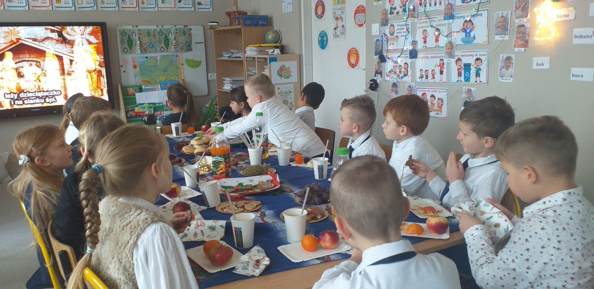W tym uroczystym dniu przedszkolaki i uczniowie naszej szkoły w odświętnych strojach czytali Pismo Święte, dzielili się opłatkiem, śpiewali kolędy i składali sobie życzenia. Wszyscy już czują atmosferę zbliżających się Świąt Bożego Narodzenia. Dekoracje, zapach choinek i dźwięk kolęd wprowadzają nas w podniosły nastrój.