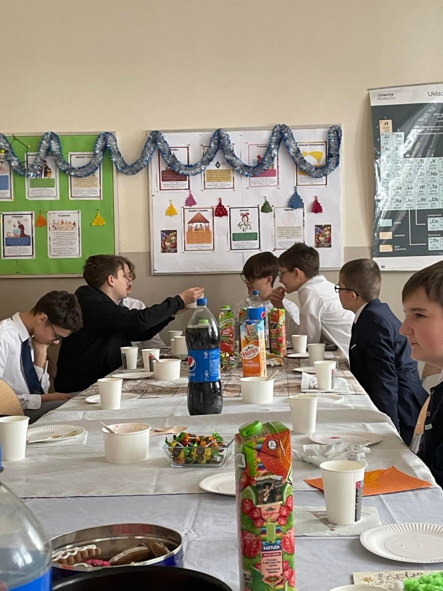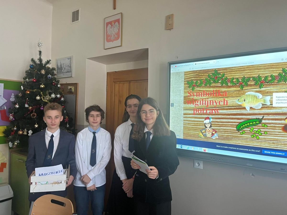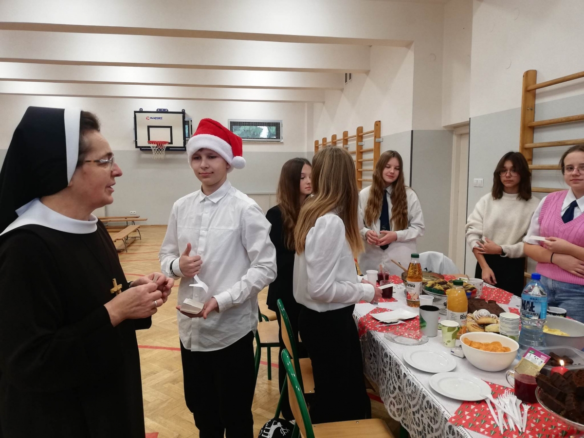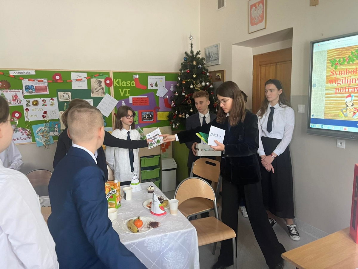 W czasie spotkań klasowych przedstawicie Samorządu Uczniowskiego roznosili także świąteczną pocztę. Każdy, kto chciał przekazać wybranej osobie życzenia, wrzucał je do specjalnej skrzyneczki, a w dniu spotkań wigilijnych piękne kartki trafiły do adresatów.