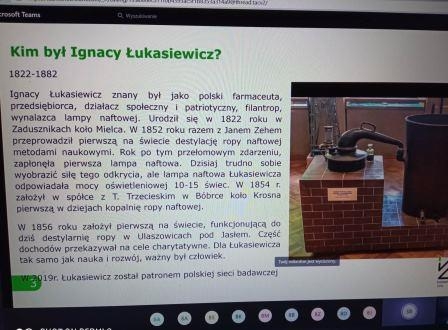 W ramach spotkania Pani prowadząca przybliżyła też młodym ludziom sylwetkę Ignacego Łukasiewicza, wybitnego polskiego farmaceuty i przedsiębiorcy, założyciela pierwszej na świecie kopalni ropy naftowej, wynalazcy lampy naftowej, pioniera przemysłu naftowego w Europie.