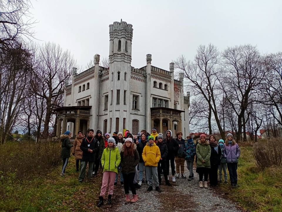Pan Przewodnik przedstawił uczniom także historię pałacu Alfreda Milieskiego.
