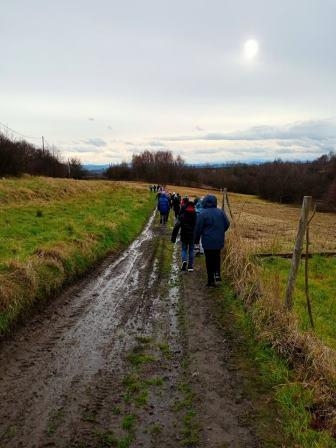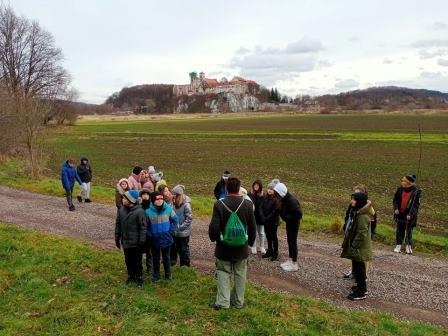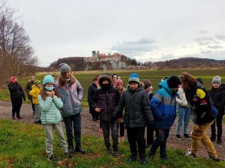Kolejnym punktem programu były Skałki Piekarskie, skąd można było podziwiać piękną panoramę na klasztor w Tyńcu. Pan Przewodnik wspomniał o historii tego miejsca, przywołał ważne dla historii Polski postacie Tadeusza Kościuszki czy Józef Wodzickiego, którzy spotkali się na terenie naszej miejscowości.