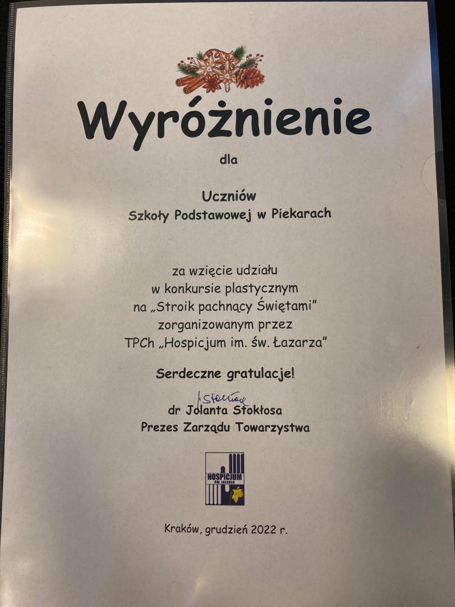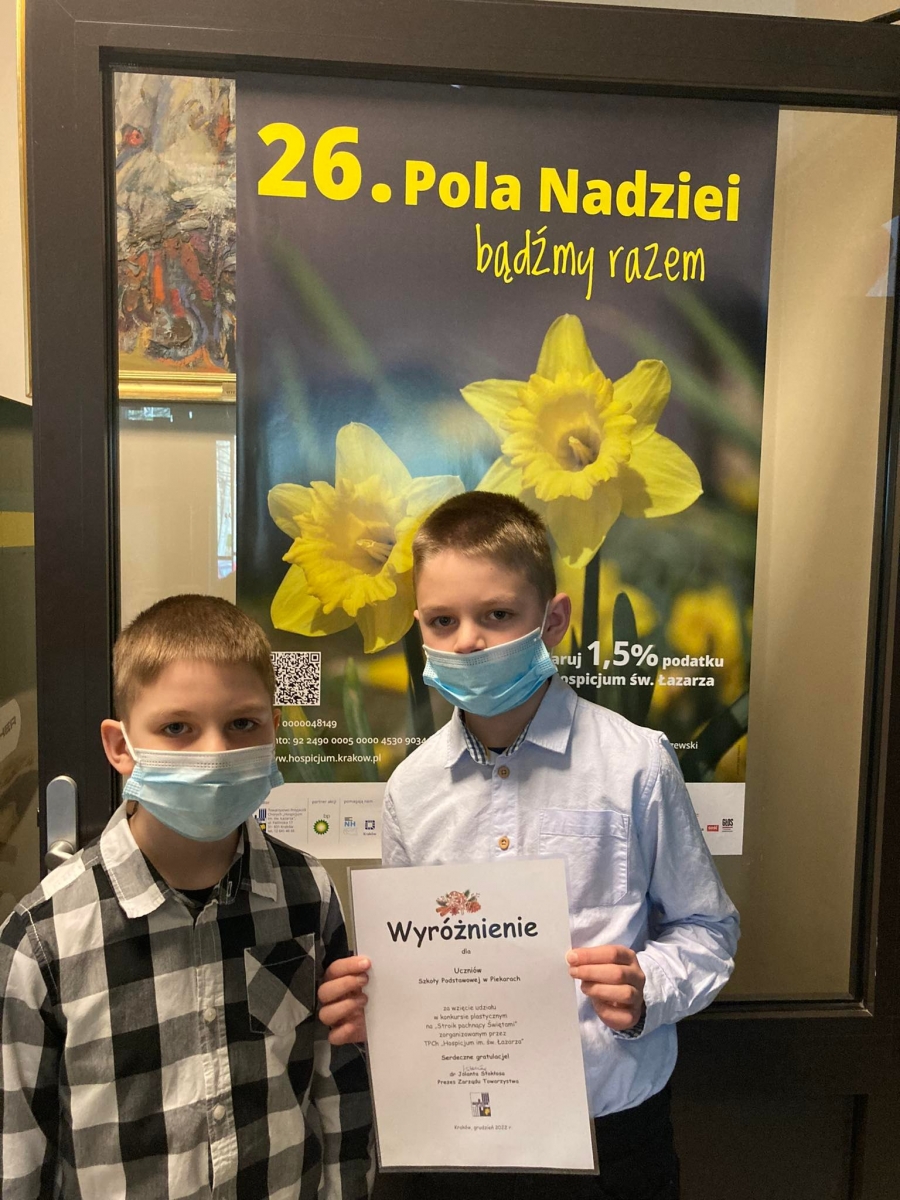 12 marca w siedzibie Hospicjum św. Łazarza w Krakowie odbyła się uroczysta inauguracja 26 edycji akcji Pola Nadziei. Podczas tego wydarzenia wręczono także nagrody w konkursie plastycznym „Stroik pachnący Świetami” ogłoszonym przez TPCh „Hospicjum św. Łazarza” dla przedszkoli i szkół podstawowych z województwa małopolskiego. Jury konkursowe przyznało wyróżnienie zbiorowe dla uczniów naszej Szkoły. Dziękujemy wszystkim uczniom, którzy zaangażowali się w przygotowanie stroików a Ignacemu i Lucjanowi za reprezentowanie szkoły w Hospicjum na uroczystości wręczenia nagród.