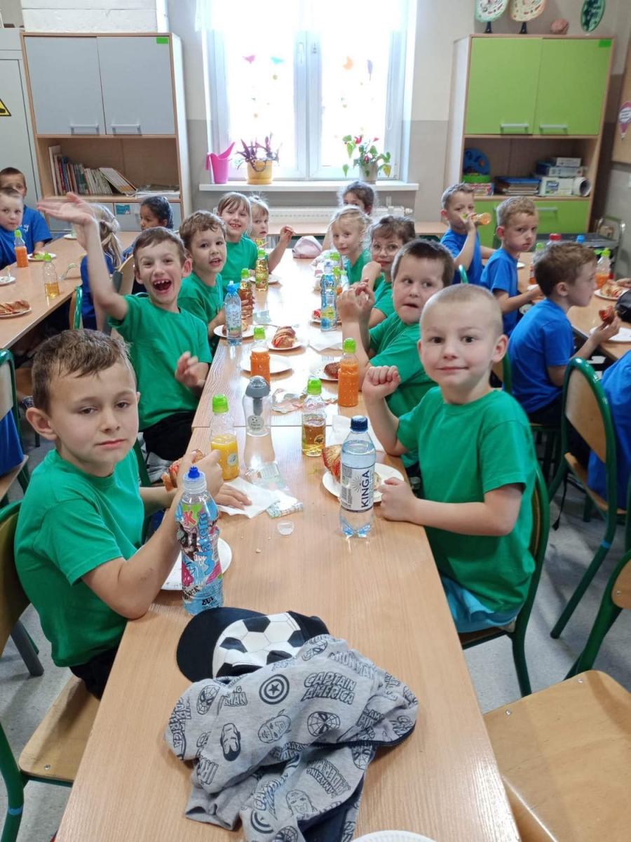 Pani Dyrektor powitała serdecznie wszystkich uczestników zmagań, a dzieci z oddziału przedszkolnego "Mądre Sówki" zaprezentowały taniec piratów, po którym drużyny przedstawiły swoje plakaty z hasłem zachęcającym do uprawiania sportu.