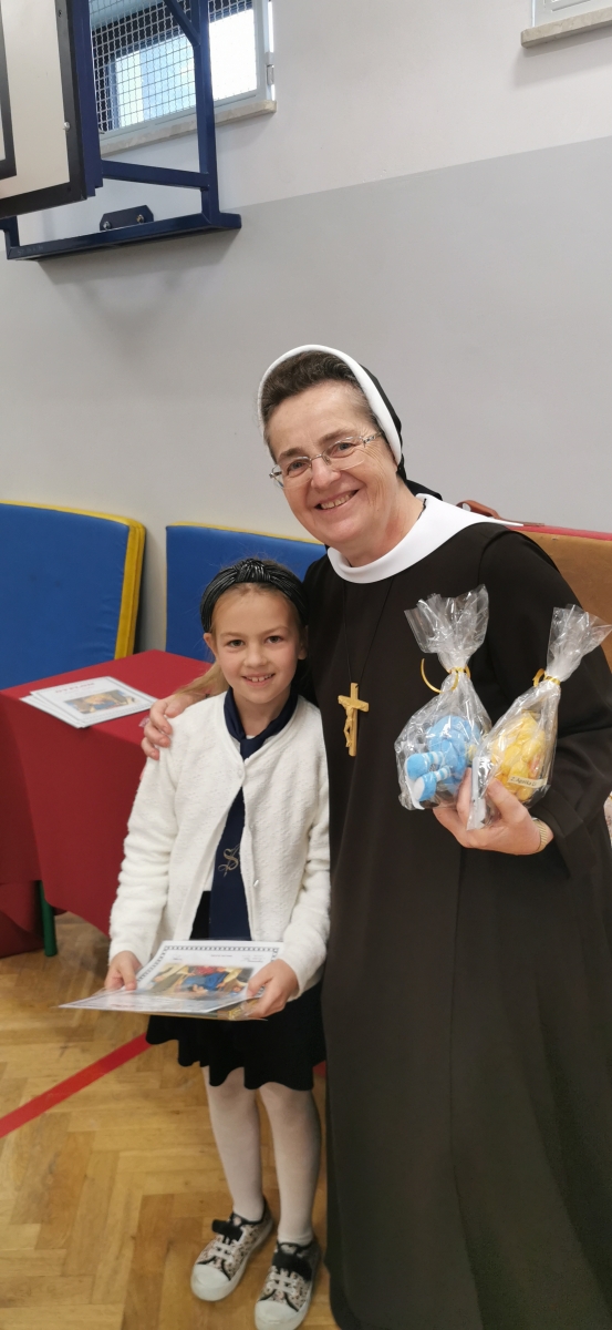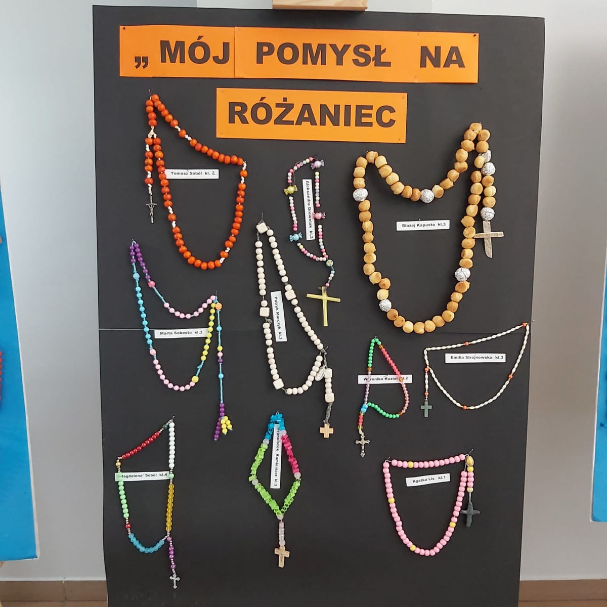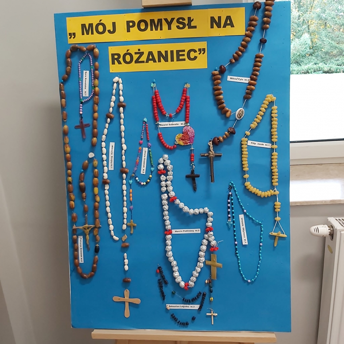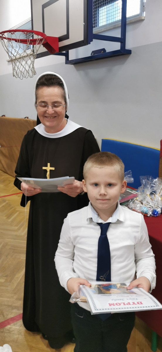 Miesiąc październik jest poświęcony modlitwie różańcowej. W związku z tym powstała idea konkursu „Mój pomysł Na Różaniec”. Konkurs adresowany był do wszystkich uczniów klas 1-4 naszej szkoły. Celem konkursu było : zachęcenie uczniów do głębszego przeżywania modlitwy różańcowej w kościele, a także w rodzinnych domach , pobudzenie wyobraźni i aktywności twórczej, rozwój talentów u uczniów , promowanie młodych talentów. Różaniec można było wykonać w formie przestrzennej z wykorzystaniem różnych technik i materiałów. Do konkursu zgłosiło swoje prace 30 uczniów. Jury- członkiniami którego była S. Miriam i Pani Elżbieta Nęcka z podziwem oceniło wszystkie pomysłowe prace. Ze wszystkich prac konkursowych została przygotowana wystawa w naszej szkole. W galerii tegorocznych różańców znalazły się: owoce dzikiej róży, plastikowe słomki, kasztany, fasola, żołędzie, makaron, ziarenka kawy, modelina, folia aluminiowa, a także różnego rodzaju koraliki. Siostra Miriam jako organizatorka konkursu po uroczystym Apelu w czwartek 19.pażdziernika uroczyście wręczyła wszystkim uczestnikom pamiątkowe dyplomy wraz z nagrodami. Społeczność szkolna zaś obdarowała laureatów gromkimi brawami.