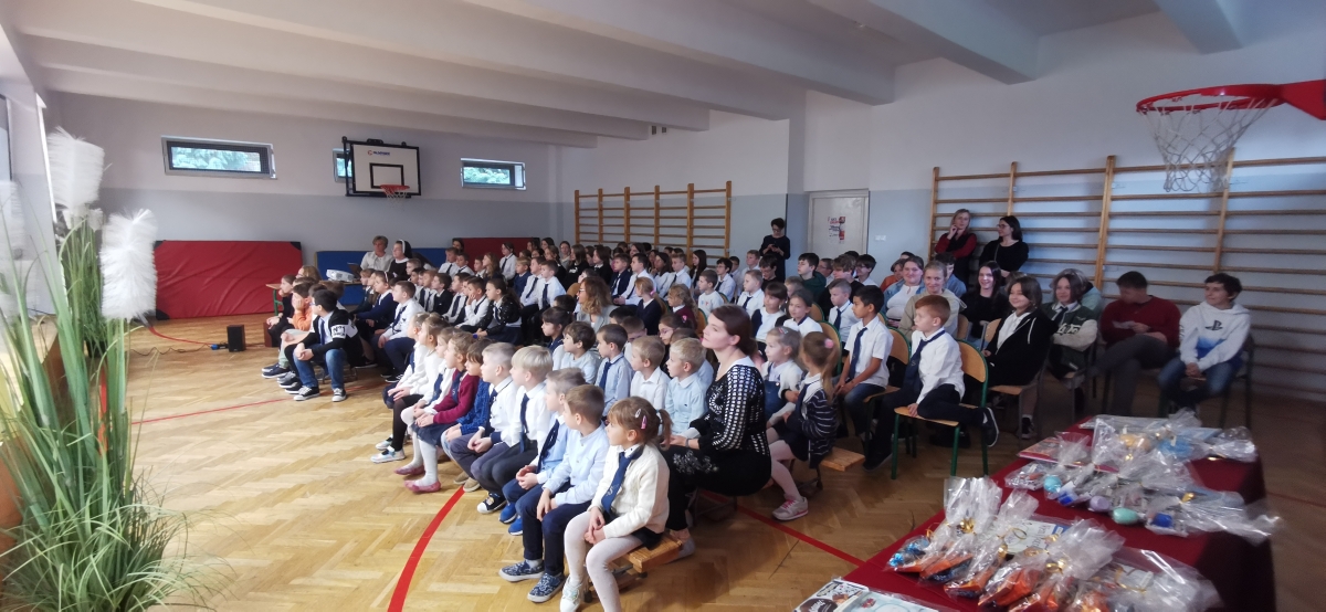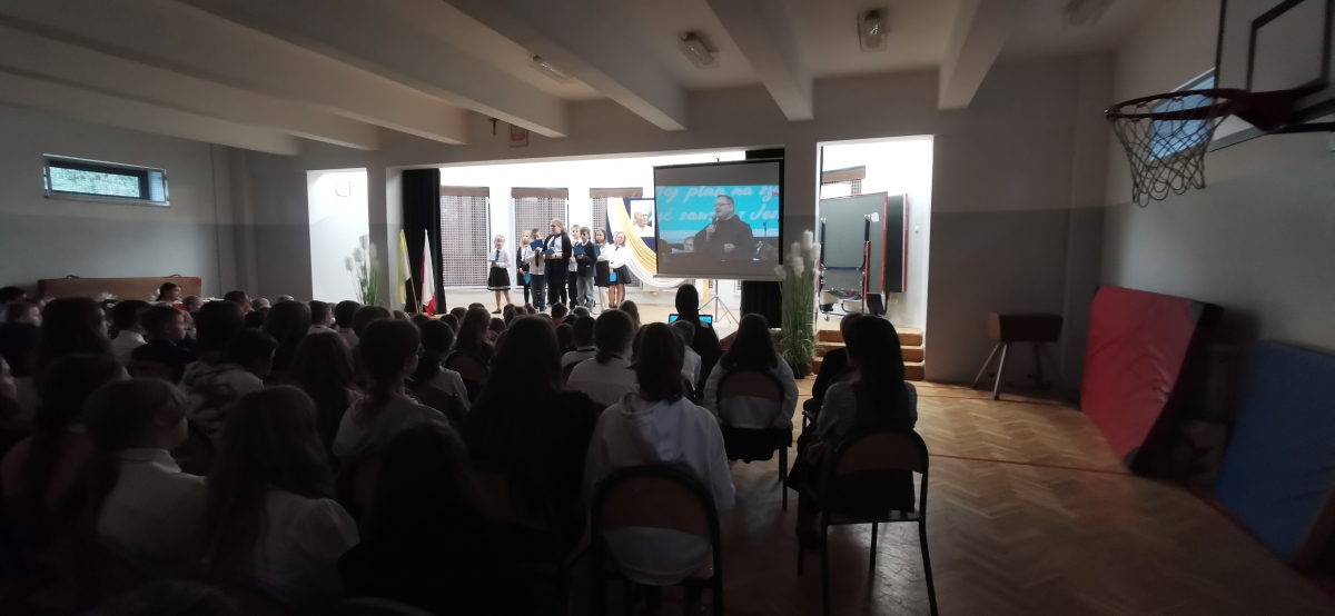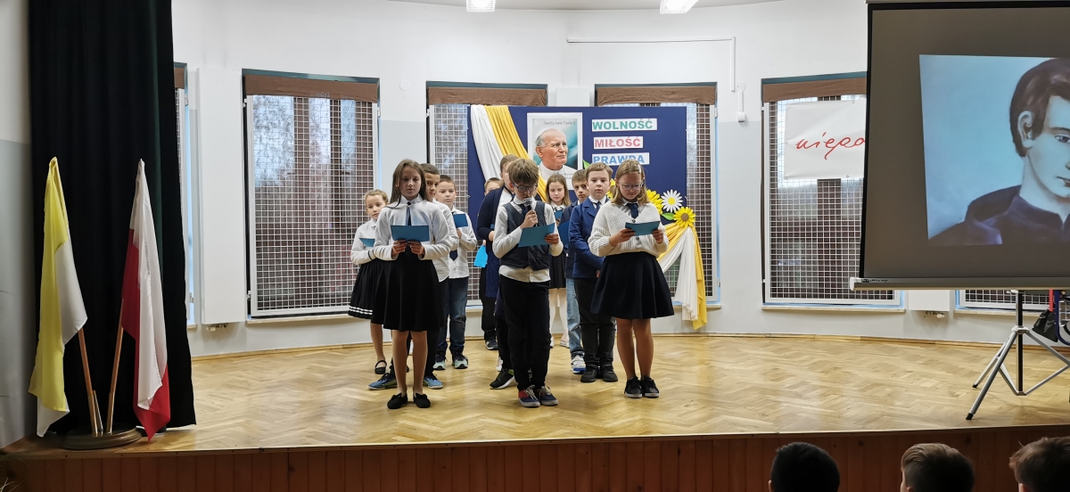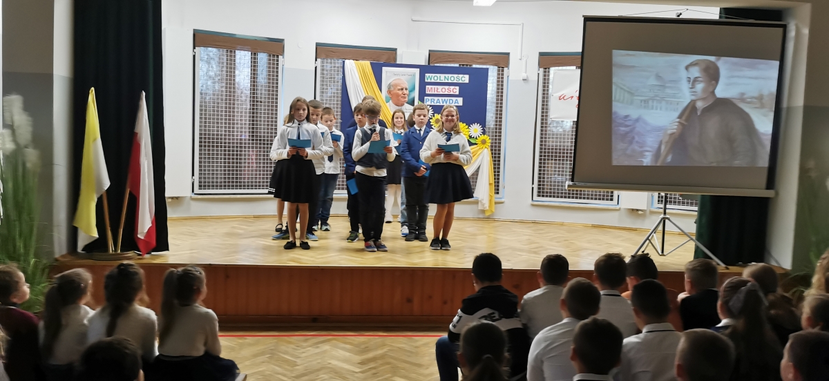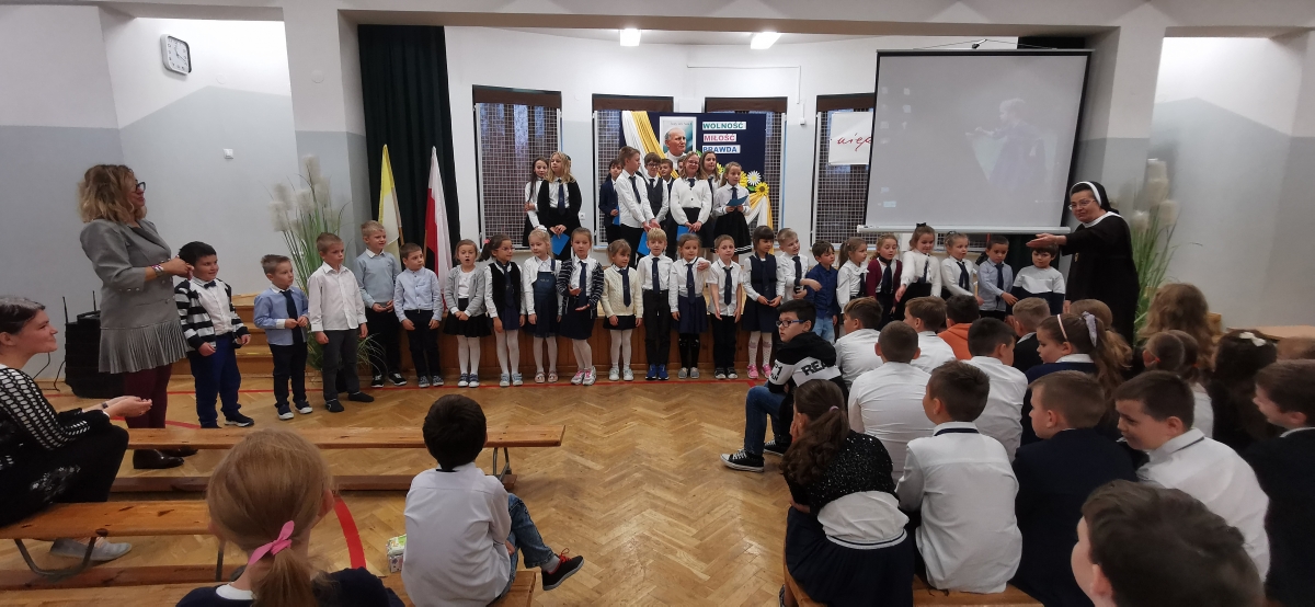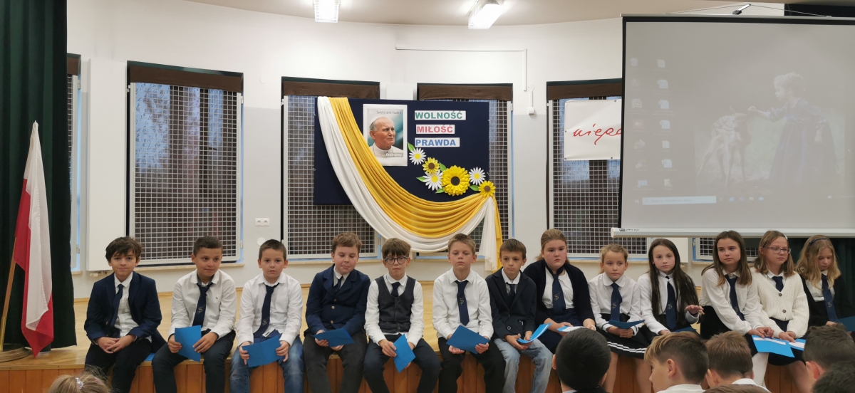 19 października 2022 r. w naszej szkole świętowaliśmy obchody XXII Dnia Papieskiego i 44. rocznicę wyboru papieża Jana Pawła II. Uczniowie z klasy czwartej pod przewodnictwem Siostry Miriam przygotowali apel zatytułowany „Blask Prawdy”. Całość wystąpienia podzielona była na trzy akty – trzy pojęcia, które najczęściej przewijają się w encyklice „Veritatis splendor”, tj. Prawda, Miłość i Wolność. Każdej części towarzyszył przewodnik - uczeń grający jednego ze świętych patronów dzieci i młodzieży. Prawda – św. Stanisław Kostka, Miłość – bł. Carlo Acutis, Wolność – św. Tarsycjusz. Na zakończenie występu dzieci z oddziału przedszkolnego „Mądre Sówki” razem z S. Miriam zaśpiewały piosenkę „ Taki duży , taki mały…” ilustrując ją gestami. Uczniowie naszej szkoły przyszli w strojach galowych, aby w ten sposób wyrazić szacunek i wdzięczność św. Janowi Pawłowi II.