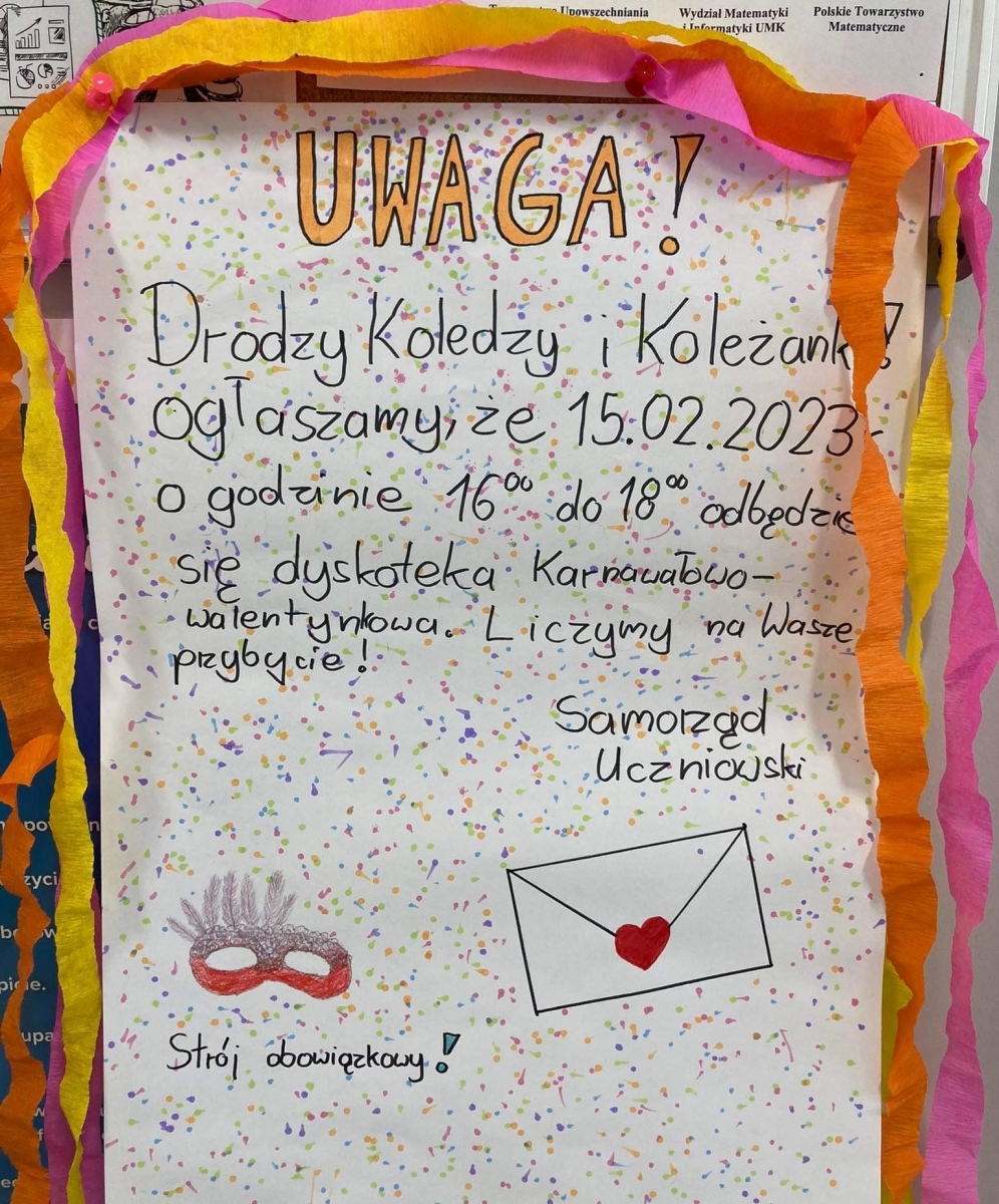 “Jest karnawał, muszą być tańce!”- z takiego właśnie założenia wyszedł Samorząd Uczniowski, który 15 lutego o godz. 16 - 18 organizuje KARNAWAŁOWO - WALENTYNKOWĄ dyskotekę szkolną dla uczniów klas IV - VIII.