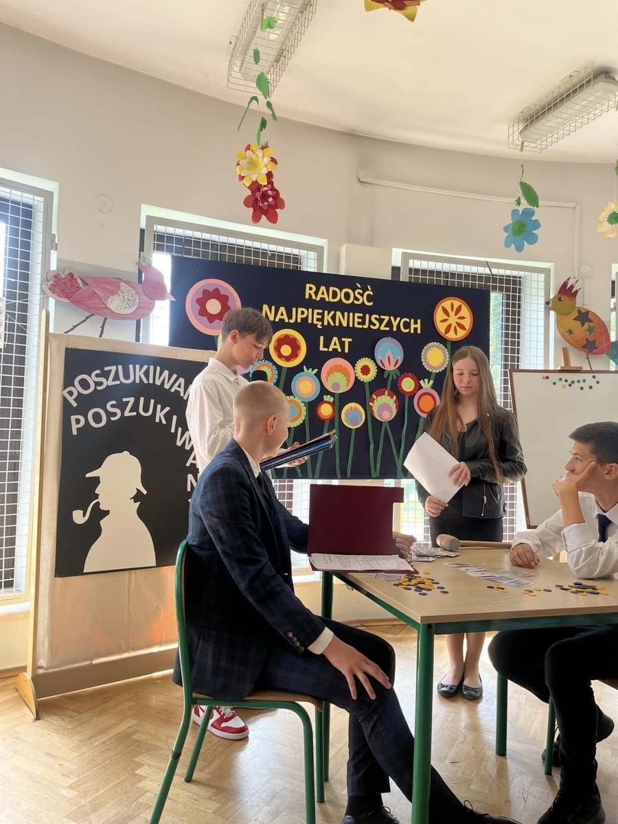 Uczniowie klasy siódmej pożegnali ósmoklasistów w humorystycznej scence „Poszukiwany, poszukiwana”, w której zostały podkreślone mocne strony absolwentów oraz to, w jaki sposób zapadną nam wszystkim w pamięci. Ósmoklasiści otrzymali szarfy oraz upominki, które mają im przypominać o wspólnie spędzonym czasie w szkole podstawowej. Ci uczniowie na zawsze pozostaną w naszej pamięci i sercach.