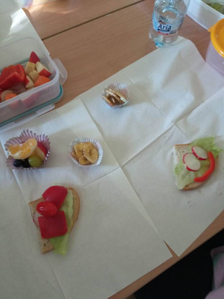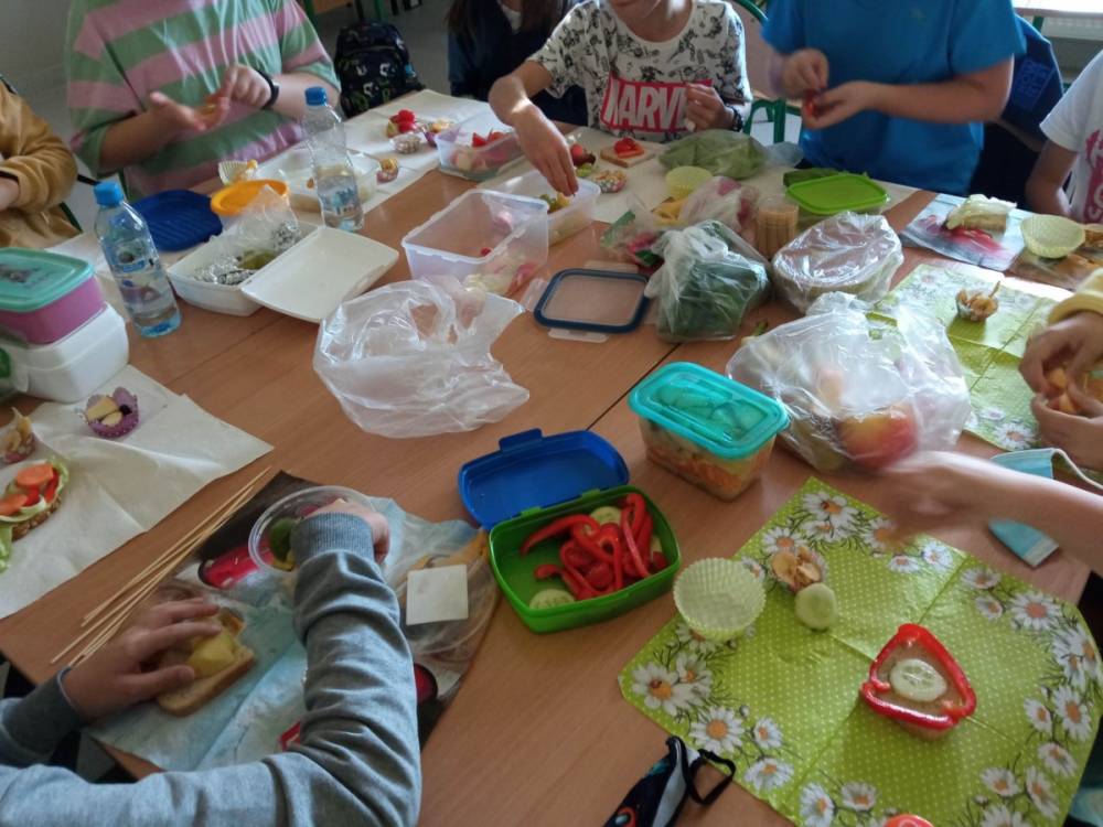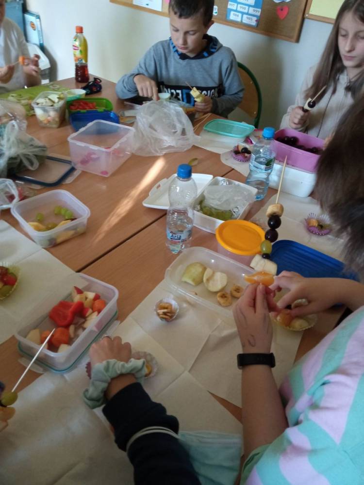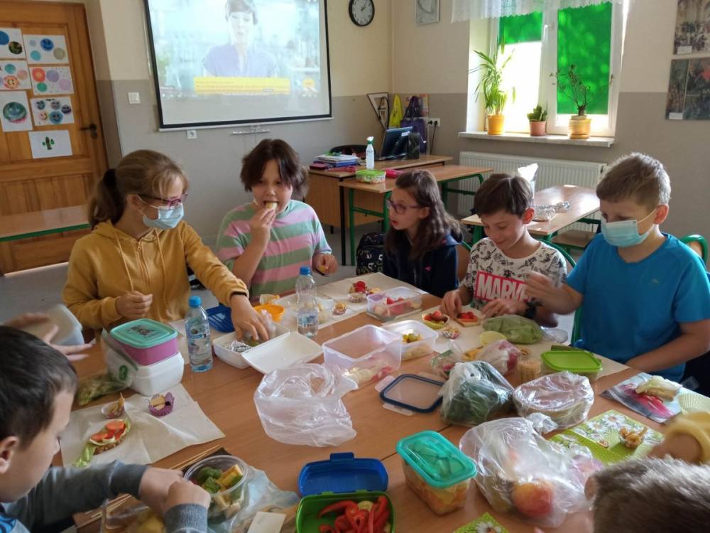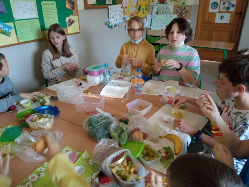 Po teorii przyszedł czas na praktykę. Czwartoklasiści zasiedli do stołu i zjedli wspólnie zdrowe drugie śniadanie.