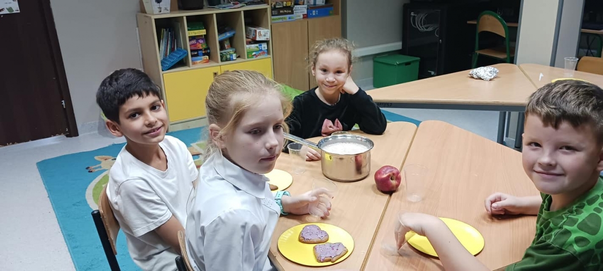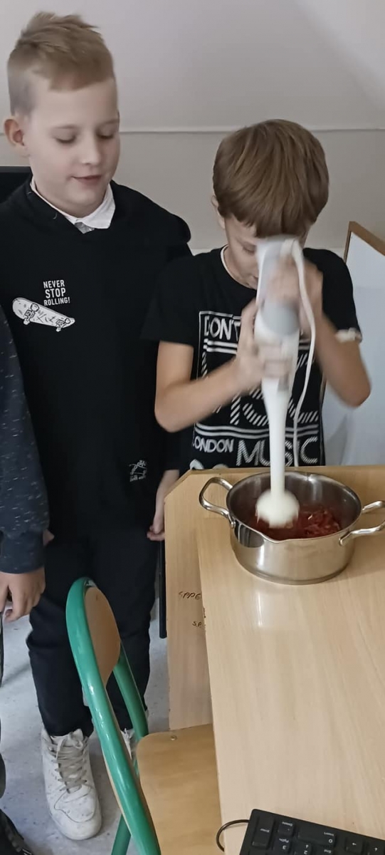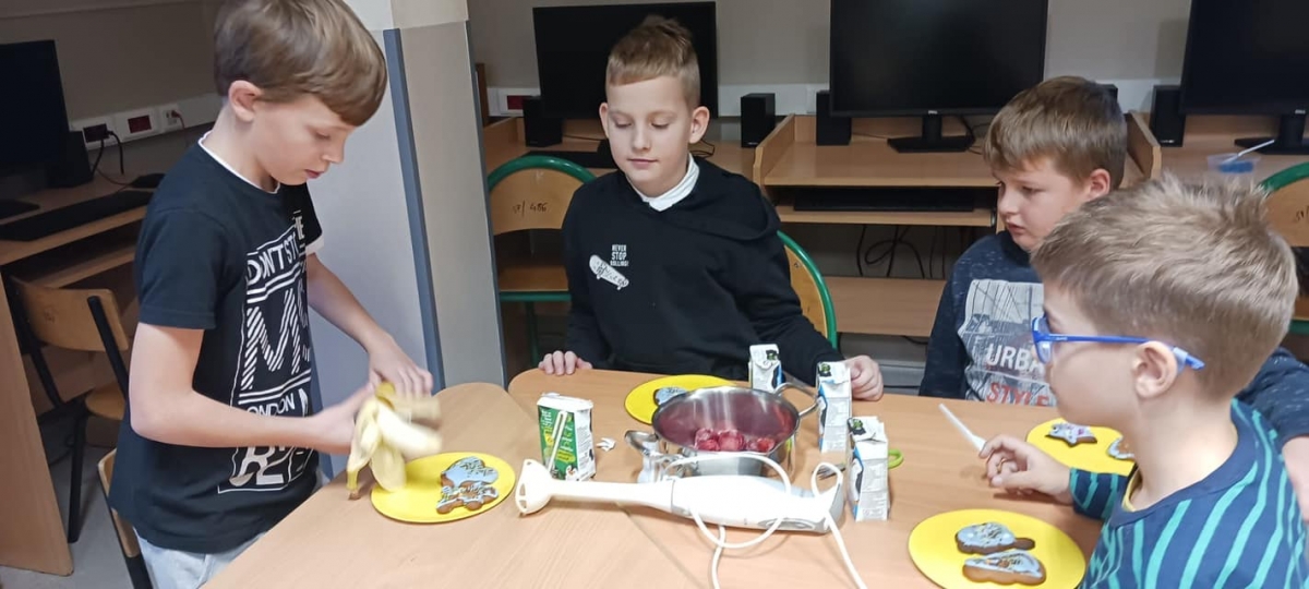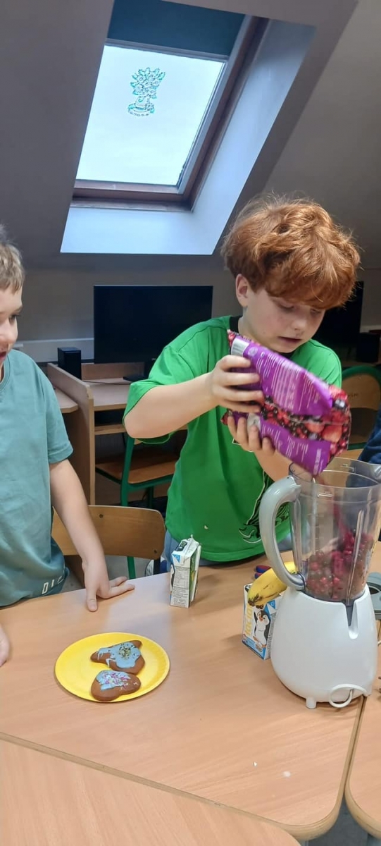 W ramach propagowania zdrowego trybu życia, w naszej szkole odbyła się kolejna odsłona programu "Forma i zdrowie". Na początku uczniowie obejrzeli prezentację multimedialną dotyczącą zasad klasyfikowania żywności ze względu na ich wartość zdrowotną. Przypomniały sobie również pięć zasad zdrowego odżywiania oraz zapoznały się z Piramidą Zdrowia. Po zajęciach teoretycznych przyszła kolej na zadania praktyczne. Uczniowie skomponowali swoje talerze zdrowia. Dodatkowo uczniowie klasy III przygotowali pyszne i zdrowe koktajle z owoców i mleka. Degustacja koktajli oraz własnoręcznie upieczonych przez rodziców pierniczków była niezwykle przyjemna.