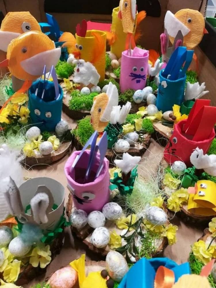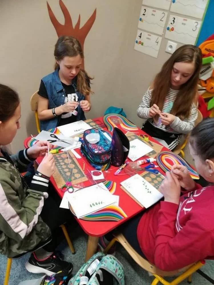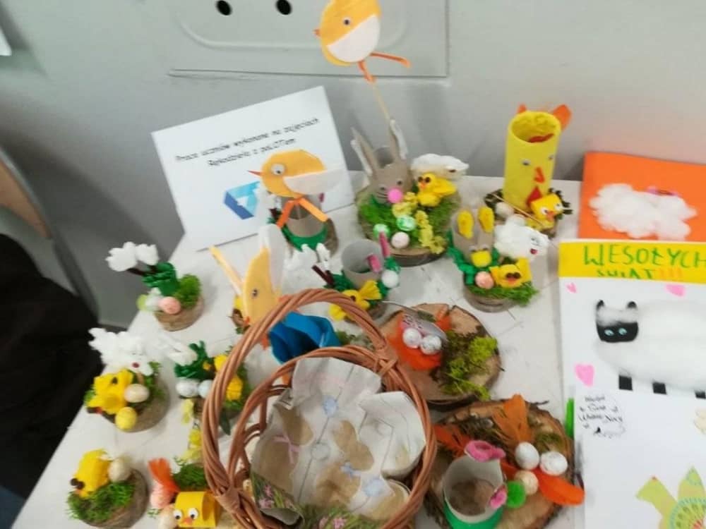 Kiermasz świąteczny, na stoisku opatrzonym logo Kraków Airport stroiki i kartki okolicznościowe przygotowane przez uczestników zajęć Rękodzieło z poLOTem, które funkcjonuje w naszej szkole dzięki wsparciu Kraków Airport