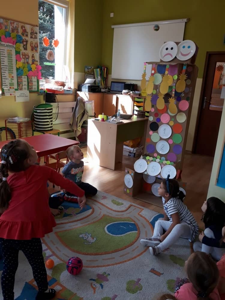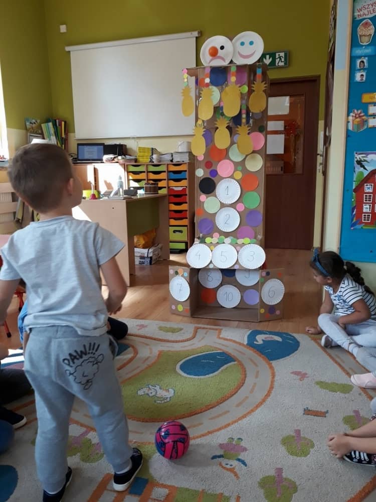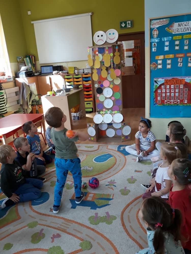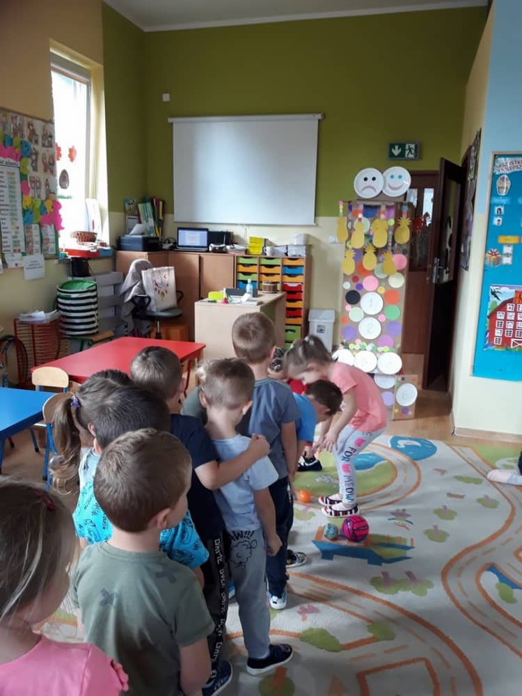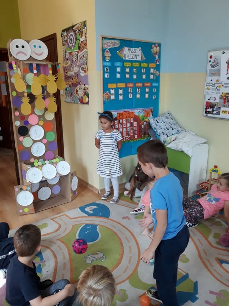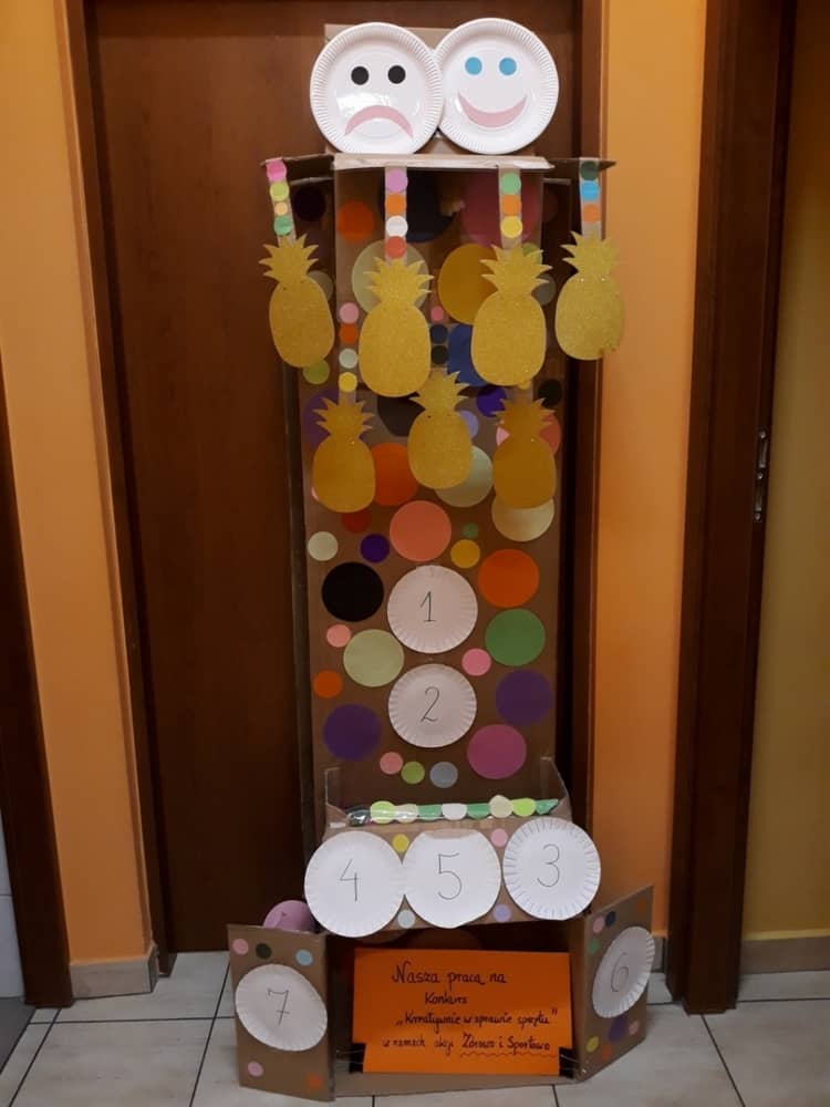 Nasze przedszkole w roku szkolnym 2019/2020 zaangażowało się w ogólnopolską Akcję „Zdrowo i sportowo”. Przystąpiło do niej 2100 przedszkoli c całej Polski. W ramach rocznego programu wzięliśmy udział w konkursie „Kreatywnie w sprawie sprzętu”. W połowie września nauczycielka Agnieszka Karcz wykonała wielofunkcyjny sprzęt sportowy, który pozwala dzieciom ćwiczyć celność rzutu, strzał na bramkę, rzut do kosza oraz dodatkowo pozwala utrwalać kolory i liczby w zakresie 10. Projekt ten został nagrodzony wyróżnieniem specjalnym w konkursie oraz nagrodą rzeczową - Piłką piankową turnball SLOW BALL ARTENGO. Równie ważne jest to, iż dzieci chętnie korzystają ze sprzętu, czerpiąc z tego wiele radości i pozytywnych, sportowych emocji. Wyróżnienie w konkursie zapewne zaowocuje udziałem w kolejnych.
