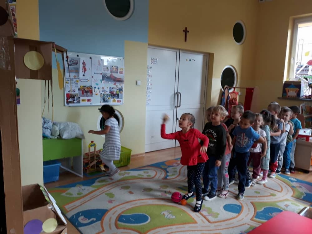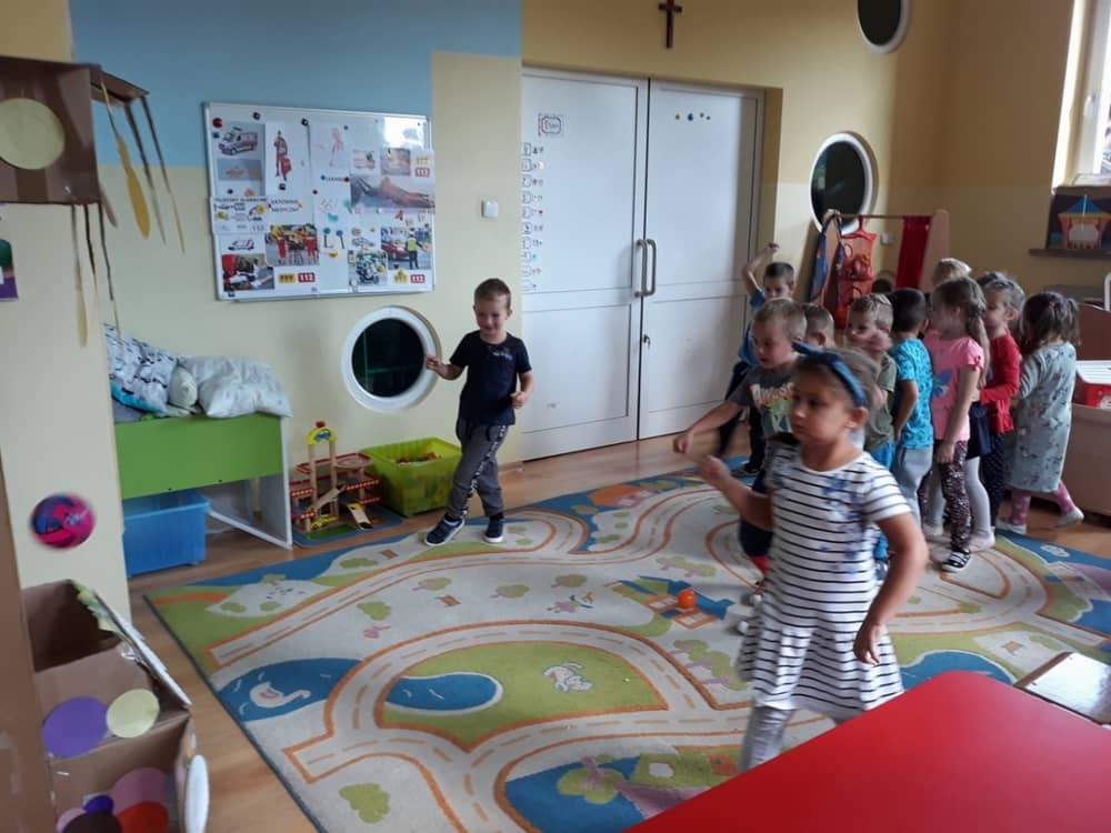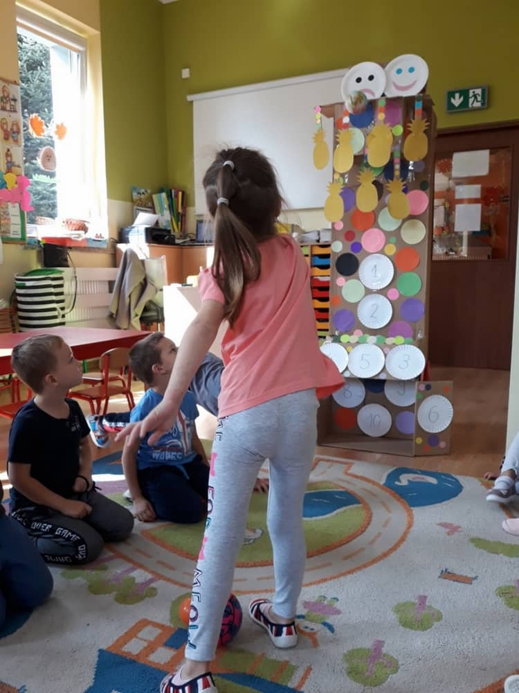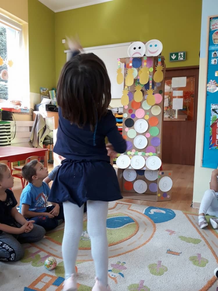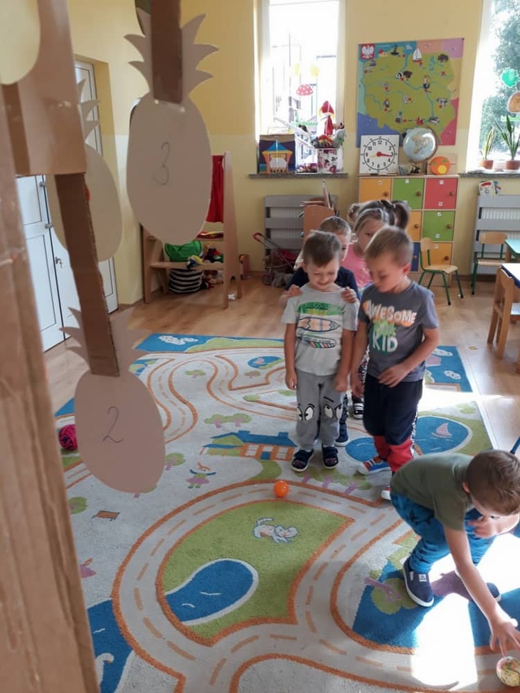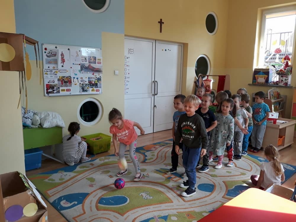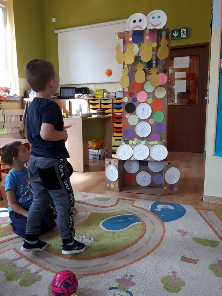 Nasze przedszkole w roku szkolnym 2019/2020 zaangażowało się w ogólnopolską Akcję „Zdrowo i sportowo”. Przystąpiło do niej 2100 przedszkoli c całej Polski. W ramach rocznego programu wzięliśmy udział w konkursie „Kreatywnie w sprawie sprzętu”. W połowie września nauczycielka Agnieszka Karcz wykonała wielofunkcyjny sprzęt sportowy, który pozwala dzieciom ćwiczyć celność rzutu, strzał na bramkę, rzut do kosza oraz dodatkowo pozwala utrwalać kolory i liczby w zakresie 10. Projekt ten został nagrodzony wyróżnieniem specjalnym w konkursie oraz nagrodą rzeczową - Piłką piankową turnball SLOW BALL ARTENGO. Równie ważne jest to, iż dzieci chętnie korzystają ze sprzętu, czerpiąc z tego wiele radości i pozytywnych, sportowych emocji. Wyróżnienie w konkursie zapewne zaowocuje udziałem w kolejnych.