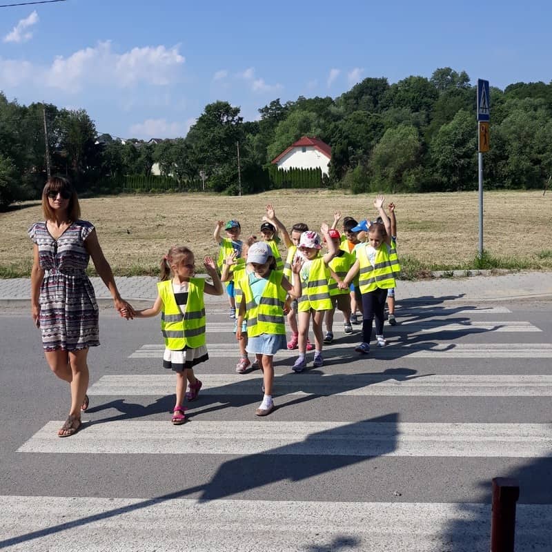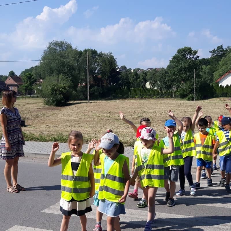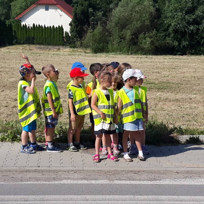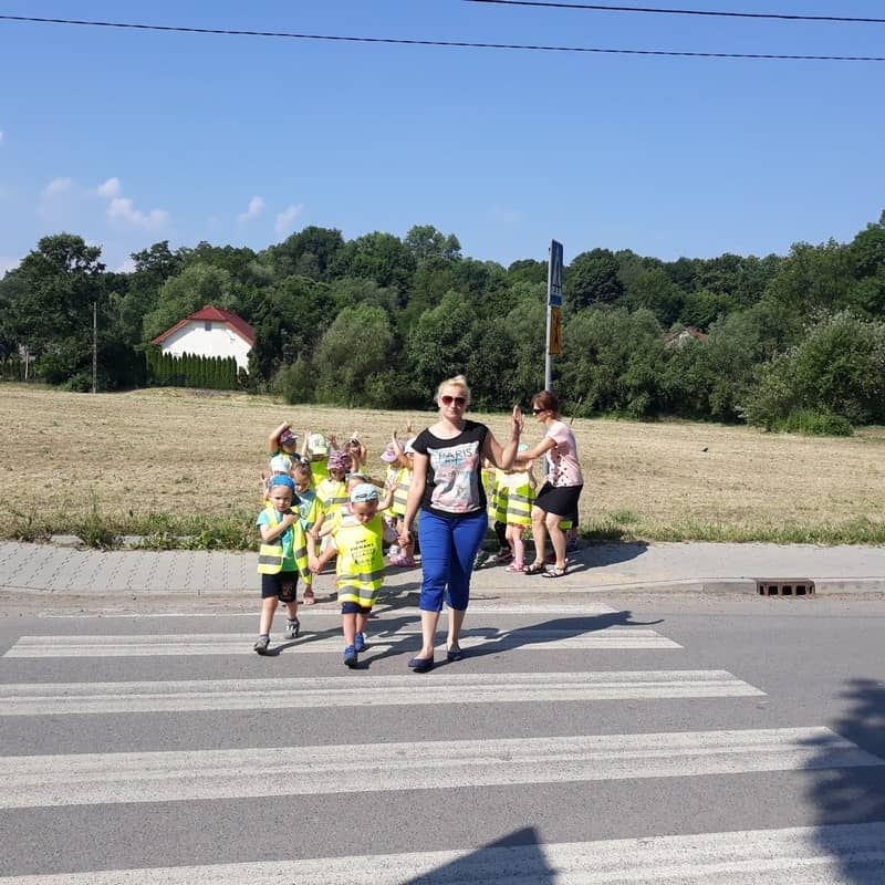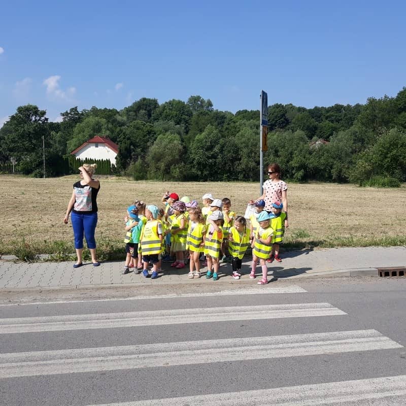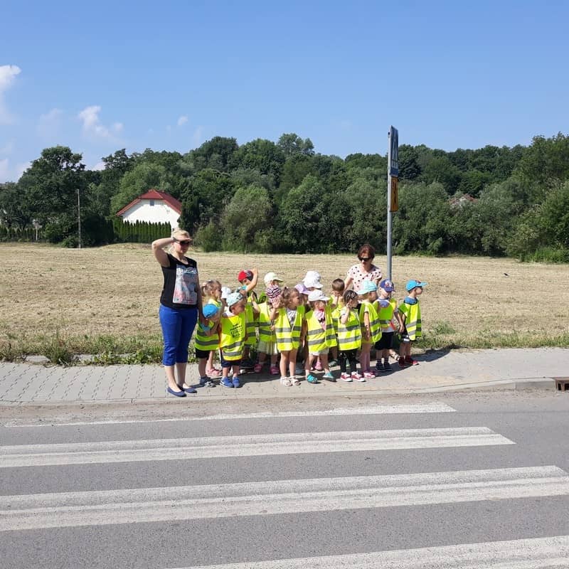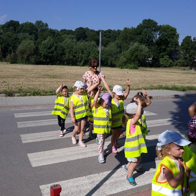 W dniu 29.05.2018 roku wszystkim przedszkolakom zostały przypomniane zasady bezpiecznego poruszania się na drodze, przejścia przez jezdnię po pasach, konieczności noszenia kamizelek odblaskowych w celu lepszej widoczności na drodze oraz korzystania z chodnika lub pobocza. Zdobytą wiedzę dzieci wykorzystują podczas spacerów oraz wycieczek, a także podczas codziennej zabawy.
