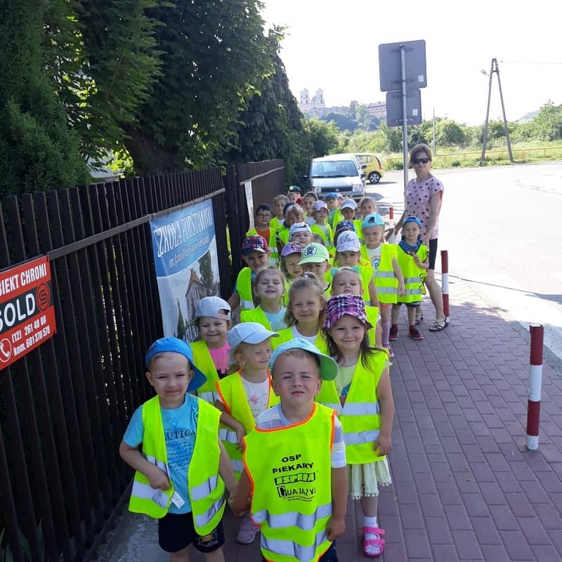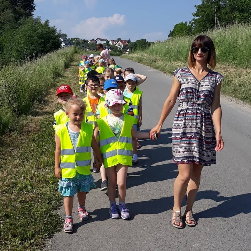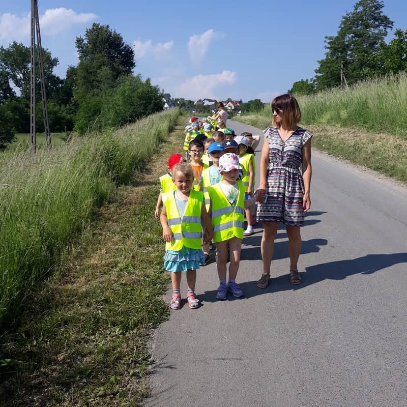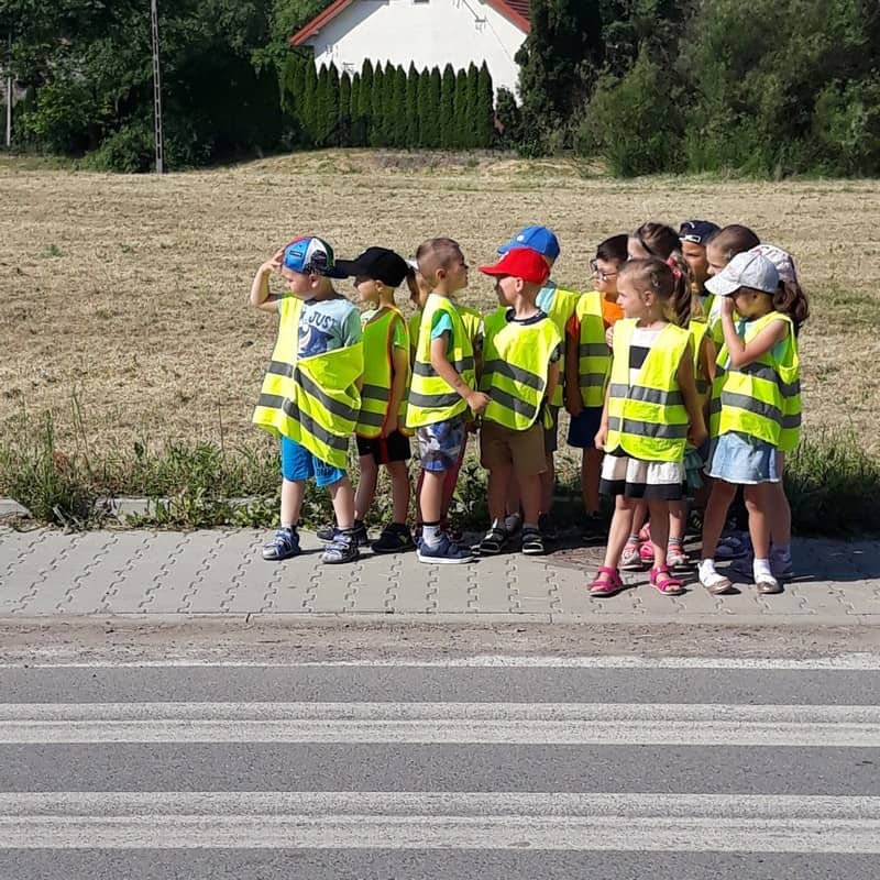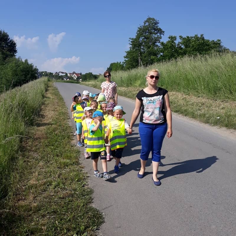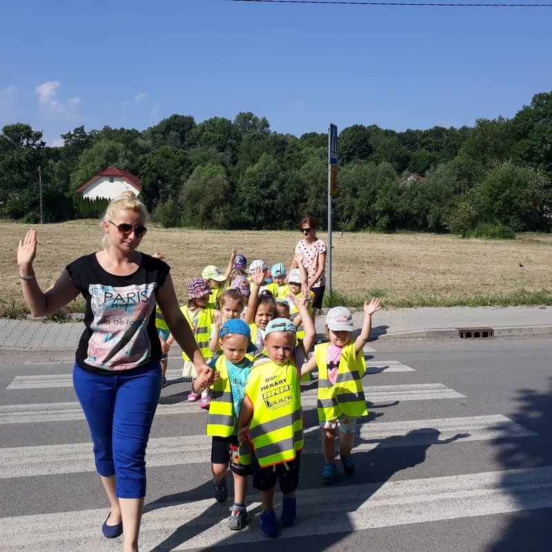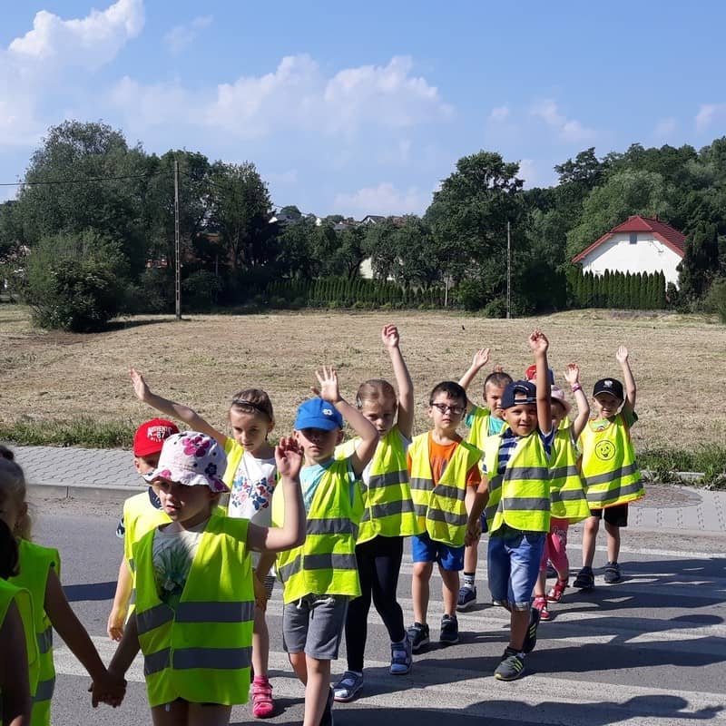 W dniu 29.05.2018 roku wszystkim przedszkolakom zostały przypomniane zasady bezpiecznego poruszania się na drodze, przejścia przez jezdnię po pasach, konieczności noszenia kamizelek odblaskowych w celu lepszej widoczności na drodze oraz korzystania z chodnika lub pobocza. Zdobytą wiedzę dzieci wykorzystują podczas spacerów oraz wycieczek, a także podczas codziennej zabawy.