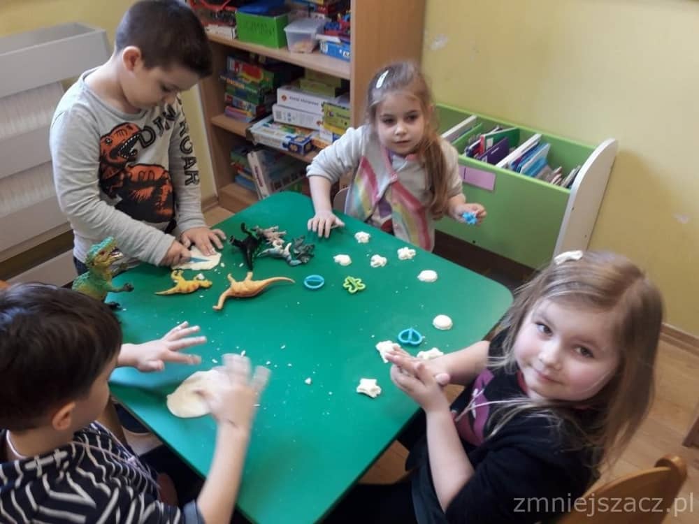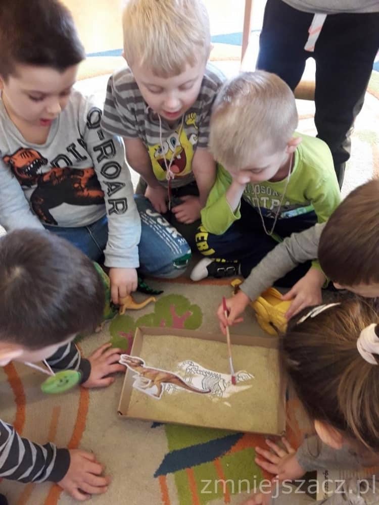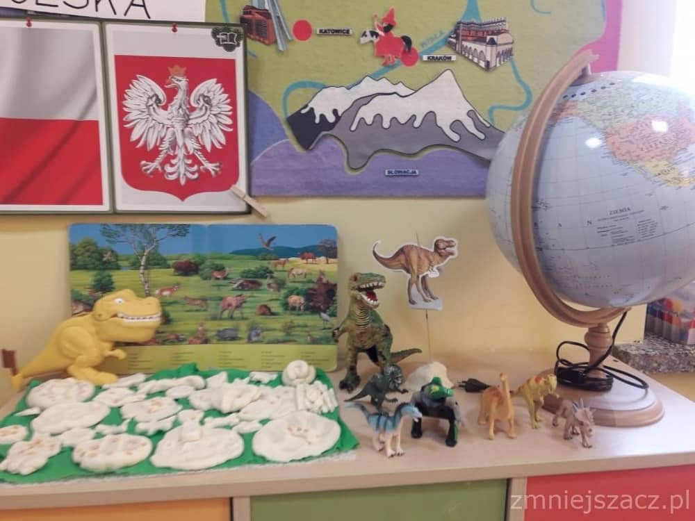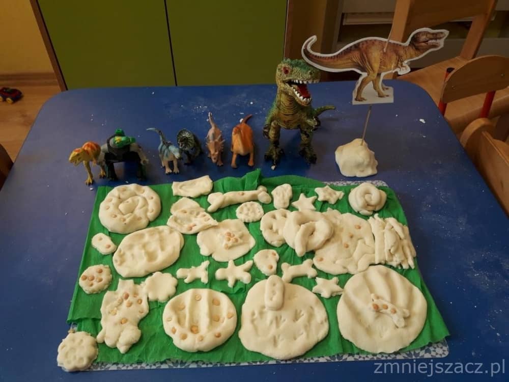 Dnia 26 lutego obchodziliśmy Dzień Dinozaura. Choć dinozaury dawno już wyginęły to nie przestają fascynować ludzi w tym w sposób szczególny dzieci z naszego przedszkola. Święto tych prehistorycznych stworzeń można spędzić na wiele sposobów – poczytać o ich zwyczajach albo oglądnąć kolekcje miniaturowych dinozaurów. Nasi przedszkolacy znają wiele ciekawostek o życiu dinozaurów, ich nazwach, wielkości, o tym gdzie mieszkają i czym się żywią. Dzieci bawiły się w paleontologa, odkrywając szkielet dinozaura ukryty w piasku. Następnie lepiły z masy solnej i odbijały różne ślady z tamtych czasów. Na koniec słuchały piosenki o 10 dinozaurach.