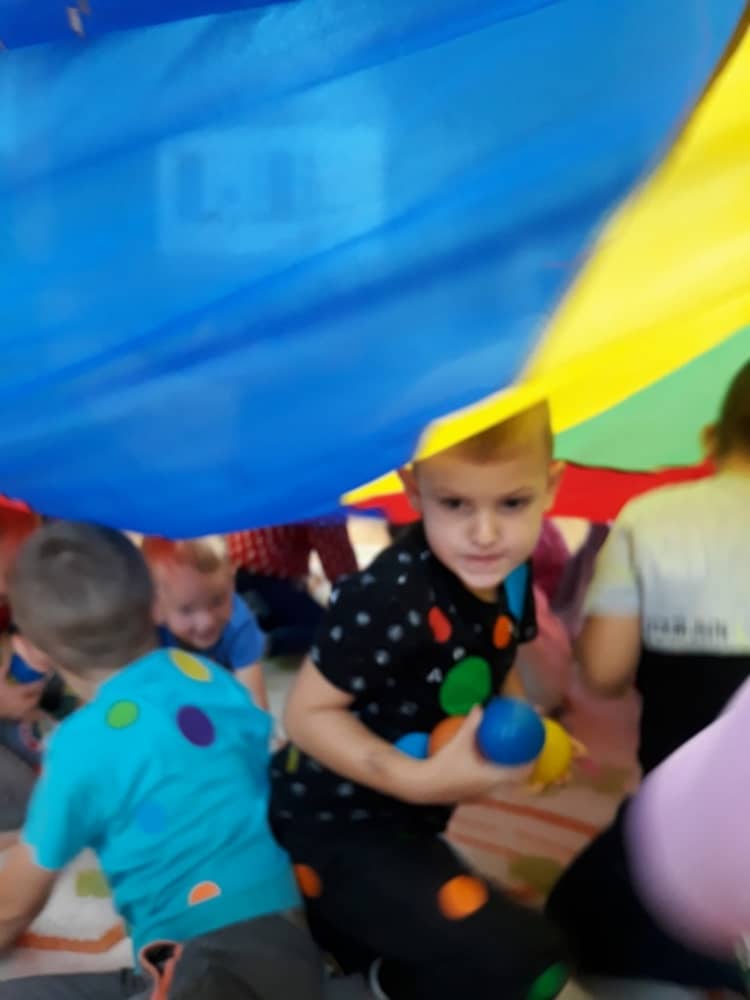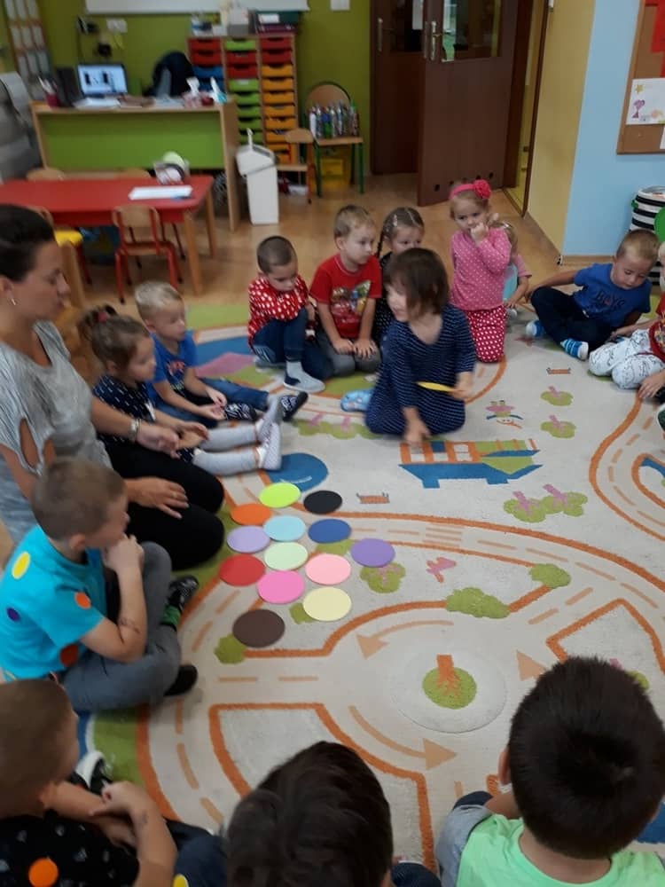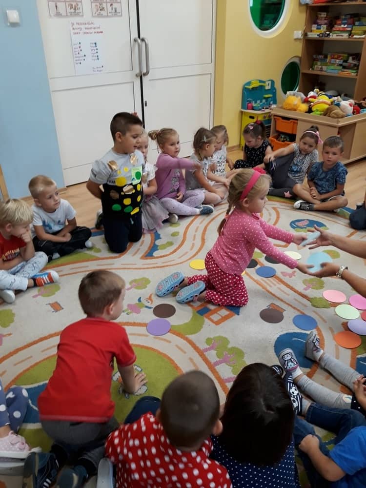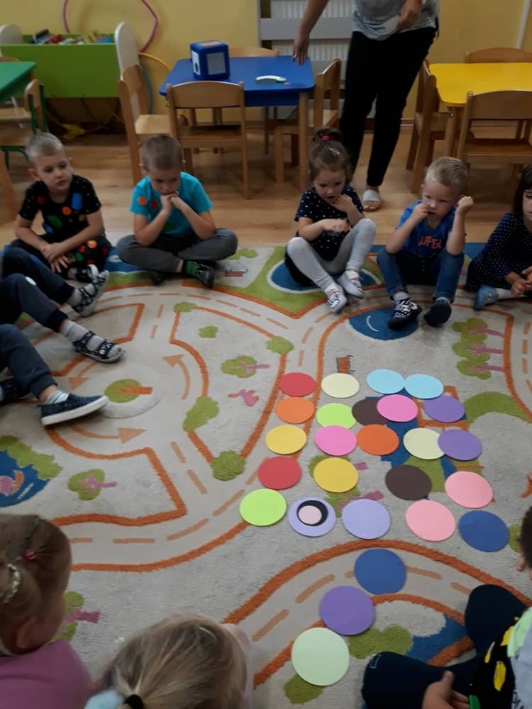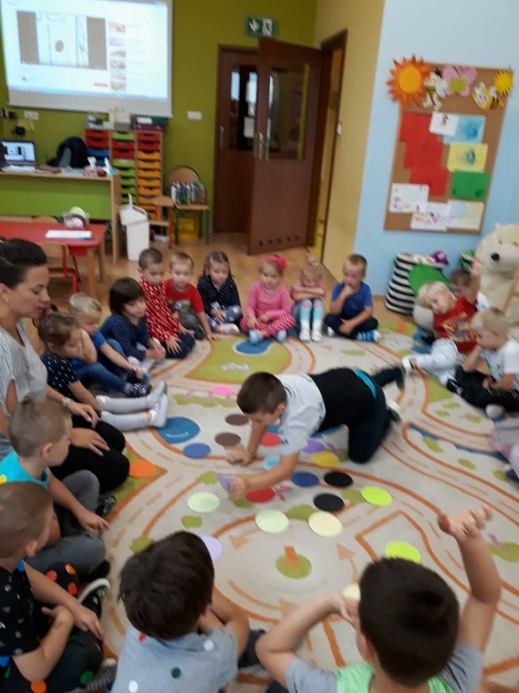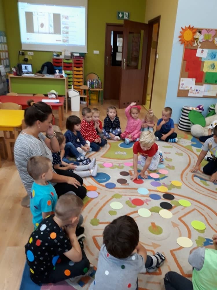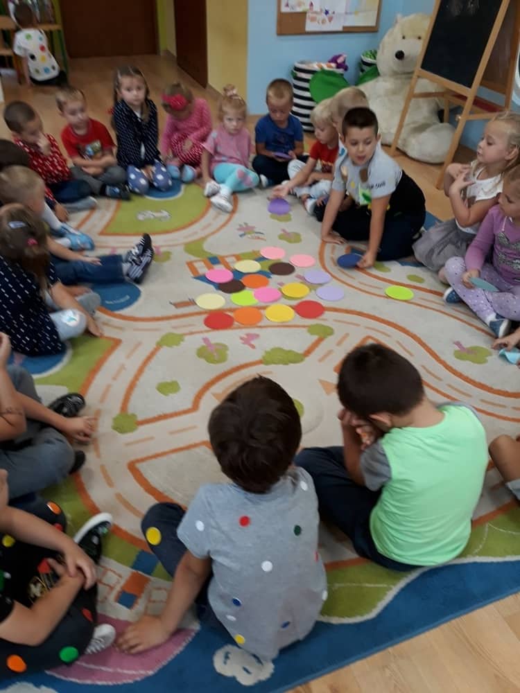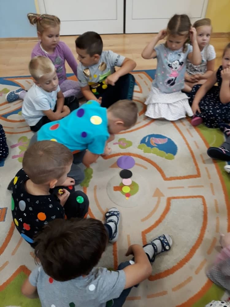 W dniu 14.09.2018 w naszym przedszkolu obchodziliśmy DZIEŃ KROPKI. Prawie wszystkie obecne dzieci miały na swoich ubraniach różnokolorowe kropki, a w przedszkolu poruszały się szlakiem różnokolorowych filcowych kół. W trakcie zajęć dzieci poznały bohaterkę książki Vasthi, dla której Kropka stała się motywacją w życiu, by uwierzyć w swoje możliwości. Następnie dzieci z radością i entuzjazmem uczestniczyły w zabawie muzyczno- ruchowej z chustą animacyjną i piłeczkami. Układały na dywanie wspólną kompozycje z kolorowych kół. W trakcie „Zabawy z kropeczkami” dzieci z obu grup szukały ukrytych w Sali kropek. Dodatkowo odbyły się „Zabawy matematyczne”: •przeliczanie