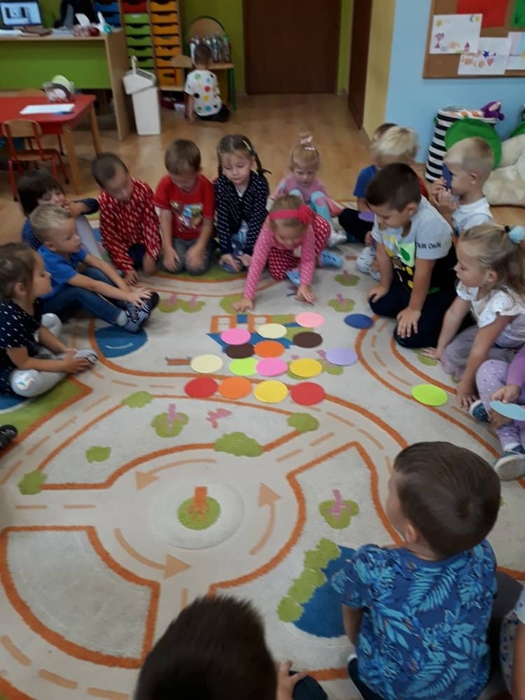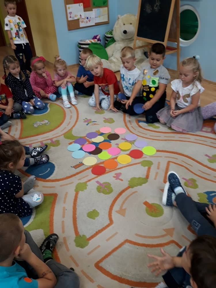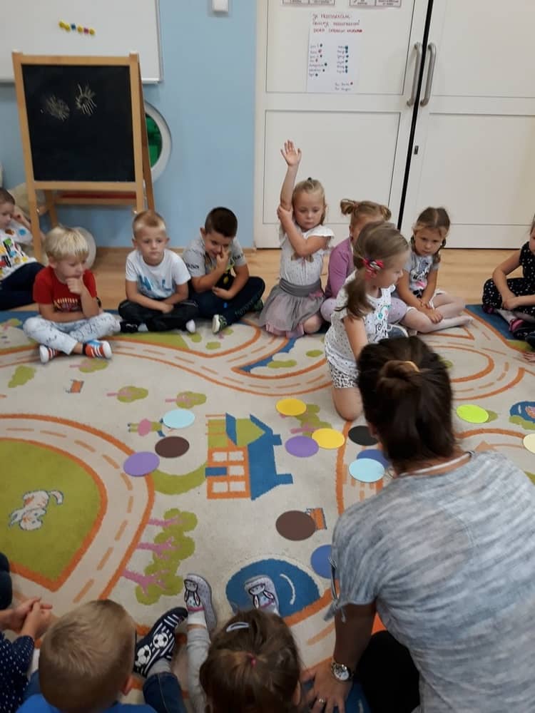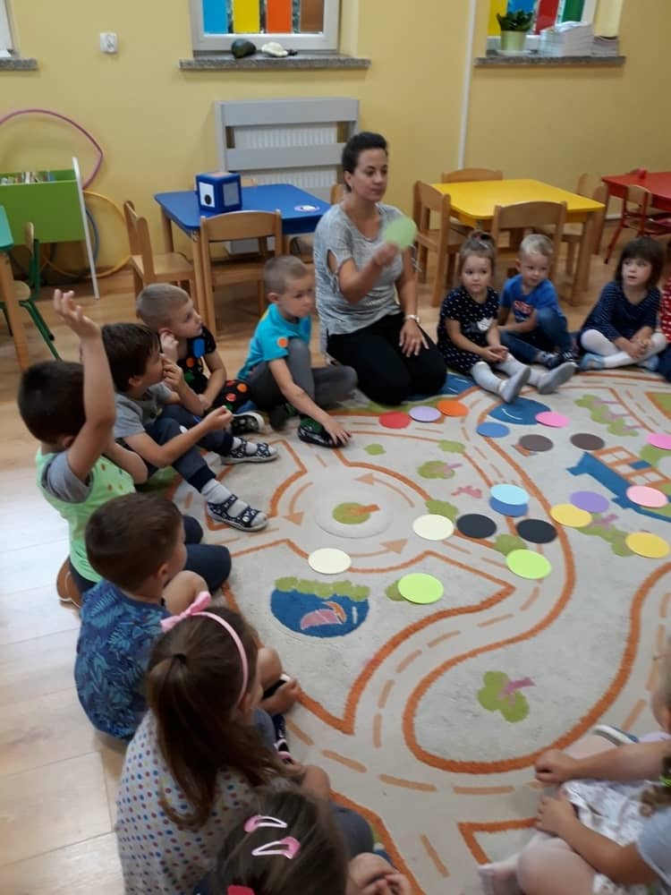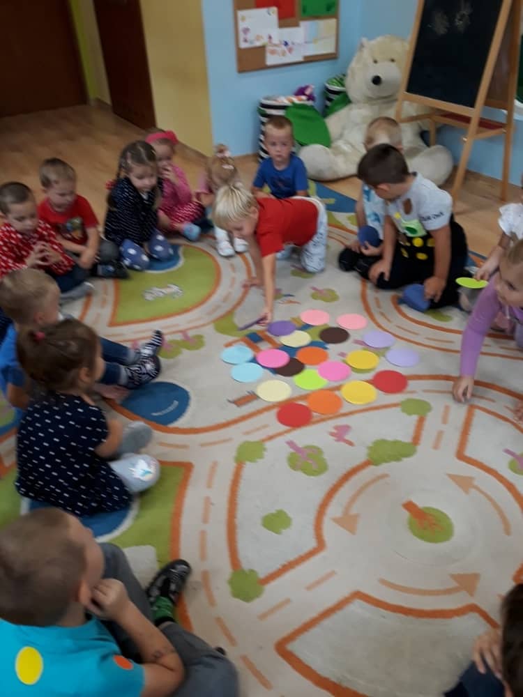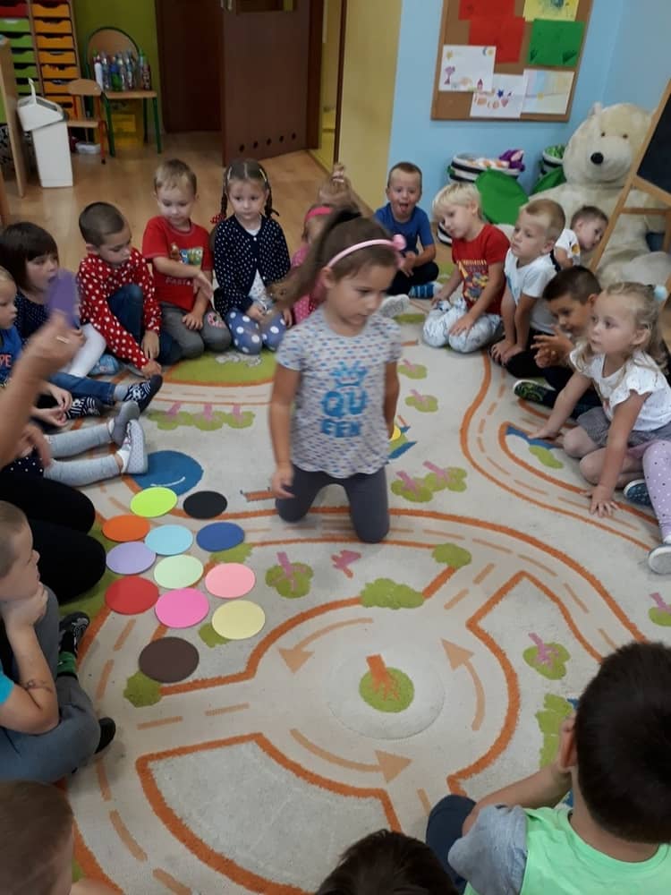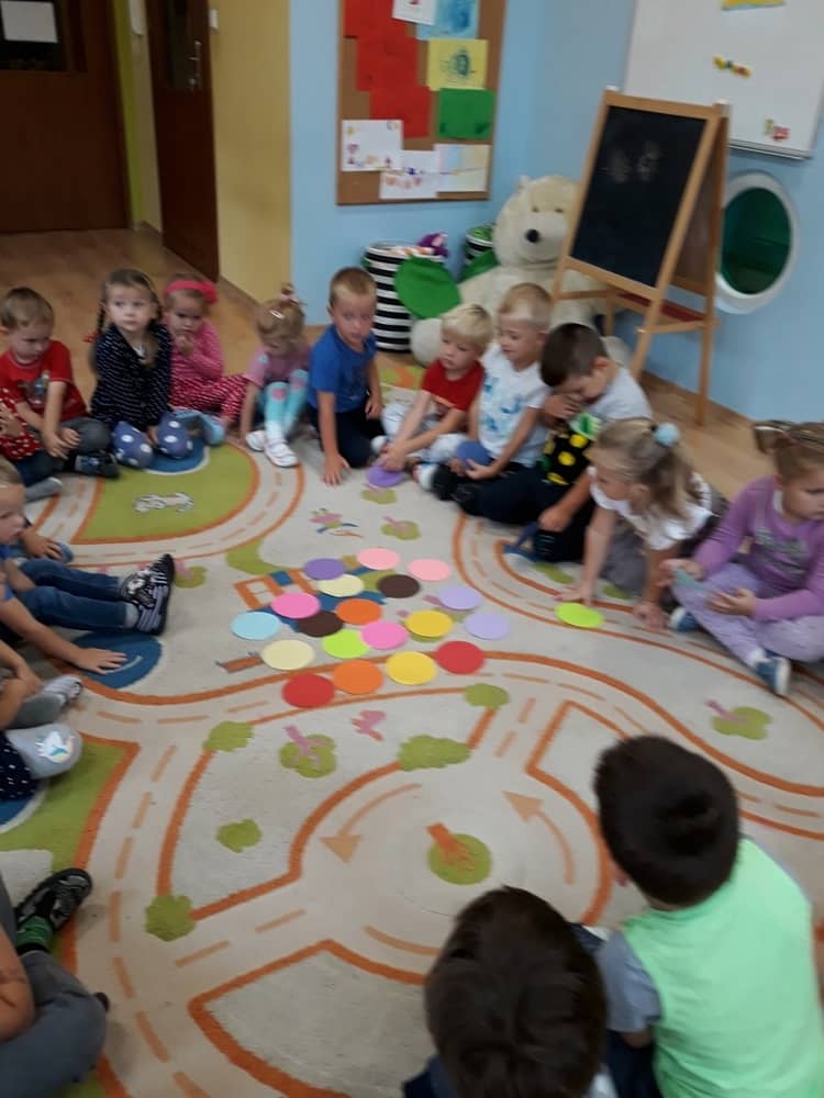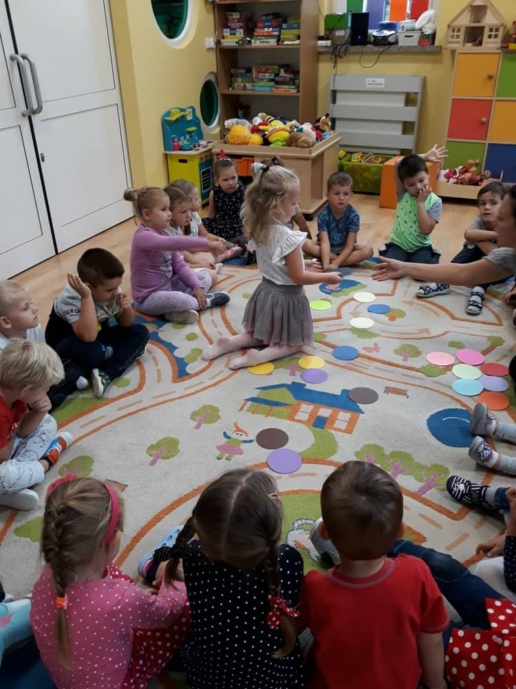W dniu 14.09.2018 w naszym przedszkolu obchodziliśmy DZIEŃ KROPKI. Prawie wszystkie obecne dzieci miały na swoich ubraniach różnokolorowe kropki, a w przedszkolu poruszały się szlakiem różnokolorowych filcowych kół. W trakcie zajęć dzieci poznały bohaterkę książki Vasthi, dla której Kropka stała się motywacją w życiu, by uwierzyć w swoje możliwości. Następnie dzieci z radością i entuzjazmem uczestniczyły w zabawie muzyczno- ruchowej z chustą animacyjną i piłeczkami. Układały na dywanie wspólną kompozycje z kolorowych kół. W trakcie „Zabawy z kropeczkami” dzieci z obu grup szukały ukrytych w Sali kropek. Dodatkowo odbyły się „Zabawy matematyczne”: •przeliczanie