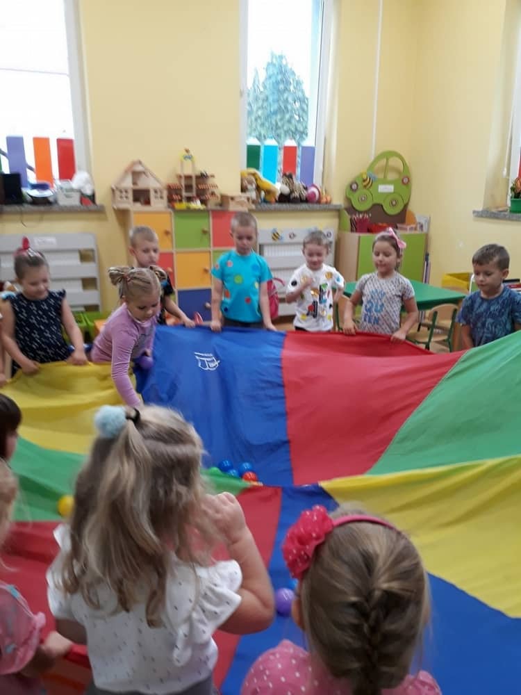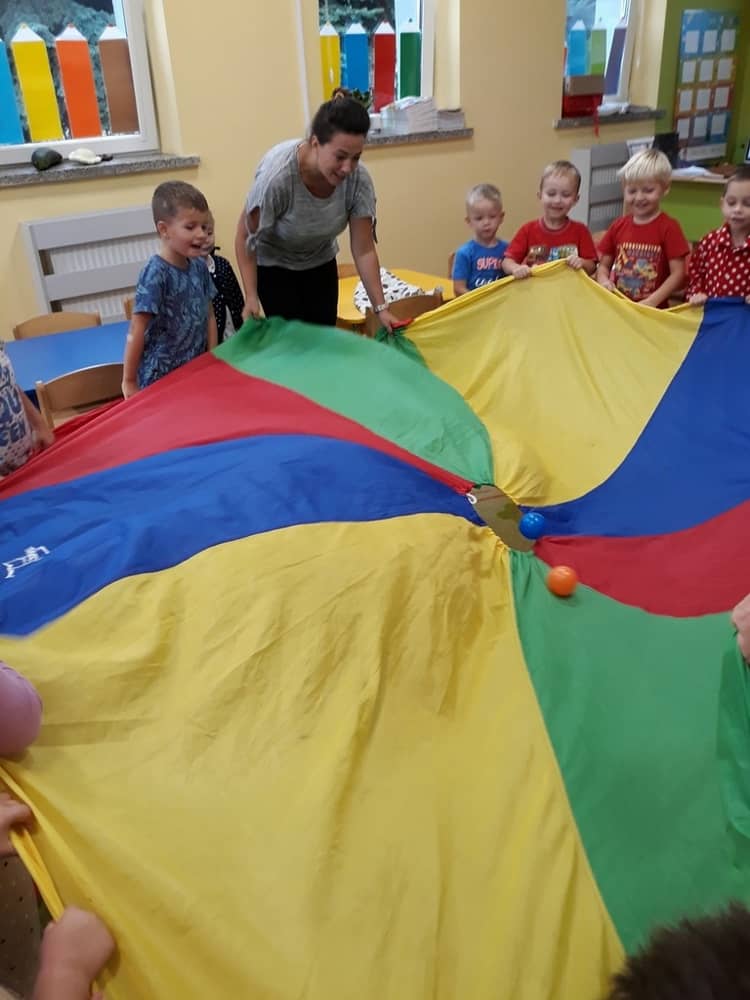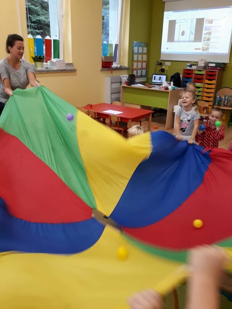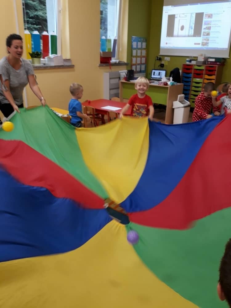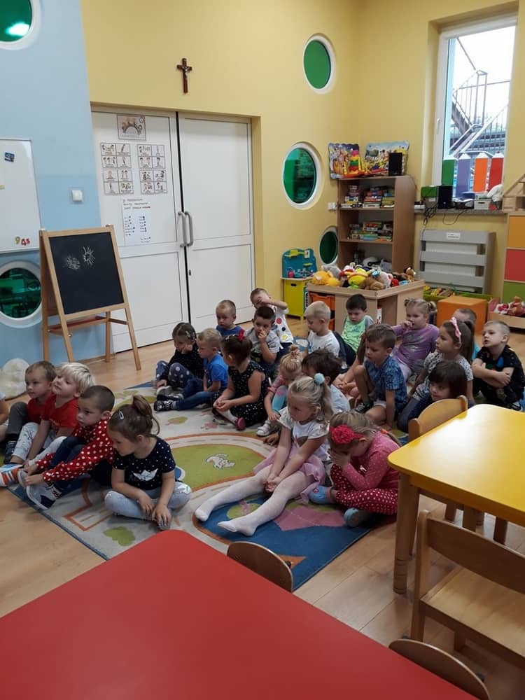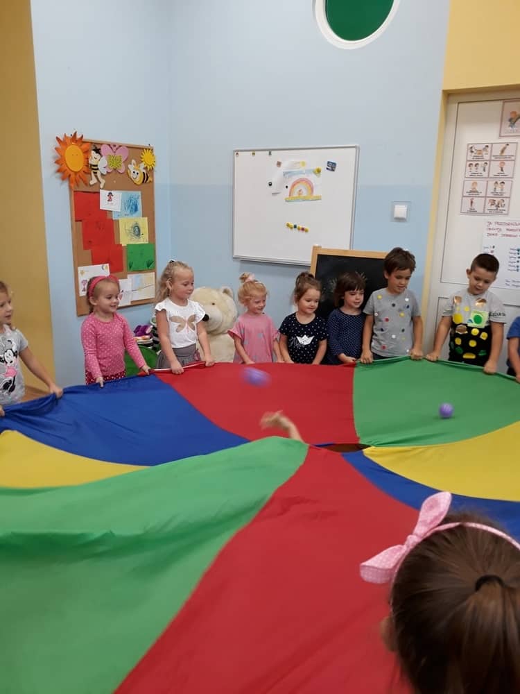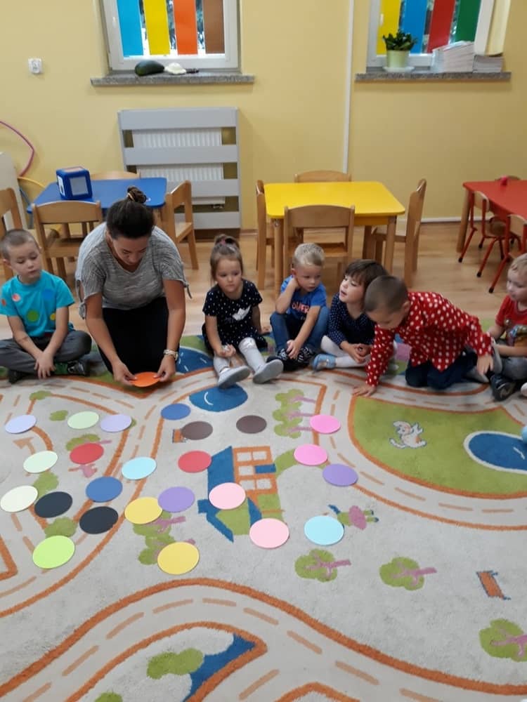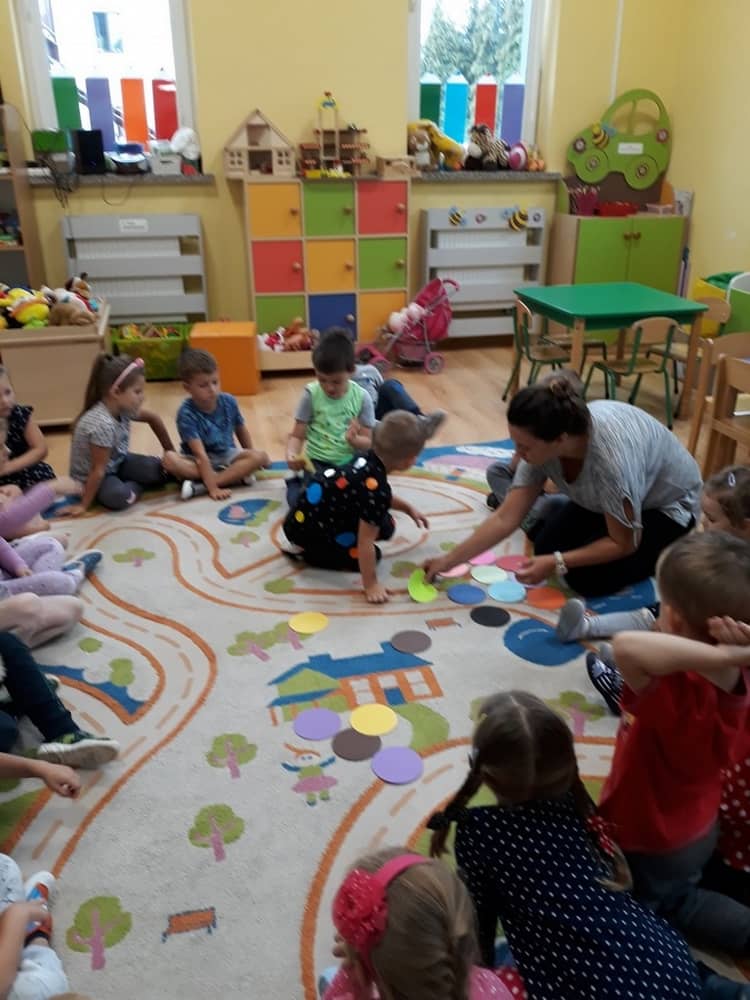 W dniu 14.09.2018 w naszym przedszkolu obchodziliśmy DZIEŃ KROPKI. Prawie wszystkie obecne dzieci miały na swoich ubraniach różnokolorowe kropki, a w przedszkolu poruszały się szlakiem różnokolorowych filcowych kół. W trakcie zajęć dzieci poznały bohaterkę książki Vasthi, dla której Kropka stała się motywacją w życiu, by uwierzyć w swoje możliwości. Następnie dzieci z radością i entuzjazmem uczestniczyły w zabawie muzyczno- ruchowej z chustą animacyjną i piłeczkami. Układały na dywanie wspólną kompozycje z kolorowych kół. W trakcie „Zabawy z kropeczkami” dzieci z obu grup szukały ukrytych w Sali kropek. Dodatkowo odbyły się „Zabawy matematyczne”: •przeliczanie