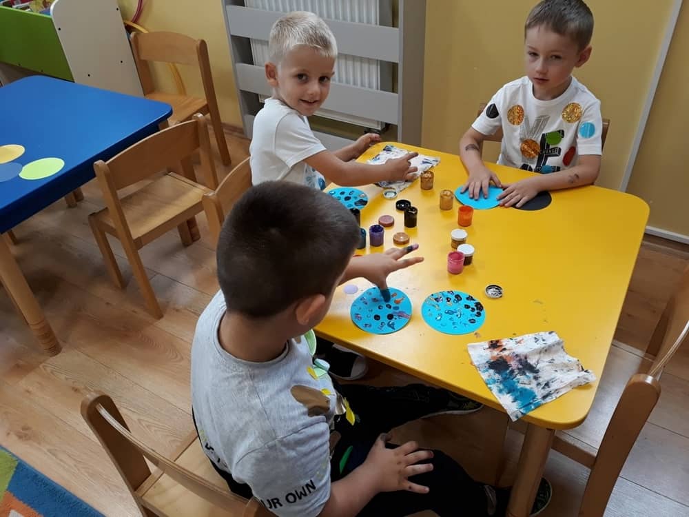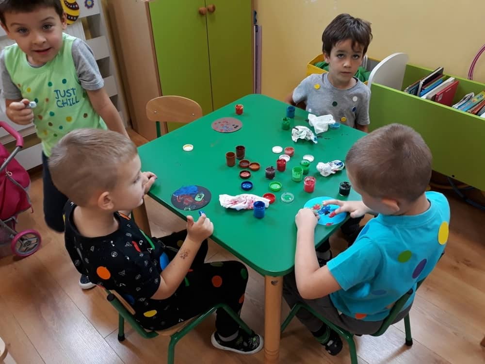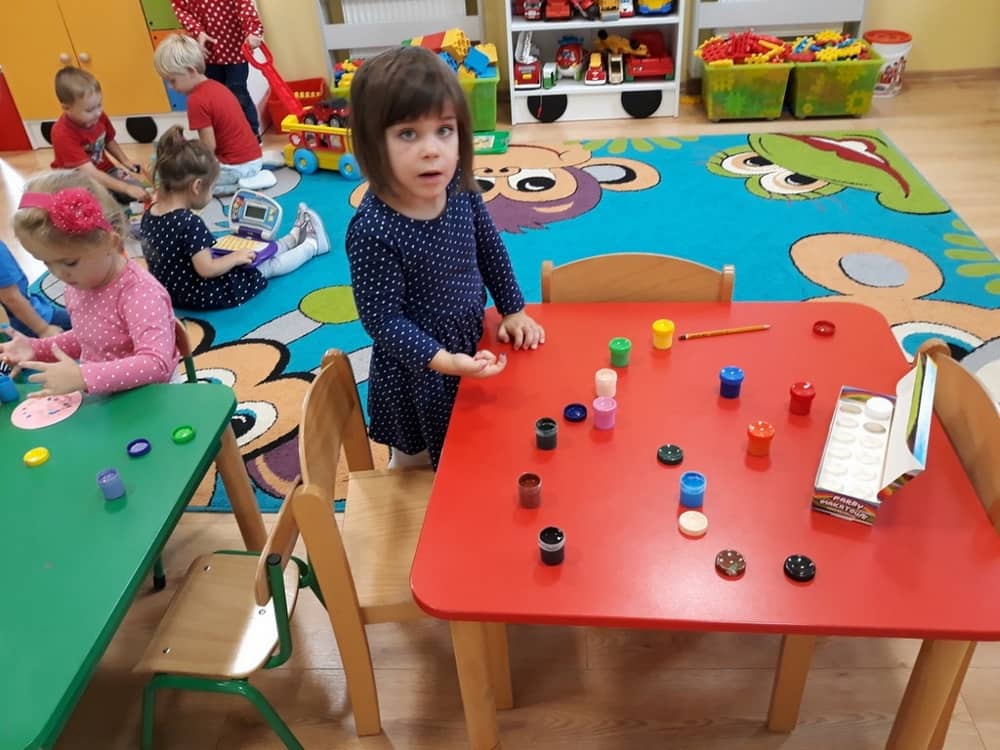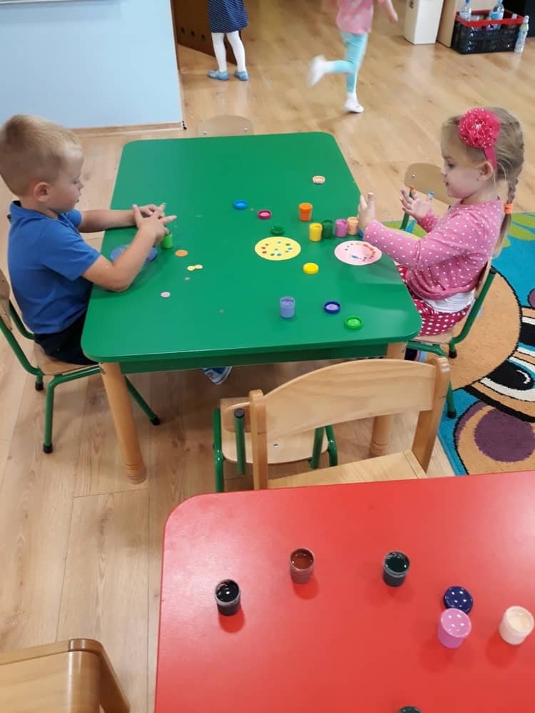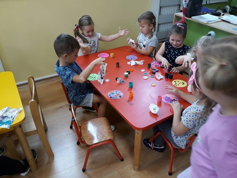 Na zakończenie dzieci indywidualnie wykonały prace plastyczną „Kolorowe kółko”. Do tego zadania wykorzystały swoje paluszki i farbę. Spontanicznie macza i odbijały ślady na szablonie koła.