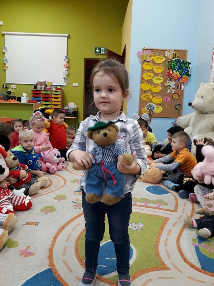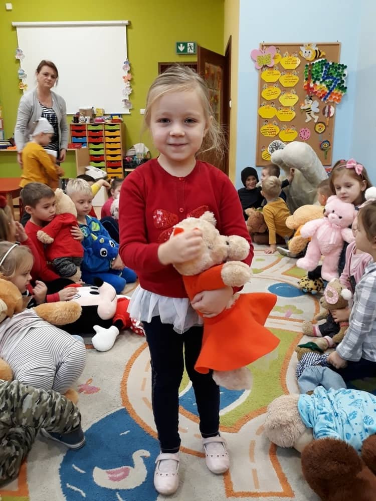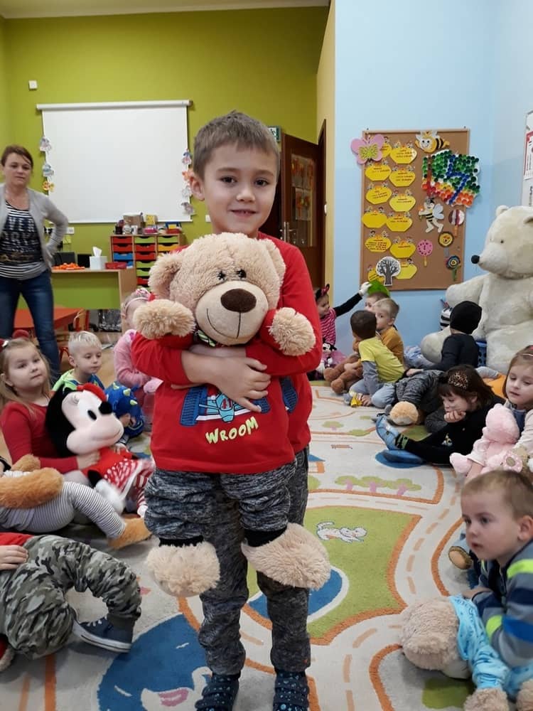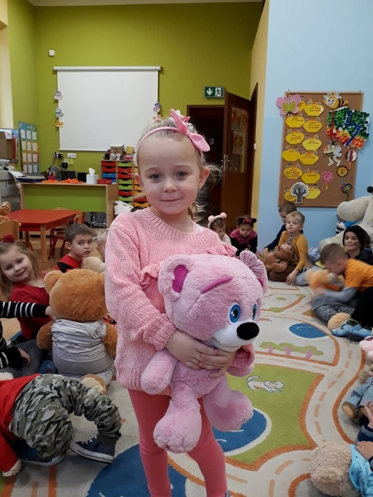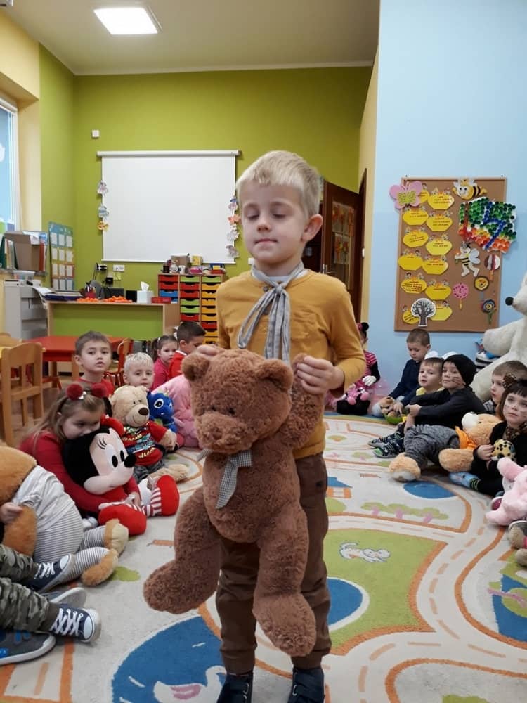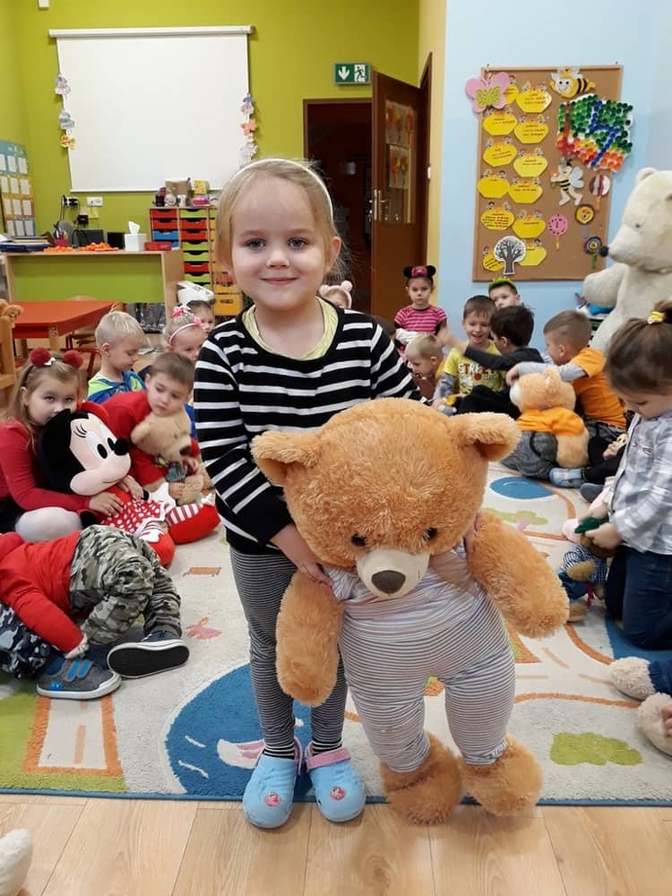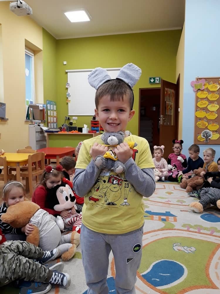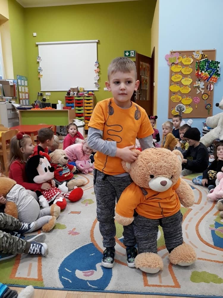 W dniu 23.11.2018 w naszym Przedszkolu świętowaliśmy Dzień Pluszowego Misia. Na ścianach korytarza i na drzwiach wejściowych przedszkola zawieszono piękne prace plastyczne z postacią Misia, które w zeszłym roku wykonały dzieci wraz z rodzicami. Wszystkie dzieci w tym dniu przyszły do przedszkola ze swoimi ulubionymi przytulankami. Głównym założeniem było to, aby dzieci i ich przytulanki były ubrane w podobne stroje. Zajęcia rozpoczęły się od recytacji wiersza pt. „Kochać misia”, którego autorką była Pani Agnieszka Karcz. Wiersz zwrócił uwagę na poszanowanie zabawek i troszczenie się o to, co jest dla nas ważne. Następnie odbył się pokaz i prezentacja misiów na tle grupy. Kolejnym atrakcyjnym dla dzieci momentem był taniec z misiem. Wszyscy bawili się wesoło w rytm muzyki. W ramach odpoczynku dzieci wzięły udział w głosowaniu na najfajniej przebranego misia i jego właściciela. Głosowanie przebiegało bardzo zgodnie. Zwycięzca został nagrodzony wielkimi brawami. W tym dniu dzieci uczyły się także rymowanki autorstwa Pani Agnieszki Karcz pt. „Kołysanka”. Na końcu dzieci wykonały prace plastyczne techniką wyklejanki. Była to praca zespołowa. Ostatnią atrakcją był poczęstunek Misiowy- wafelki z konfiturą.