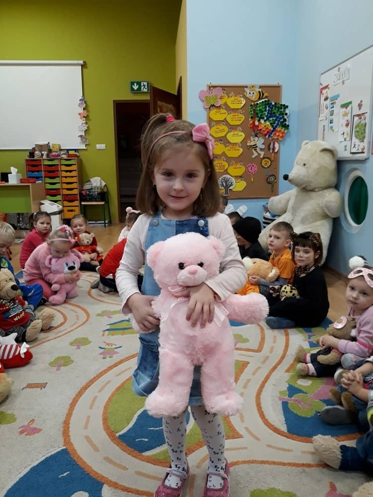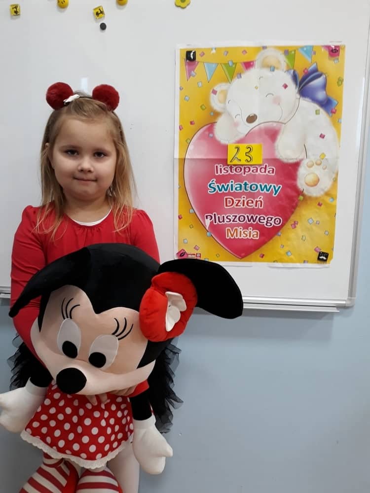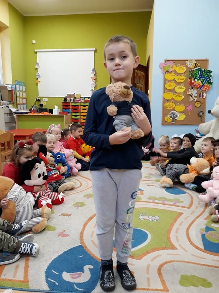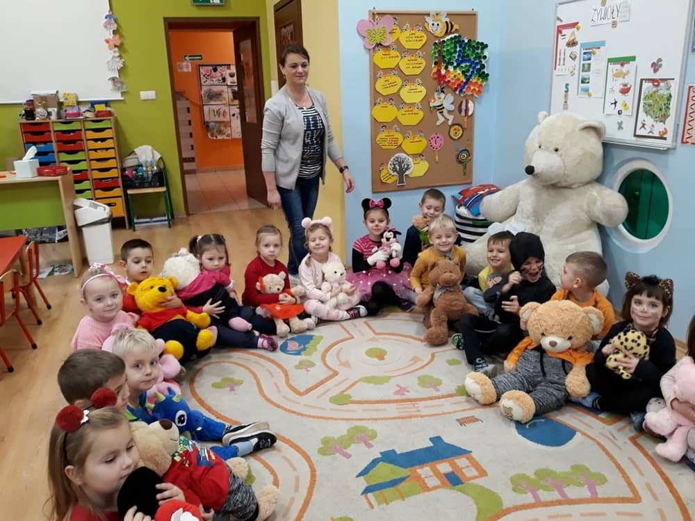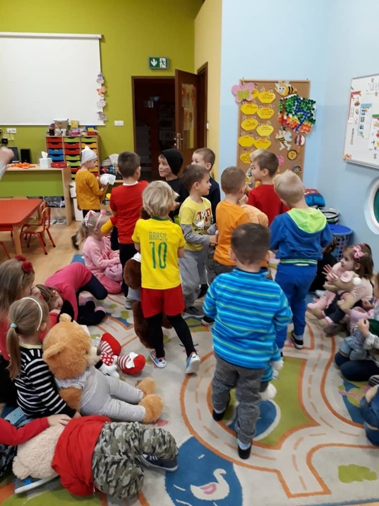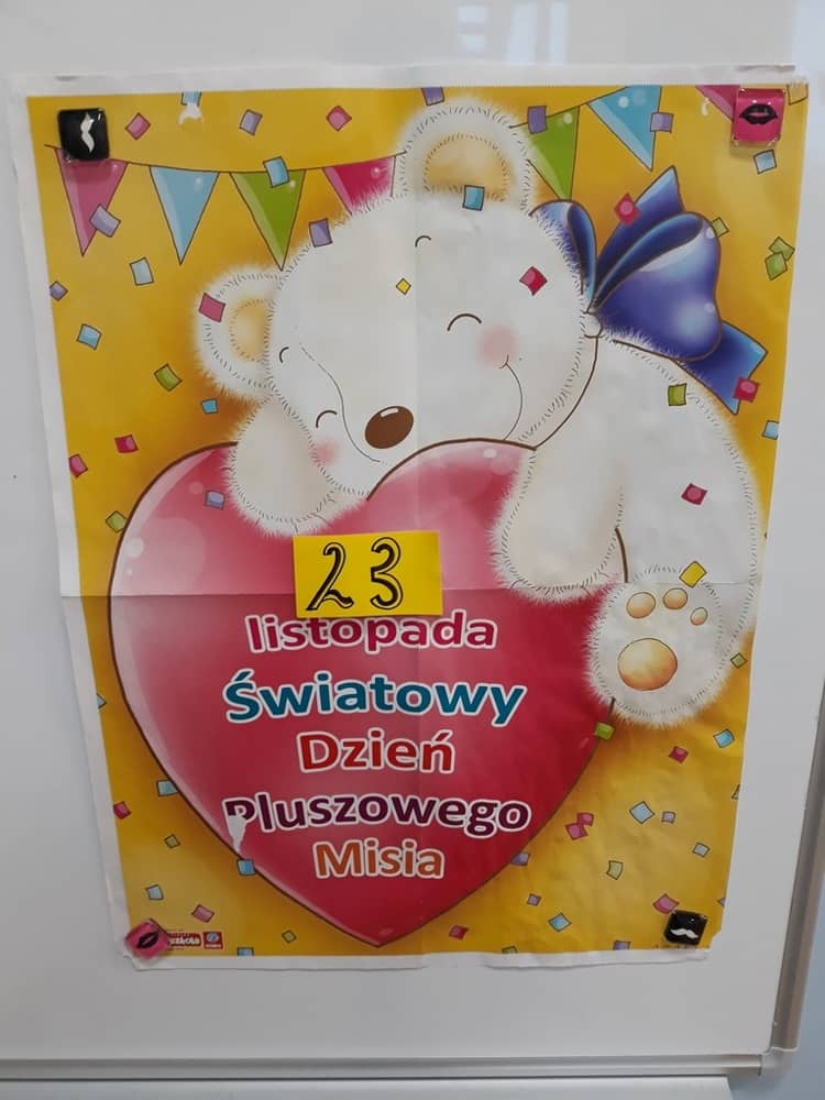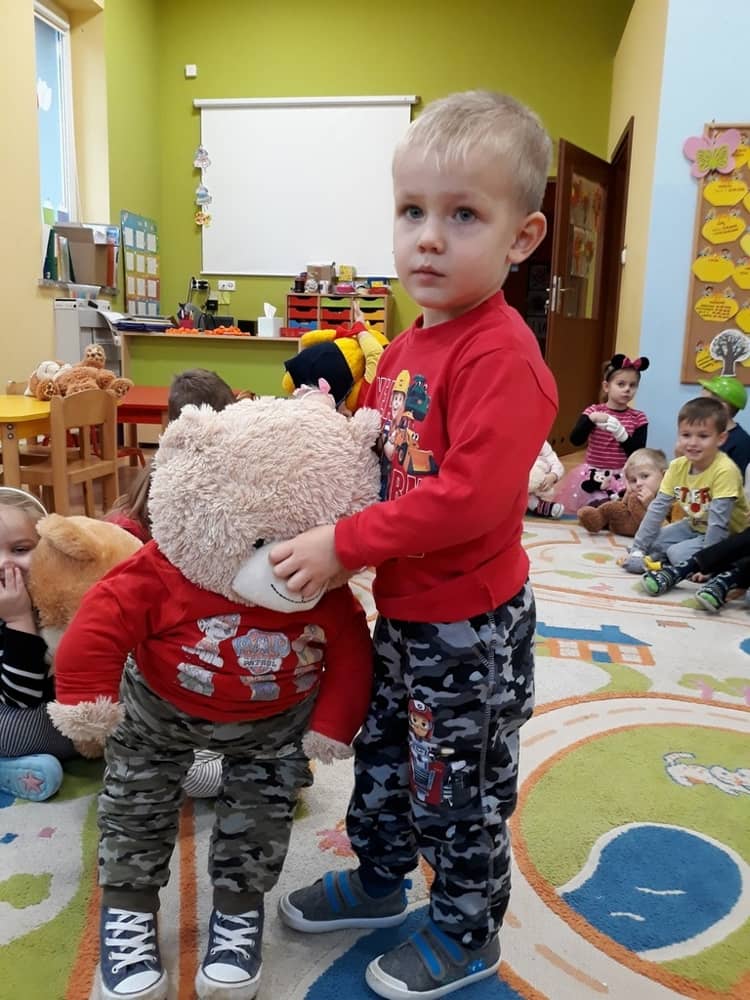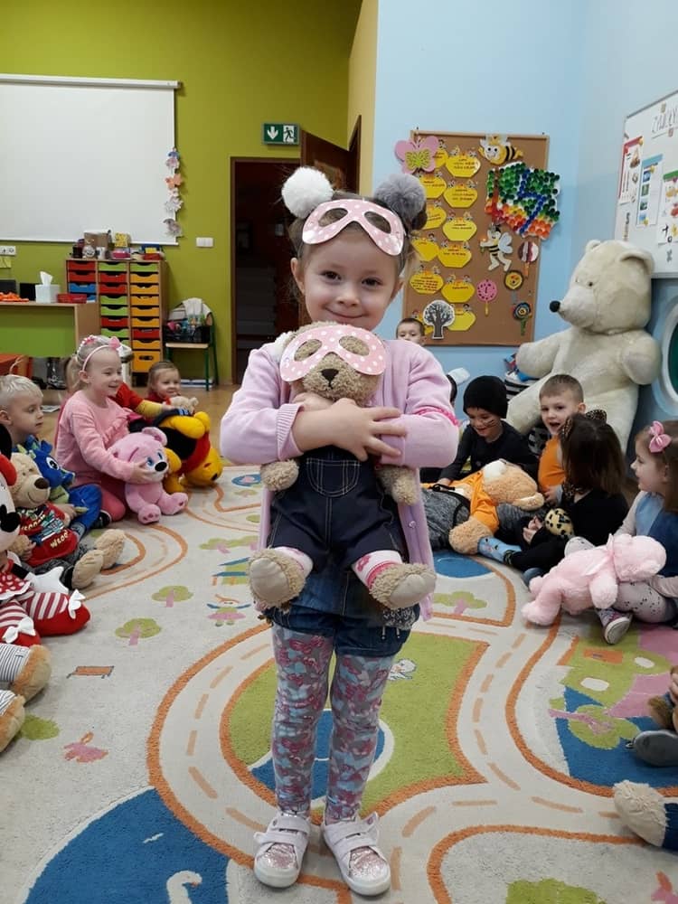 W dniu 23.11.2018 w naszym Przedszkolu świętowaliśmy Dzień Pluszowego Misia. Na ścianach korytarza i na drzwiach wejściowych przedszkola zawieszono piękne prace plastyczne z postacią Misia, które w zeszłym roku wykonały dzieci wraz z rodzicami. Wszystkie dzieci w tym dniu przyszły do przedszkola ze swoimi ulubionymi przytulankami. Głównym założeniem było to, aby dzieci i ich przytulanki były ubrane w podobne stroje. Zajęcia rozpoczęły się od recytacji wiersza pt. „Kochać misia”, którego autorką była Pani Agnieszka Karcz. Wiersz zwrócił uwagę na poszanowanie zabawek i troszczenie się o to, co jest dla nas ważne. Następnie odbył się pokaz i prezentacja misiów na tle grupy. Kolejnym atrakcyjnym dla dzieci momentem był taniec z misiem. Wszyscy bawili się wesoło w rytm muzyki. W ramach odpoczynku dzieci wzięły udział w głosowaniu na najfajniej przebranego misia i jego właściciela. Głosowanie przebiegało bardzo zgodnie. Zwycięzca został nagrodzony wielkimi brawami. W tym dniu dzieci uczyły się także rymowanki autorstwa Pani Agnieszki Karcz pt. „Kołysanka”. Na końcu dzieci wykonały prace plastyczne techniką wyklejanki. Była to praca zespołowa. Ostatnią atrakcją był poczęstunek Misiowy- wafelki z konfiturą.