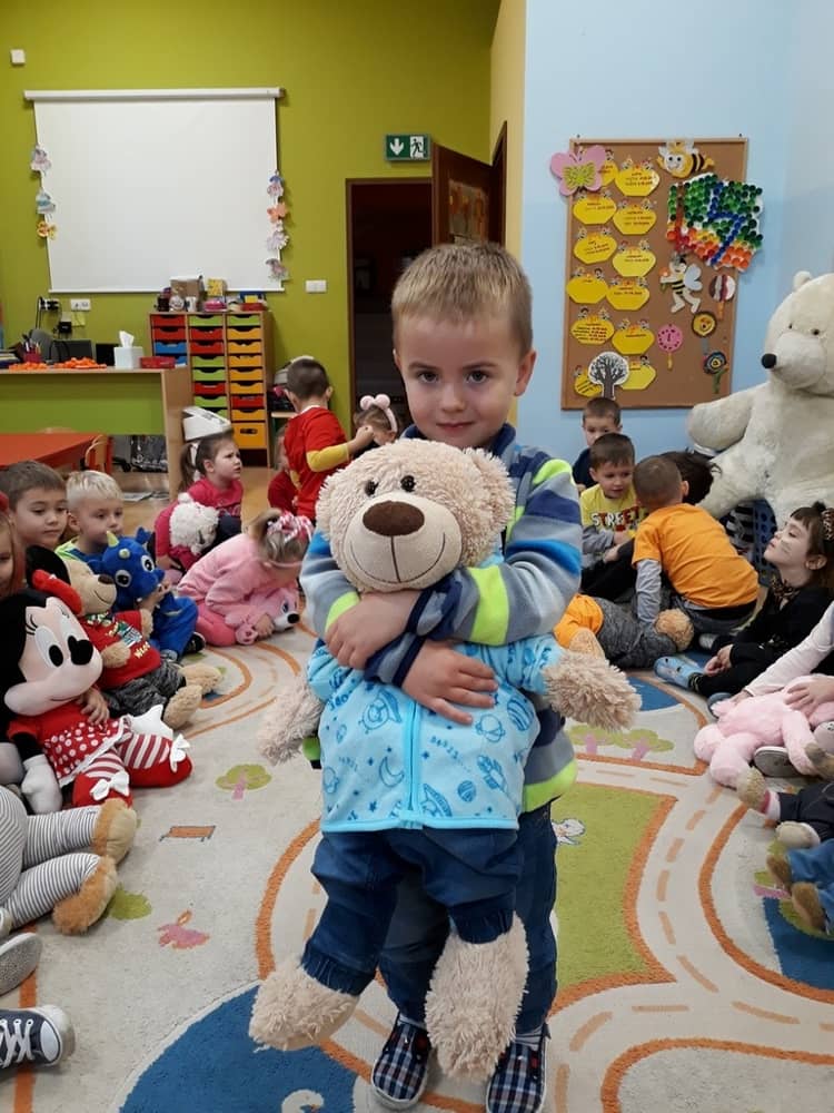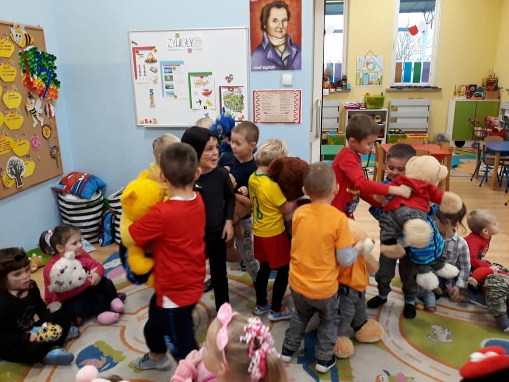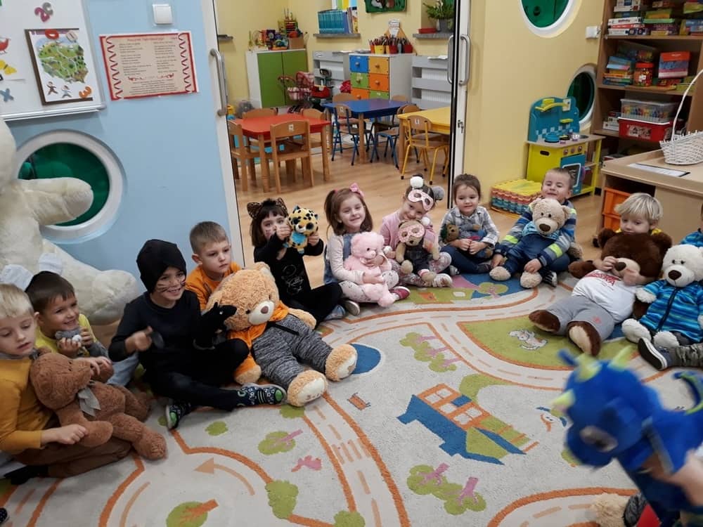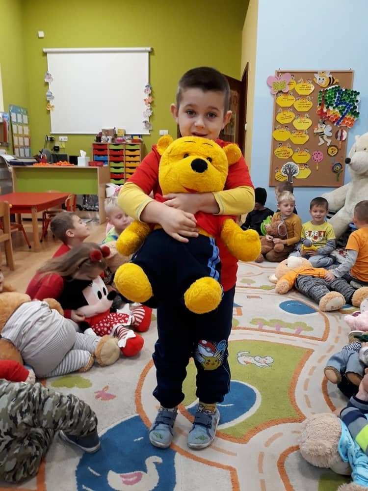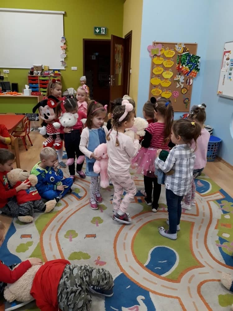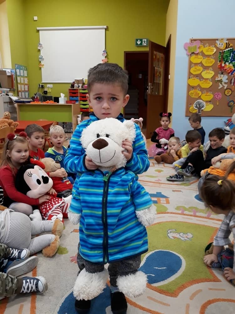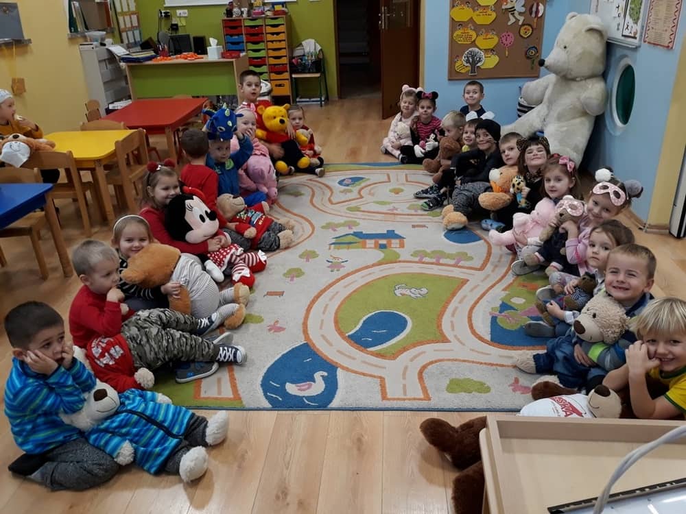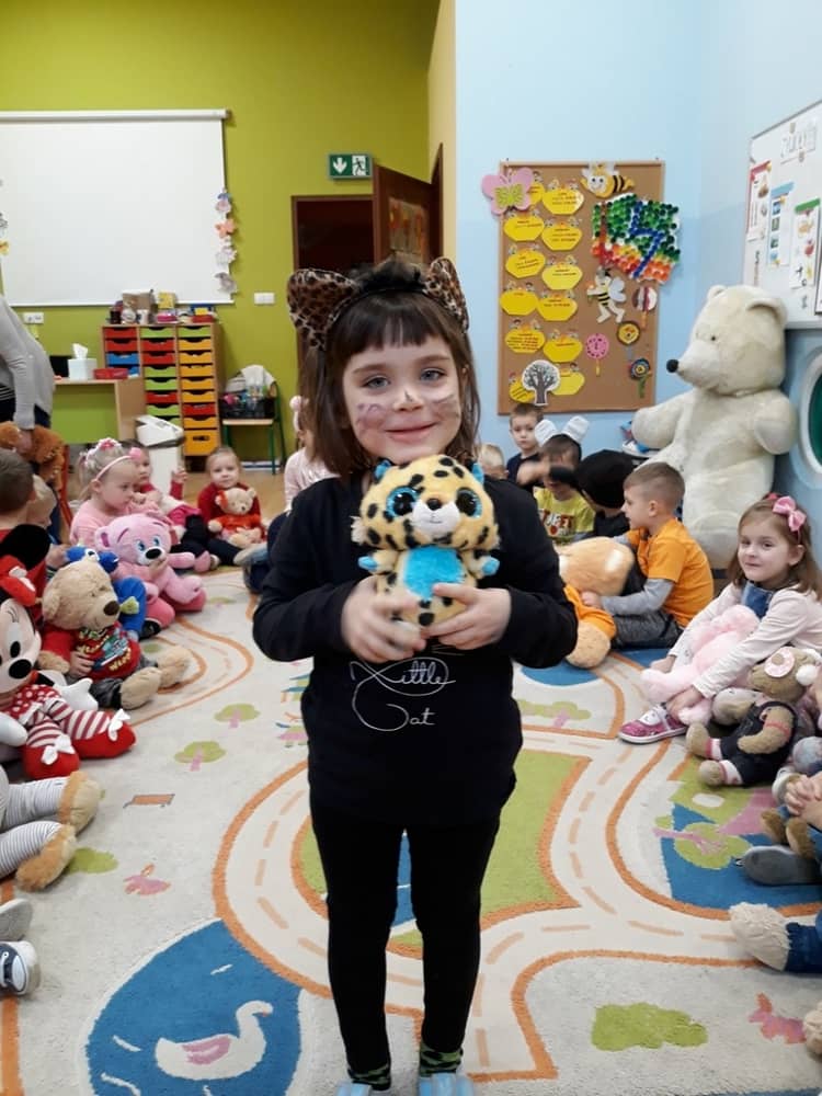 W dniu 23.11.2018 w naszym Przedszkolu świętowaliśmy Dzień Pluszowego Misia. Na ścianach korytarza i na drzwiach wejściowych przedszkola zawieszono piękne prace plastyczne z postacią Misia, które w zeszłym roku wykonały dzieci wraz z rodzicami. Wszystkie dzieci w tym dniu przyszły do przedszkola ze swoimi ulubionymi przytulankami. Głównym założeniem było to, aby dzieci i ich przytulanki były ubrane w podobne stroje. Zajęcia rozpoczęły się od recytacji wiersza pt. „Kochać misia”, którego autorką była Pani Agnieszka Karcz. Wiersz zwrócił uwagę na poszanowanie zabawek i troszczenie się o to, co jest dla nas ważne. Następnie odbył się pokaz i prezentacja misiów na tle grupy. Kolejnym atrakcyjnym dla dzieci momentem był taniec z misiem. Wszyscy bawili się wesoło w rytm muzyki. W ramach odpoczynku dzieci wzięły udział w głosowaniu na najfajniej przebranego misia i jego właściciela. Głosowanie przebiegało bardzo zgodnie. Zwycięzca został nagrodzony wielkimi brawami. W tym dniu dzieci uczyły się także rymowanki autorstwa Pani Agnieszki Karcz pt. „Kołysanka”. Na końcu dzieci wykonały prace plastyczne techniką wyklejanki. Była to praca zespołowa. Ostatnią atrakcją był poczęstunek Misiowy- wafelki z konfiturą.