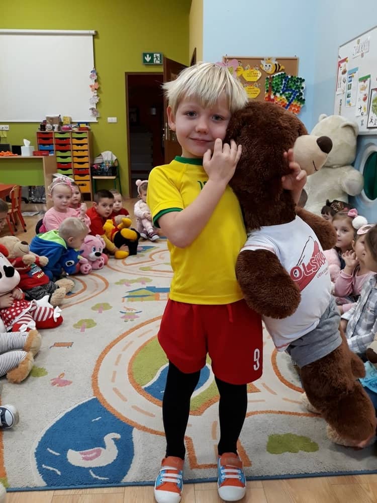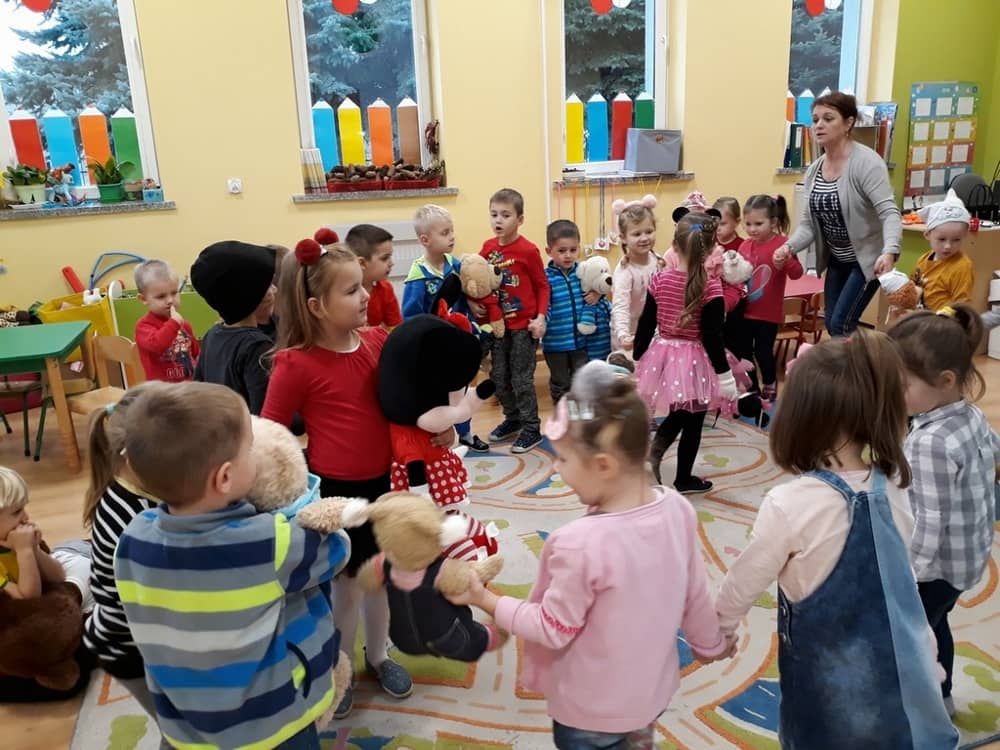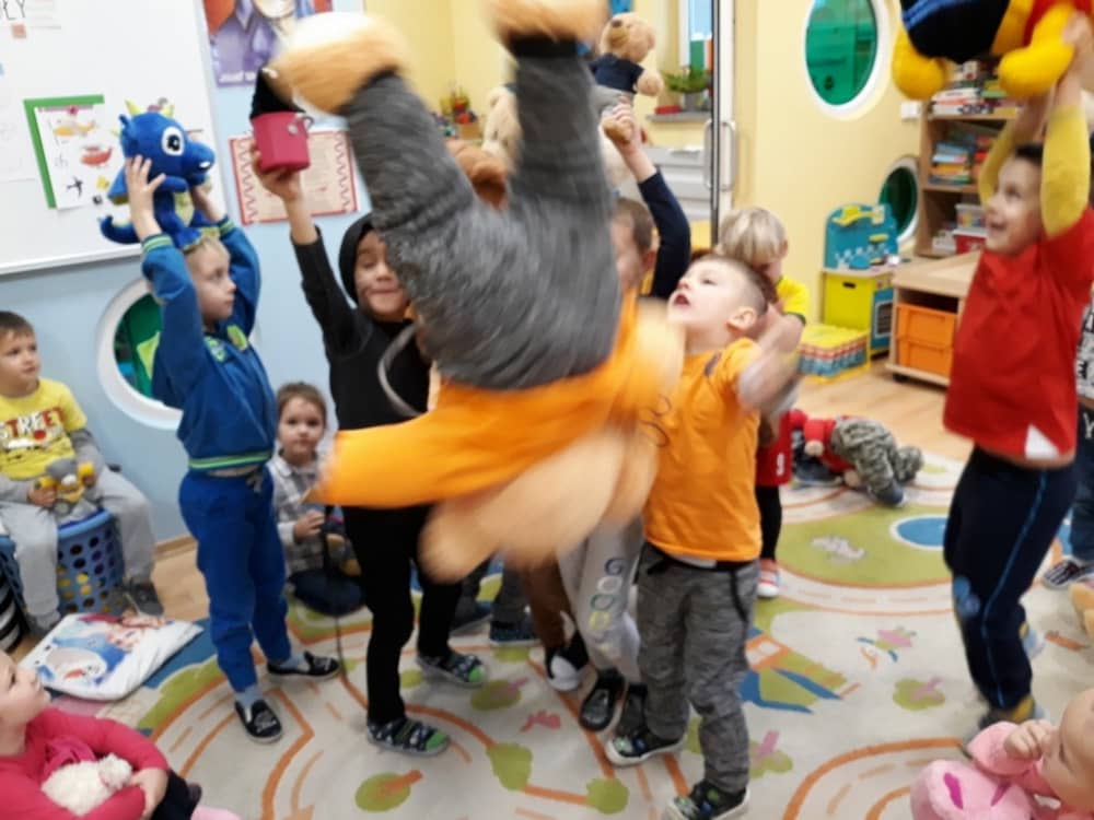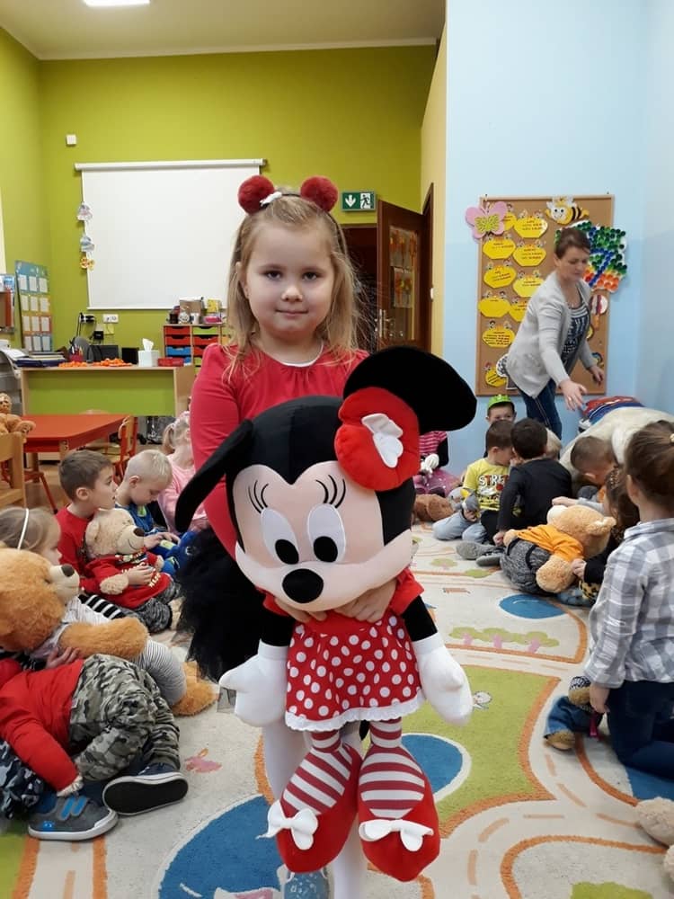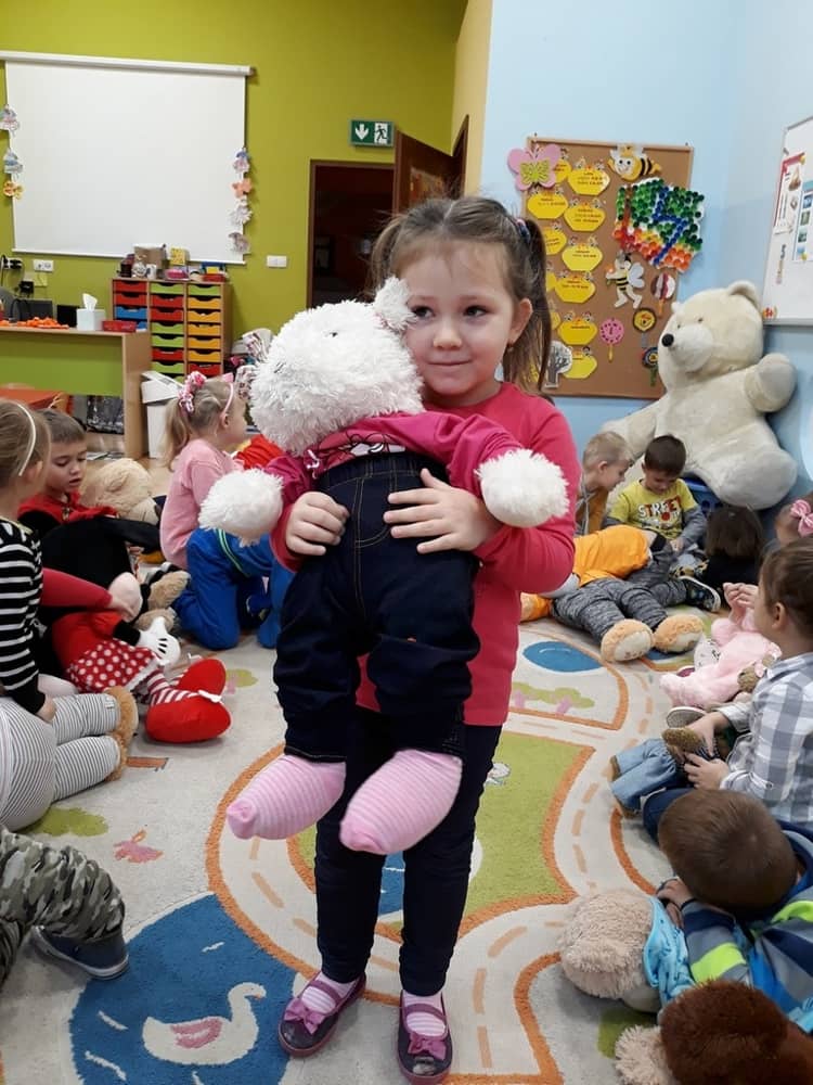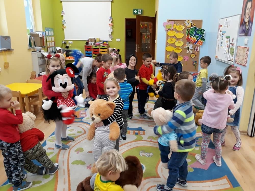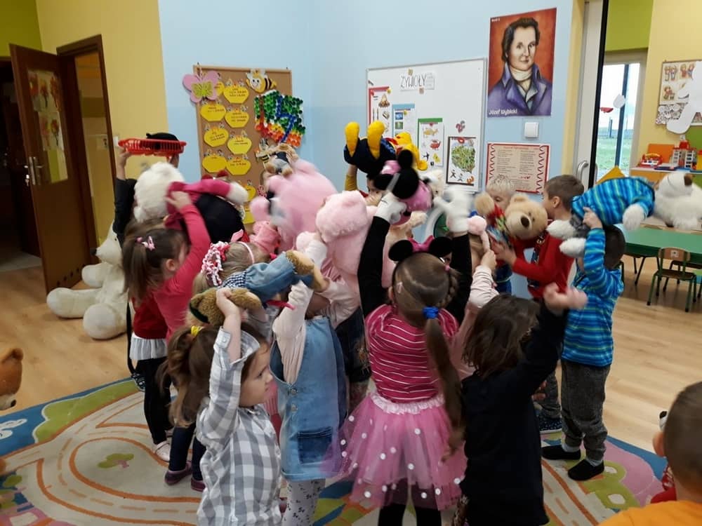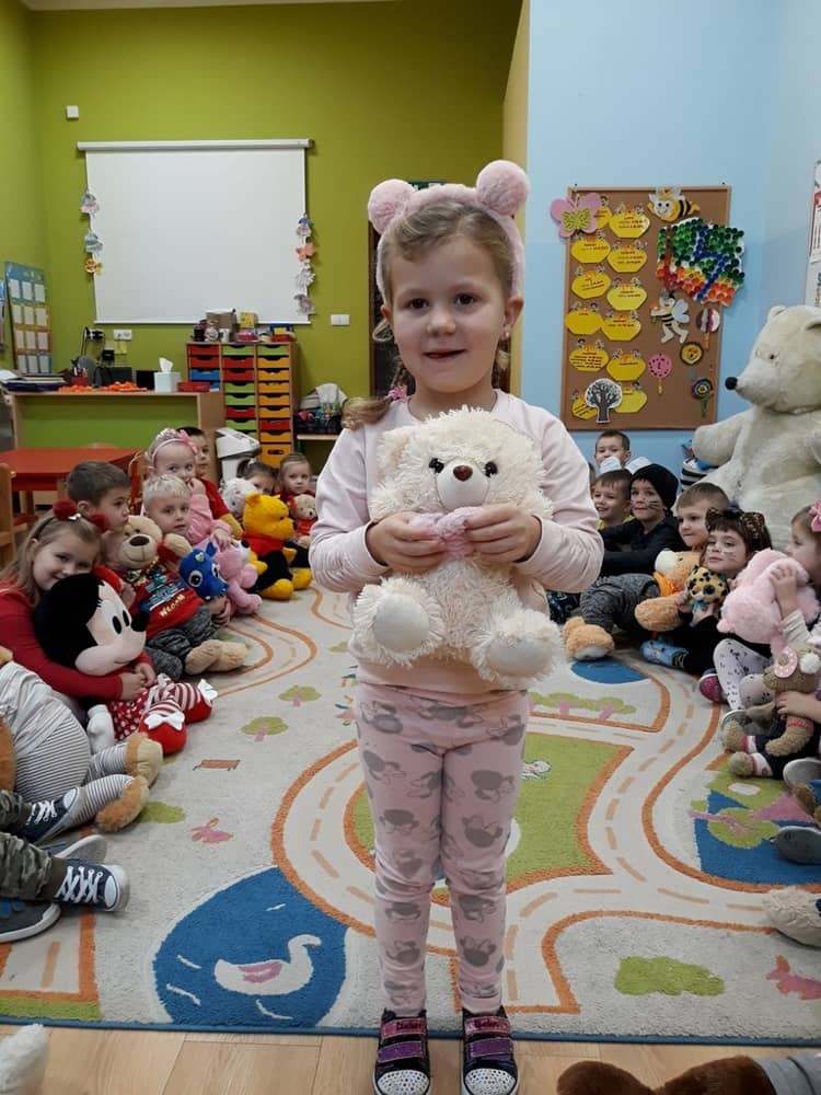 W dniu 23.11.2018 w naszym Przedszkolu świętowaliśmy Dzień Pluszowego Misia. Na ścianach korytarza i na drzwiach wejściowych przedszkola zawieszono piękne prace plastyczne z postacią Misia, które w zeszłym roku wykonały dzieci wraz z rodzicami. Wszystkie dzieci w tym dniu przyszły do przedszkola ze swoimi ulubionymi przytulankami. Głównym założeniem było to, aby dzieci i ich przytulanki były ubrane w podobne stroje. Zajęcia rozpoczęły się od recytacji wiersza pt. „Kochać misia”, którego autorką była Pani Agnieszka Karcz. Wiersz zwrócił uwagę na poszanowanie zabawek i troszczenie się o to, co jest dla nas ważne. Następnie odbył się pokaz i prezentacja misiów na tle grupy. Kolejnym atrakcyjnym dla dzieci momentem był taniec z misiem. Wszyscy bawili się wesoło w rytm muzyki. W ramach odpoczynku dzieci wzięły udział w głosowaniu na najfajniej przebranego misia i jego właściciela. Głosowanie przebiegało bardzo zgodnie. Zwycięzca został nagrodzony wielkimi brawami. W tym dniu dzieci uczyły się także rymowanki autorstwa Pani Agnieszki Karcz pt. „Kołysanka”. Na końcu dzieci wykonały prace plastyczne techniką wyklejanki. Była to praca zespołowa. Ostatnią atrakcją był poczęstunek Misiowy- wafelki z konfiturą.