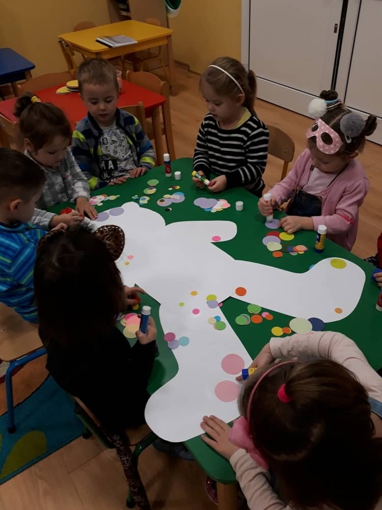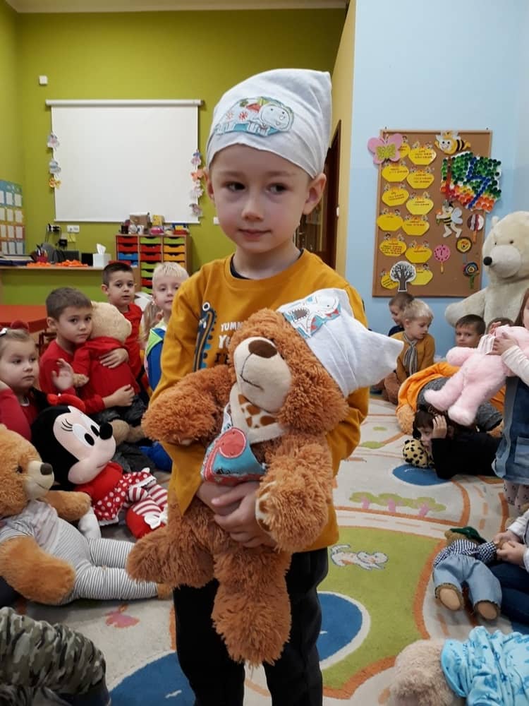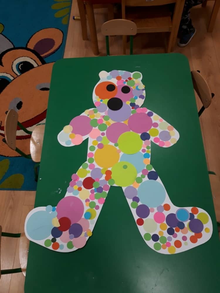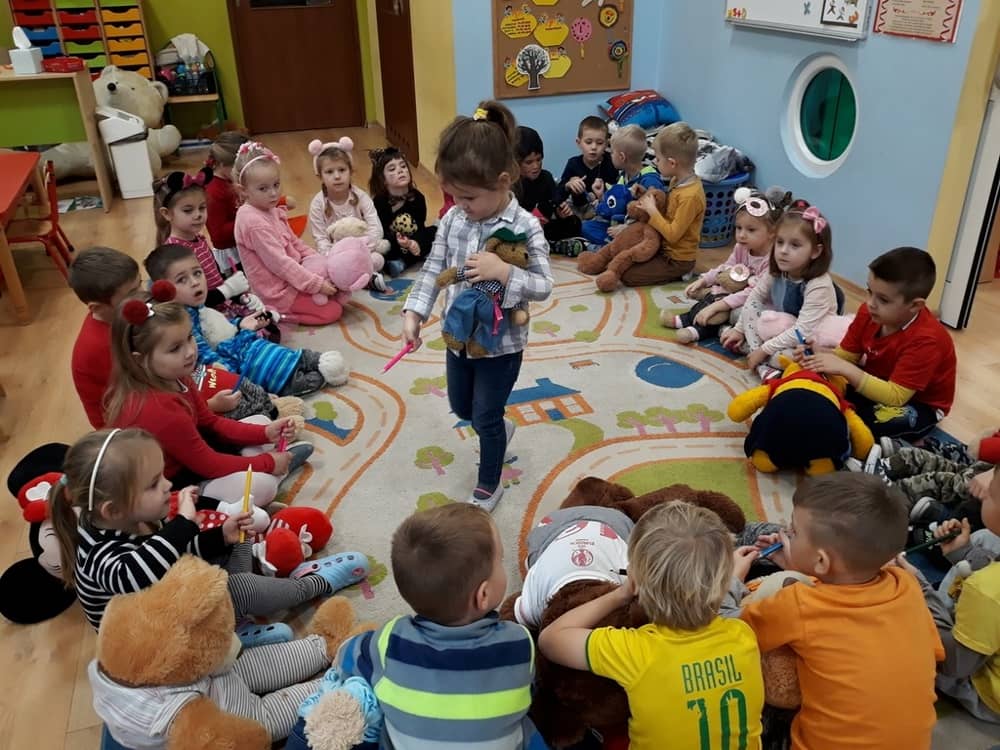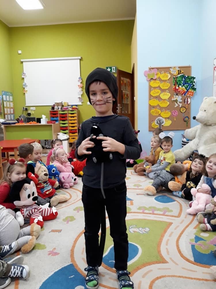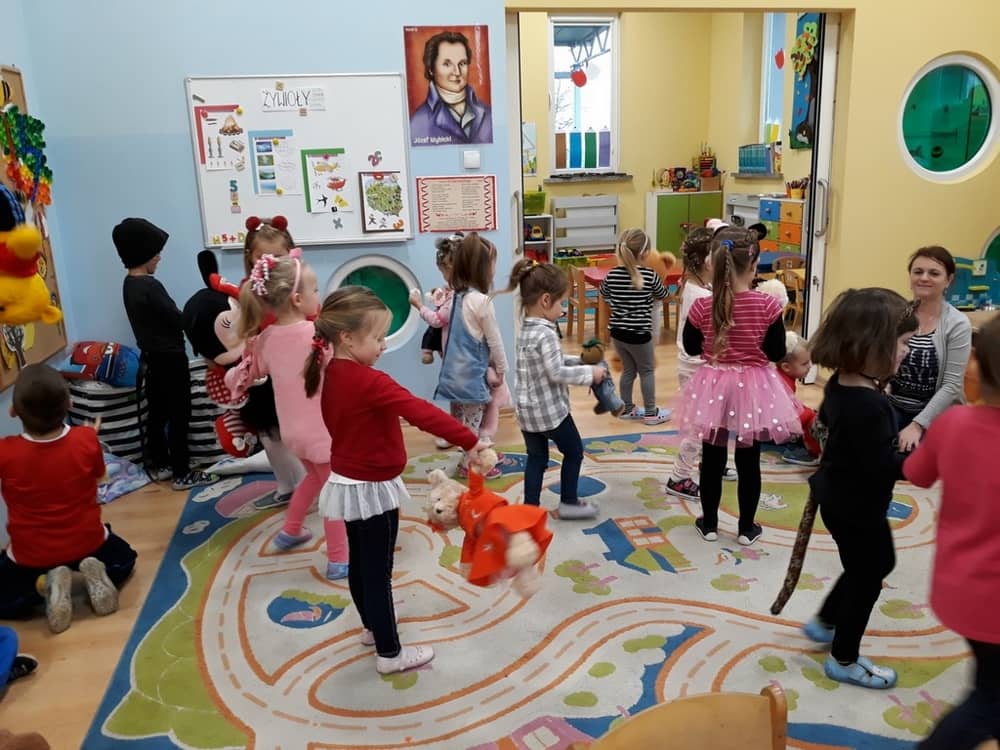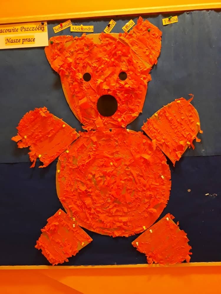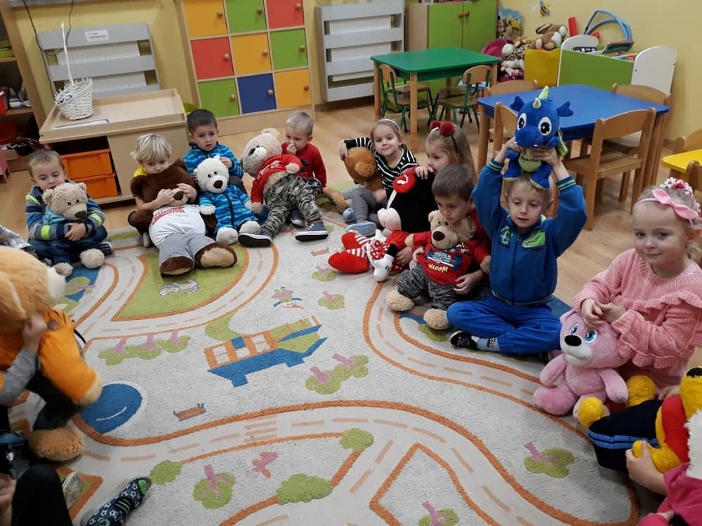 W dniu 23.11.2018 w naszym Przedszkolu świętowaliśmy Dzień Pluszowego Misia. Na ścianach korytarza i na drzwiach wejściowych przedszkola zawieszono piękne prace plastyczne z postacią Misia, które w zeszłym roku wykonały dzieci wraz z rodzicami. Wszystkie dzieci w tym dniu przyszły do przedszkola ze swoimi ulubionymi przytulankami. Głównym założeniem było to, aby dzieci i ich przytulanki były ubrane w podobne stroje. Zajęcia rozpoczęły się od recytacji wiersza pt. „Kochać misia”, którego autorką była Pani Agnieszka Karcz. Wiersz zwrócił uwagę na poszanowanie zabawek i troszczenie się o to, co jest dla nas ważne. Następnie odbył się pokaz i prezentacja misiów na tle grupy. Kolejnym atrakcyjnym dla dzieci momentem był taniec z misiem. Wszyscy bawili się wesoło w rytm muzyki. W ramach odpoczynku dzieci wzięły udział w głosowaniu na najfajniej przebranego misia i jego właściciela. Głosowanie przebiegało bardzo zgodnie. Zwycięzca został nagrodzony wielkimi brawami. W tym dniu dzieci uczyły się także rymowanki autorstwa Pani Agnieszki Karcz pt. „Kołysanka”. Na końcu dzieci wykonały prace plastyczne techniką wyklejanki. Była to praca zespołowa. Ostatnią atrakcją był poczęstunek Misiowy- wafelki z konfiturą.