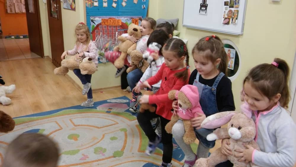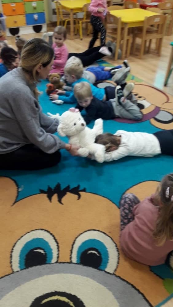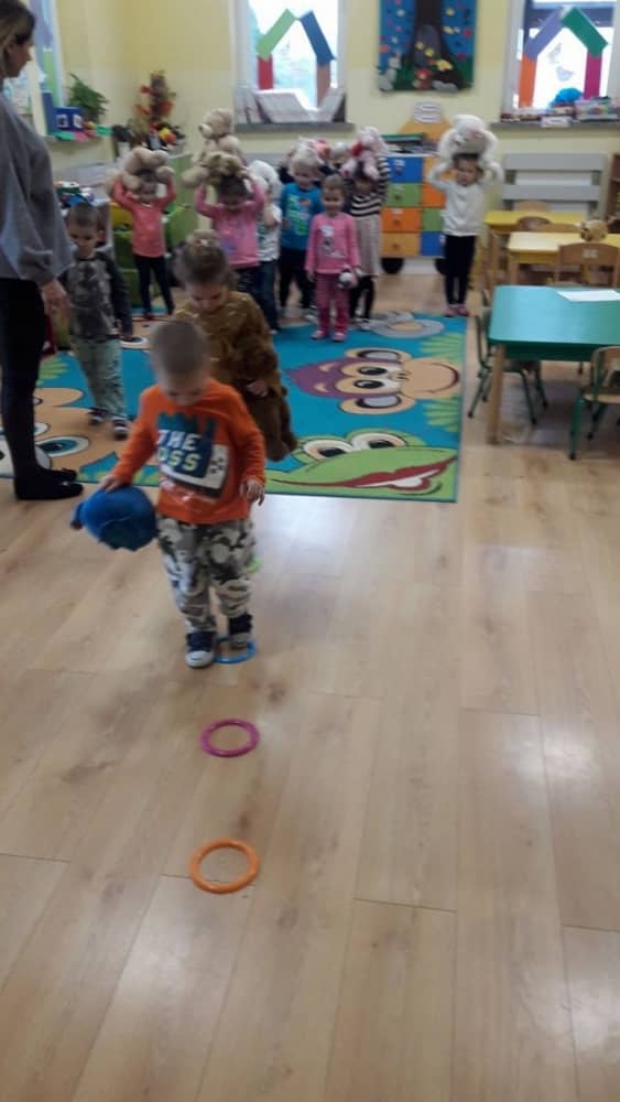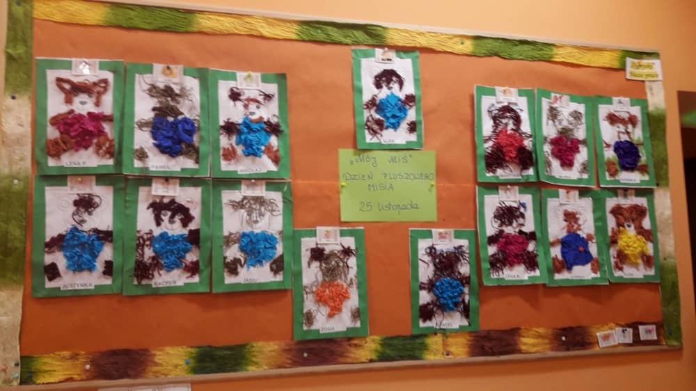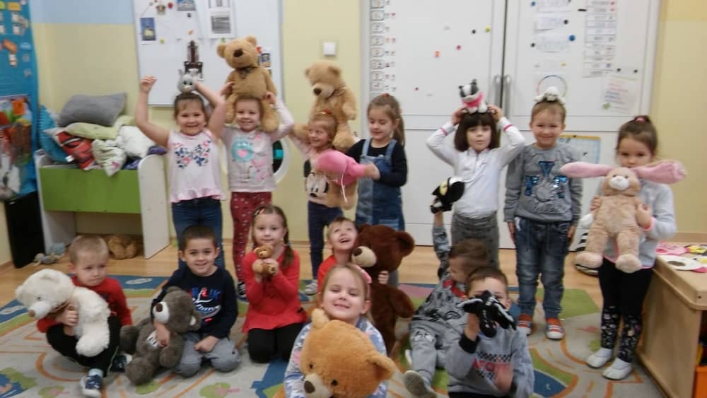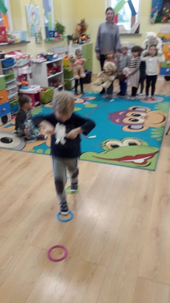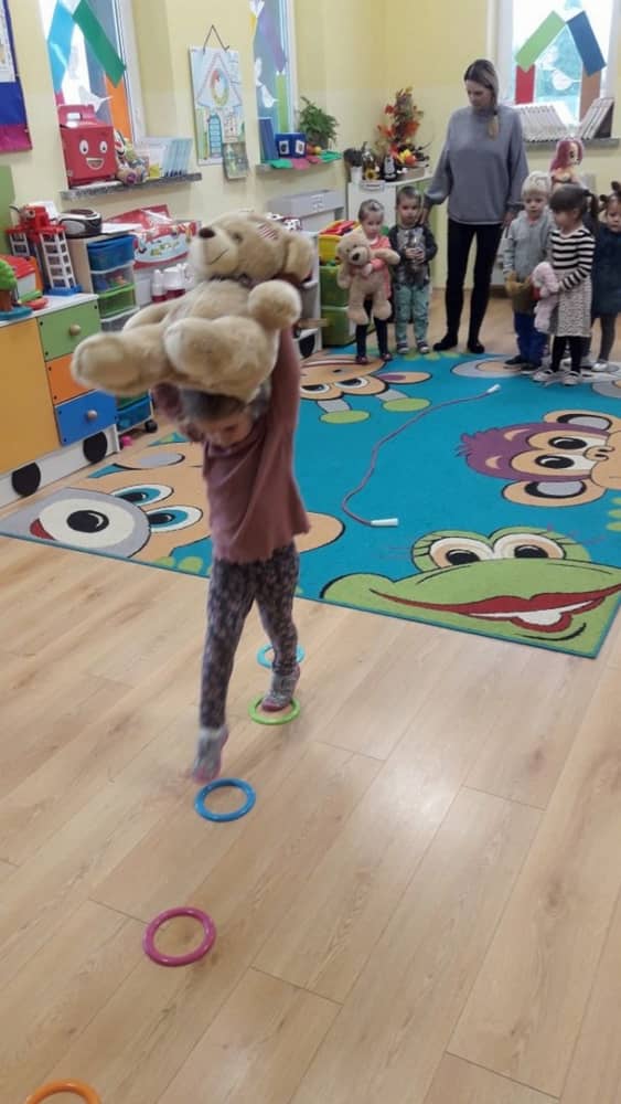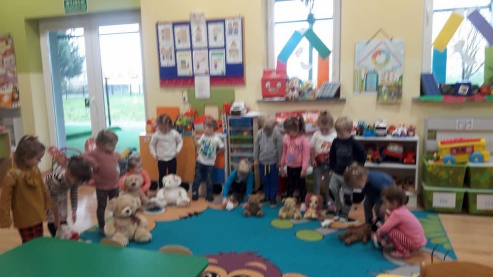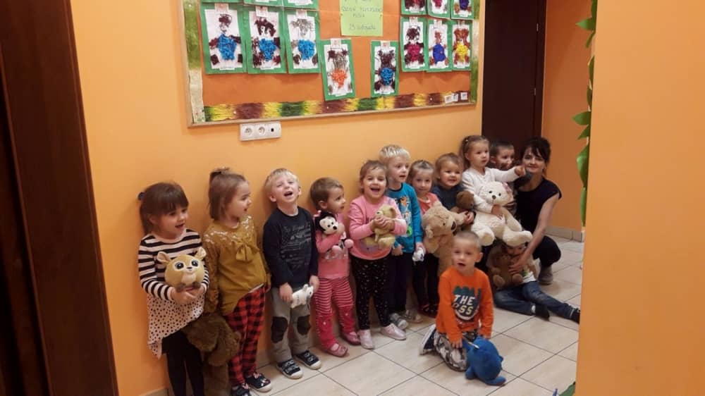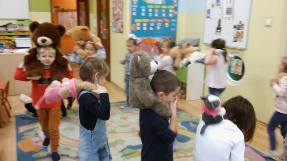 Dzień 25 listopada był radosnym Dniem Pluszowego Misia - ulubieńca każdego malucha. W tym dniu wszystkie teksty literackie, piosenki, zabawy dydaktyczne, ćwiczenia ruchowe i prace plastyczne dotyczyły głównego bohatera dnia. Dzieci zabrały do przedszkola swoje ulubione pluszaki, aby wspólnie z nimi bawić się przez cały dzień. W tym dniu realizowałyśmy również scenariusz "Pluszowy miś" z Akcji Zdrowo i Sportowo. Były takie ćwiczenia gimnastyczne jak: Berek Miś, Marsz misiów, Mis akrobata, Znajdź swojego misia oraz Miś siłacz, mające na celu rozwijanie sprawności ruchowej, wzmocnienie mięśni brzucha, doskonalenie równowagi ciała.