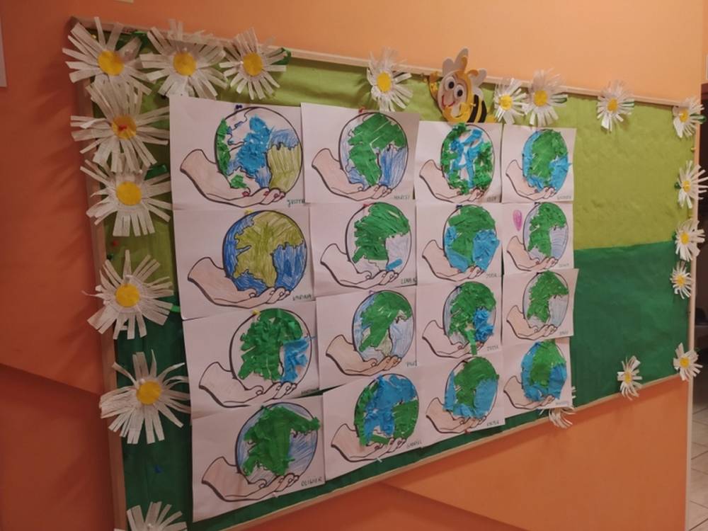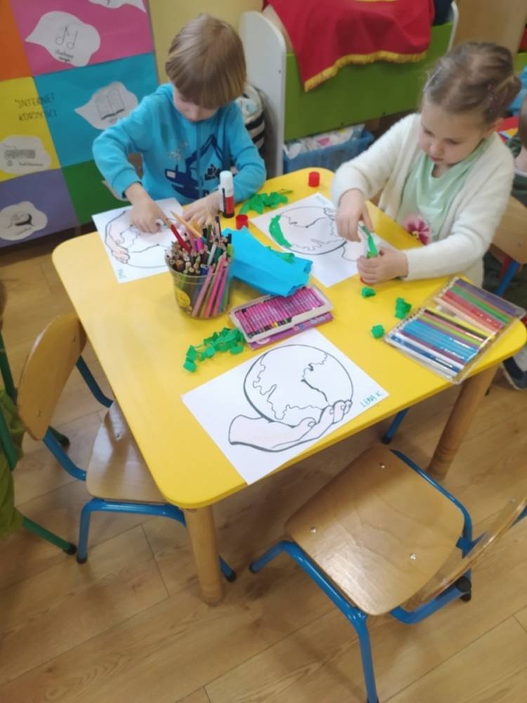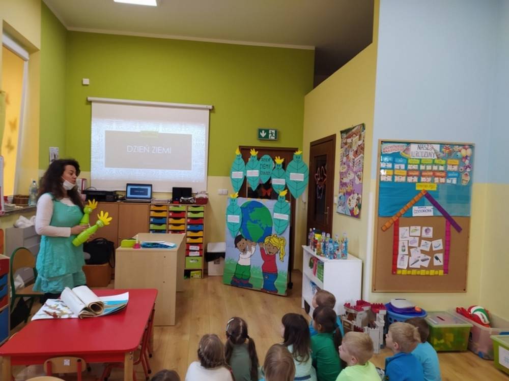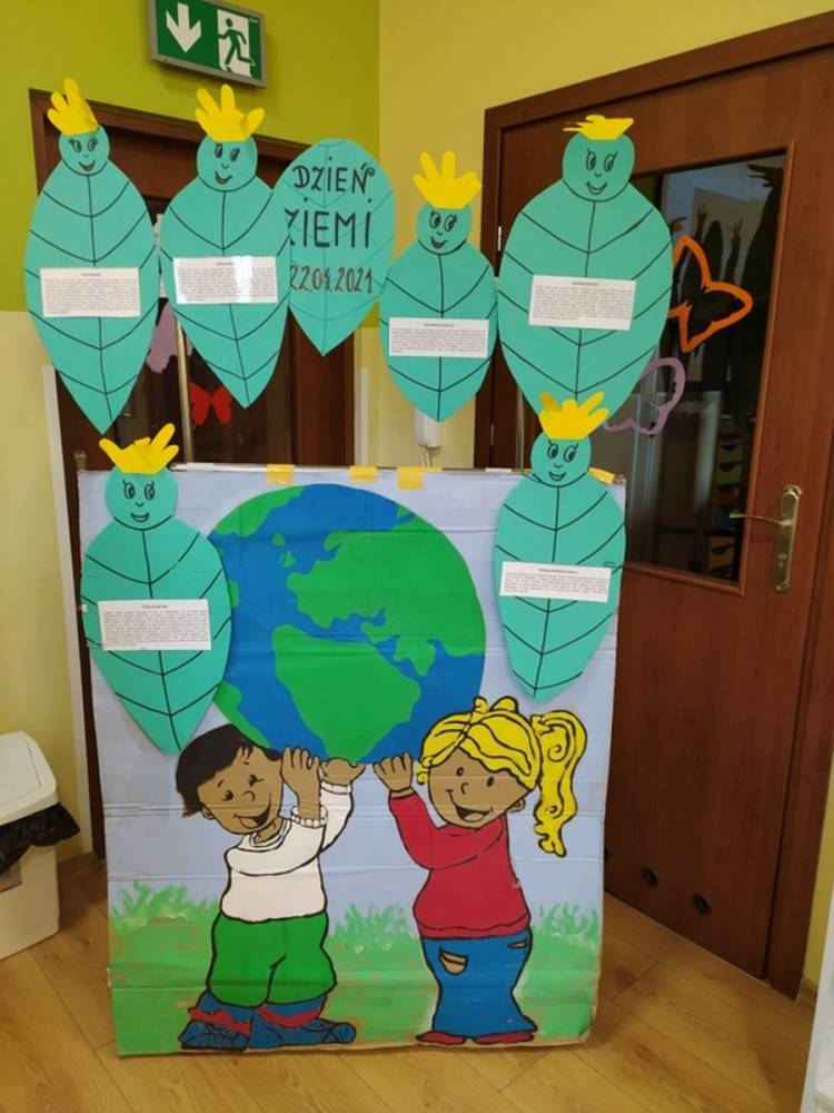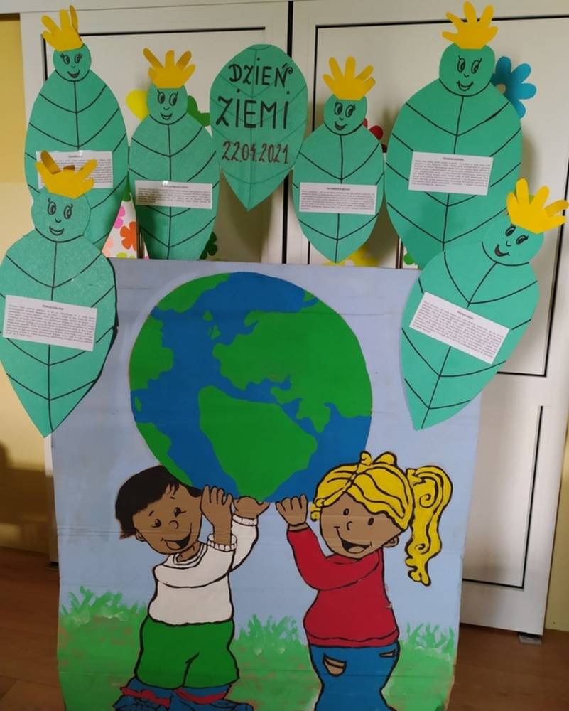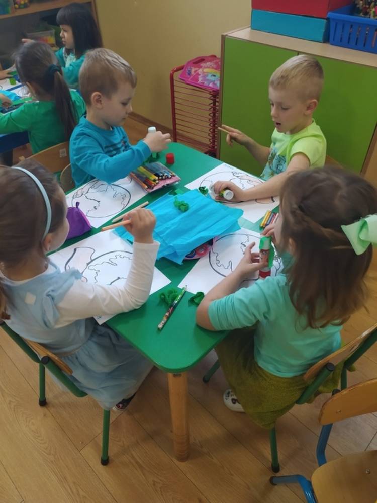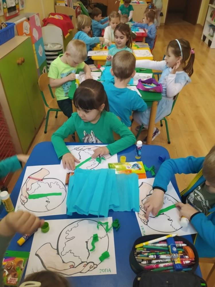 W dniu 22.04.2021 obchodziliśmy w przedszkolu Dzień Ziemi. Z tej okazji wszystkie dzieci przyszły ubrane w kolorach niebieskich i zielonych. Przed wejściem do przedszkola ustawiony został Eko- plakat zawierający cenne porady ekoludków. Na zajęciach dzieci poznały wszystkie zasady dotyczące ekologicznego sposobu życia. Obejrzały również bardzo wartościowy film ukazujący zagrożenia dla planety Ziemi i to, w jaki sposób nawet najmłodsze dzieci mogą się o nią troszczyć. Następnie dzieci z obu grup zagrały w planszową grę edukacyjną związaną z segregacją śmieci. Rywalizacja drużyn skończyła się remisem. Zwieńczeniem zajęć była praca plastyczna wyrażająca potrzebę dbania o naszą planetę Ziemię.
