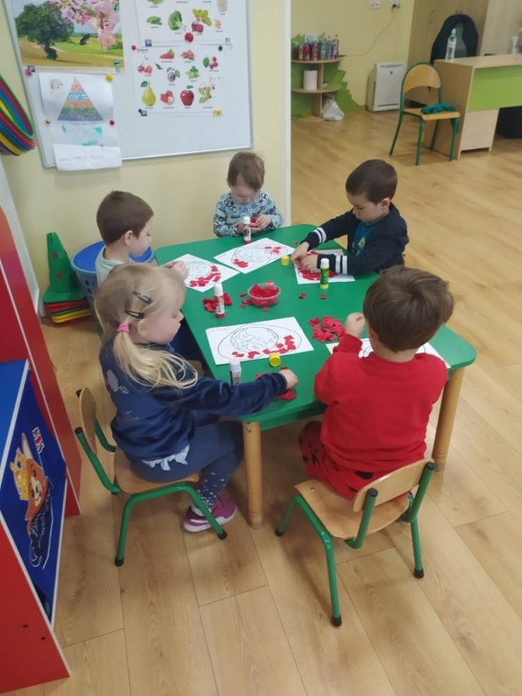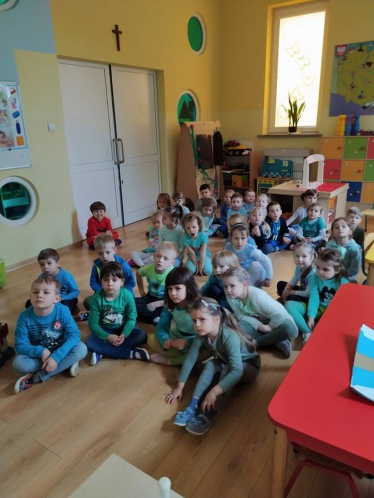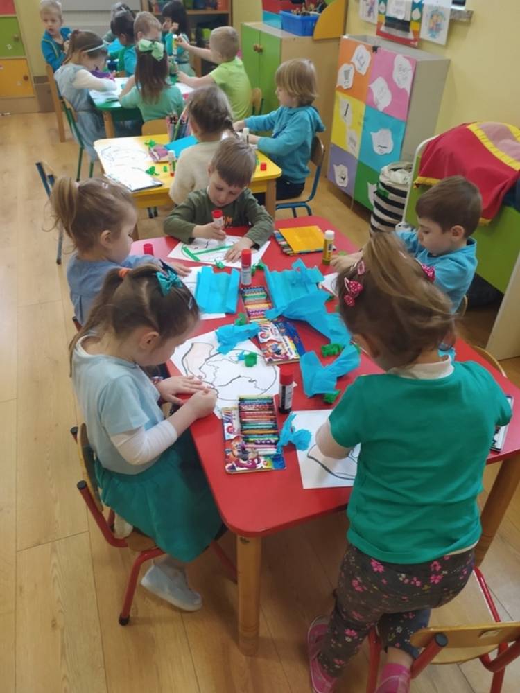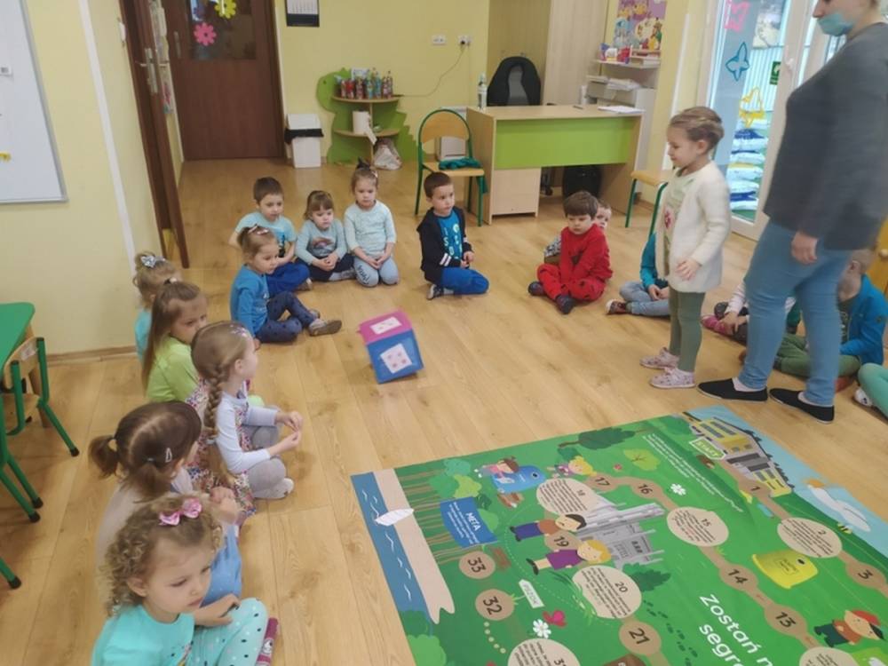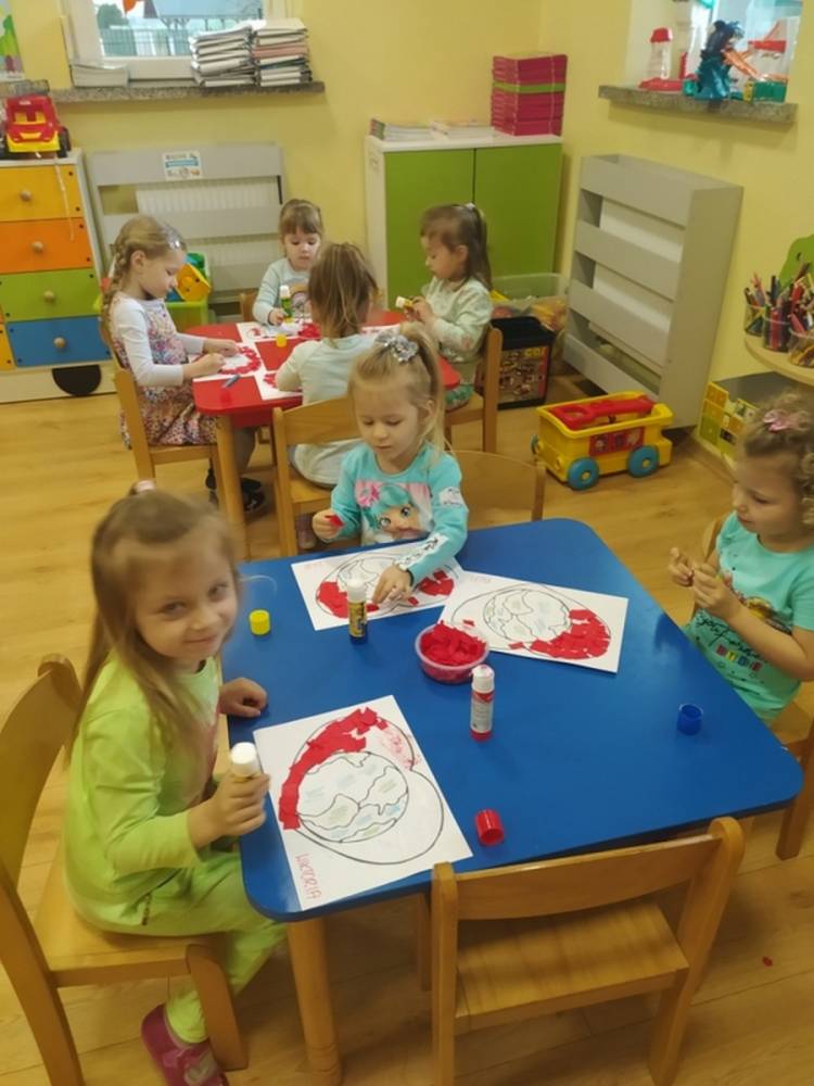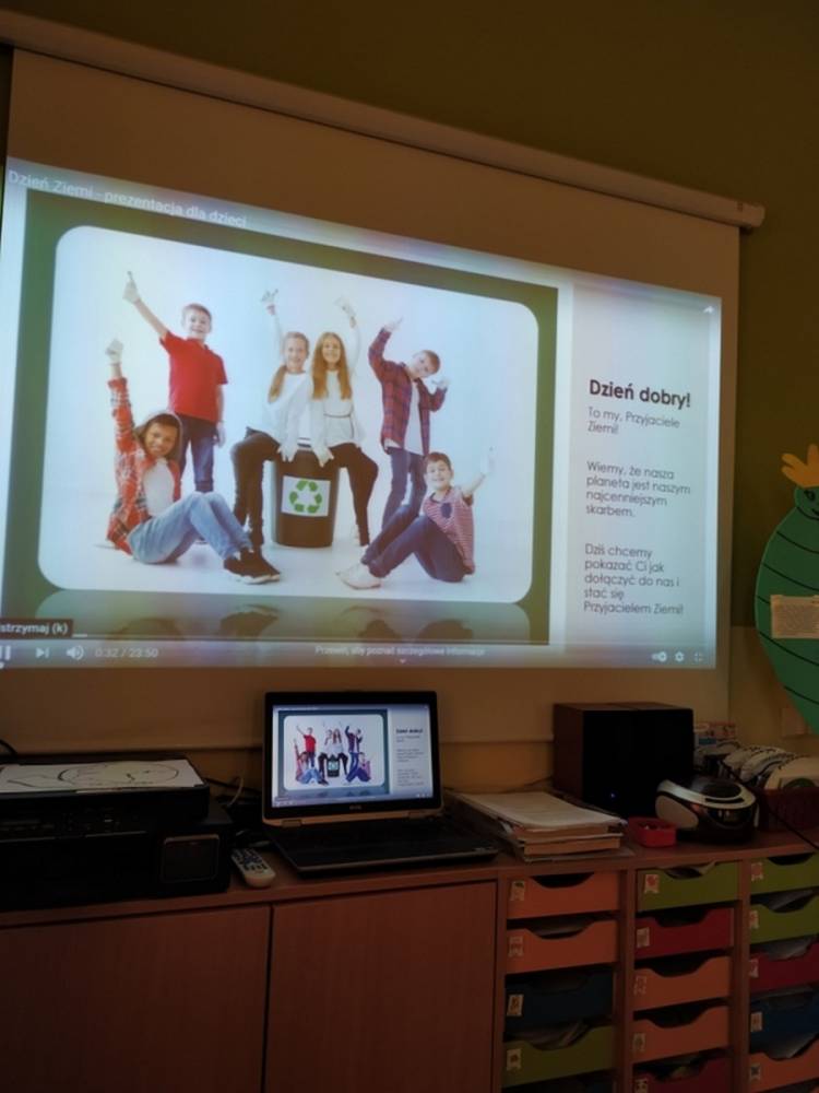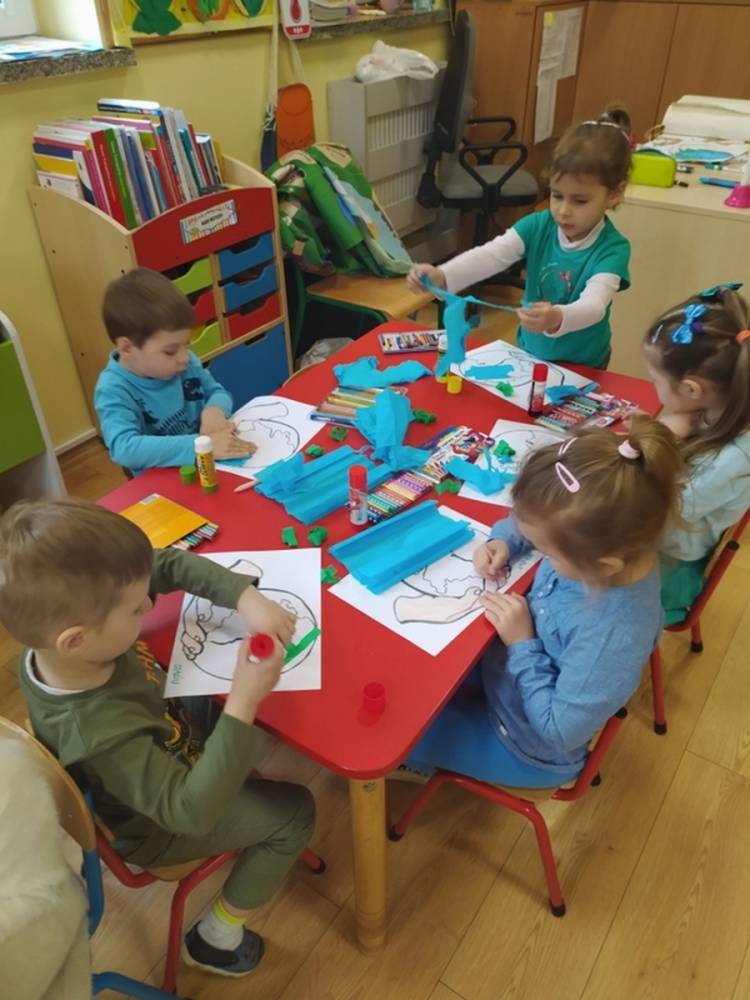 W dniu 22.04.2021 obchodziliśmy w przedszkolu Dzień Ziemi. Z tej okazji wszystkie dzieci przyszły ubrane w kolorach niebieskich i zielonych. Przed wejściem do przedszkola ustawiony został Eko- plakat zawierający cenne porady ekoludków. Na zajęciach dzieci poznały wszystkie zasady dotyczące ekologicznego sposobu życia. Obejrzały również bardzo wartościowy film ukazujący zagrożenia dla planety Ziemi i to, w jaki sposób nawet najmłodsze dzieci mogą się o nią troszczyć. Następnie dzieci z obu grup zagrały w planszową grę edukacyjną związaną z segregacją śmieci. Rywalizacja drużyn skończyła się remisem. Zwieńczeniem zajęć była praca plastyczna wyrażająca potrzebę dbania o naszą planetę Ziemię.