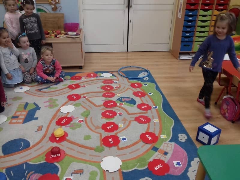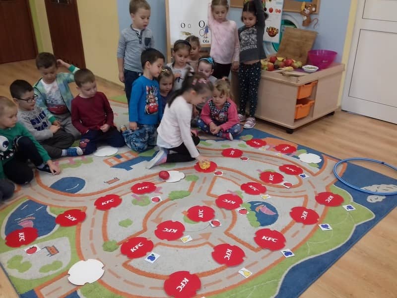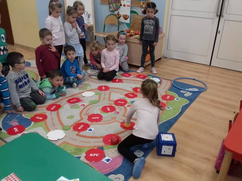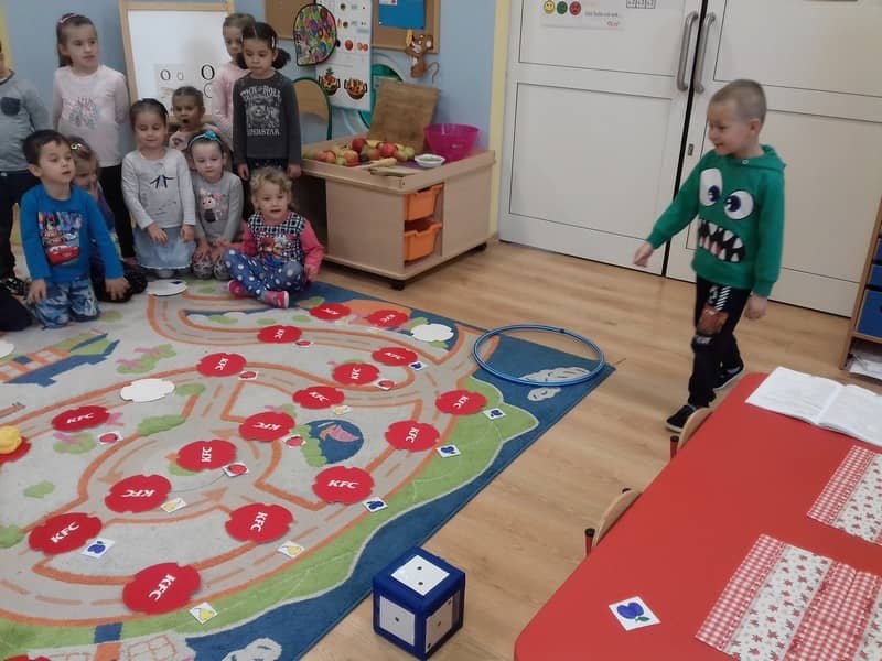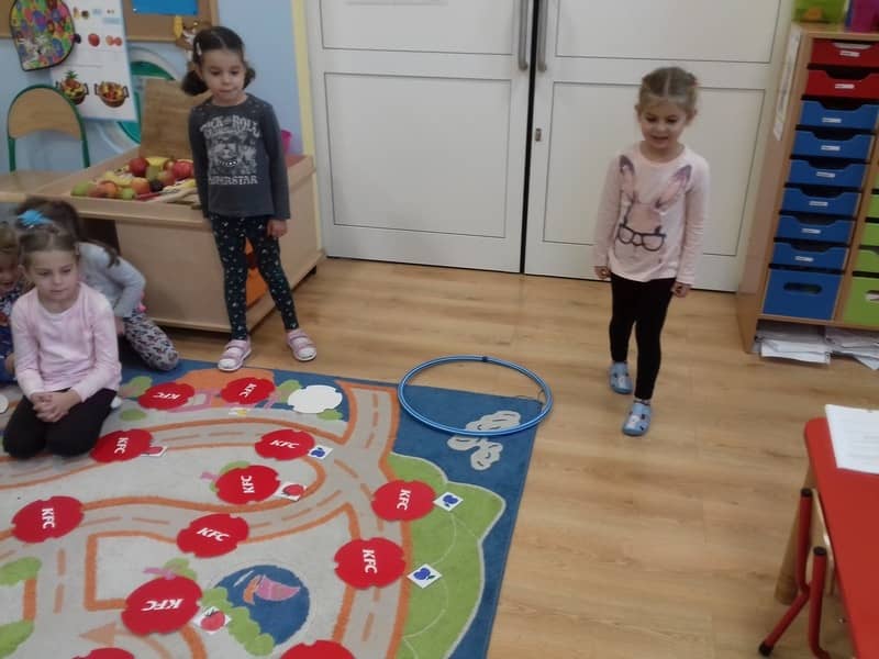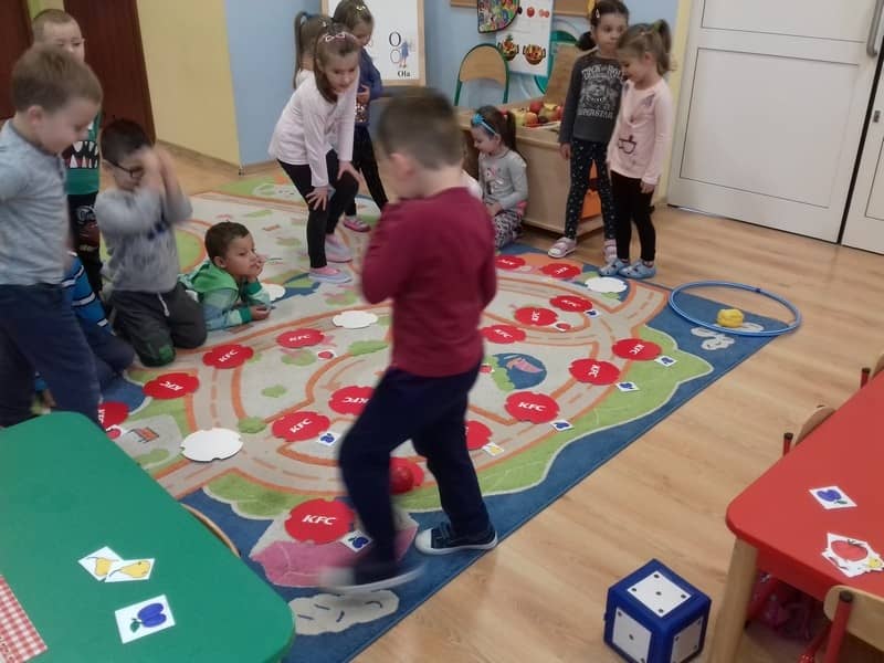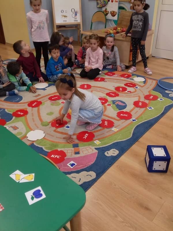 Przedszkolaki z grupy Pracowitych Pszczółek brały udział w grze matematycznej, z podziałem na dwie drużyny - dziewczynki i chłopcy. Zadaniem każdej grupy było zebrać jak najwięcej owoców. Kolejno każdy z grupy rzucał kostką, poruszał "owocowy" pionek na polach i zdobywał owoc dla drużyny. Pola jasne oznaczały utratę jednego owocu. Wygrały Dziewczynki, a drużyna Chłopców gratulowała zwycięzcy...